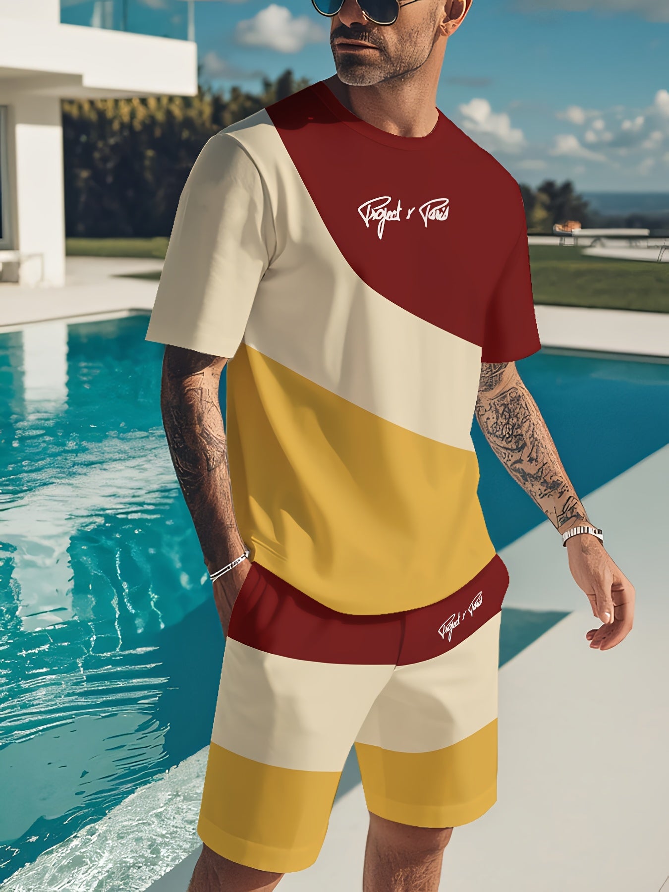 Summer New Round Neck Short Sleeve T-Shirt Set, 3-Color Patchwork Pattern, Front Chest Fashion Letter, Casual Style, Simple Matching Outfit Suitable for Date Night