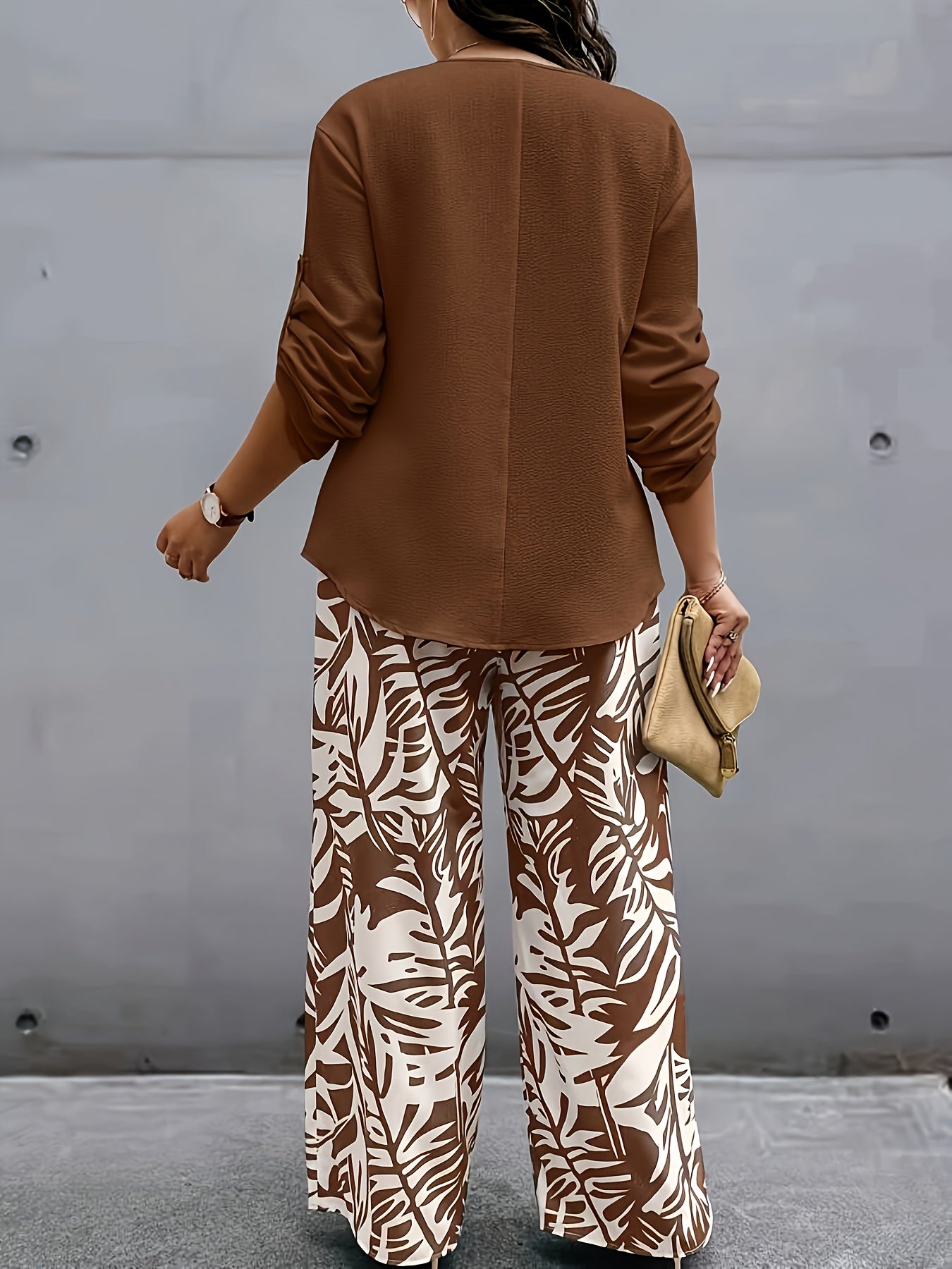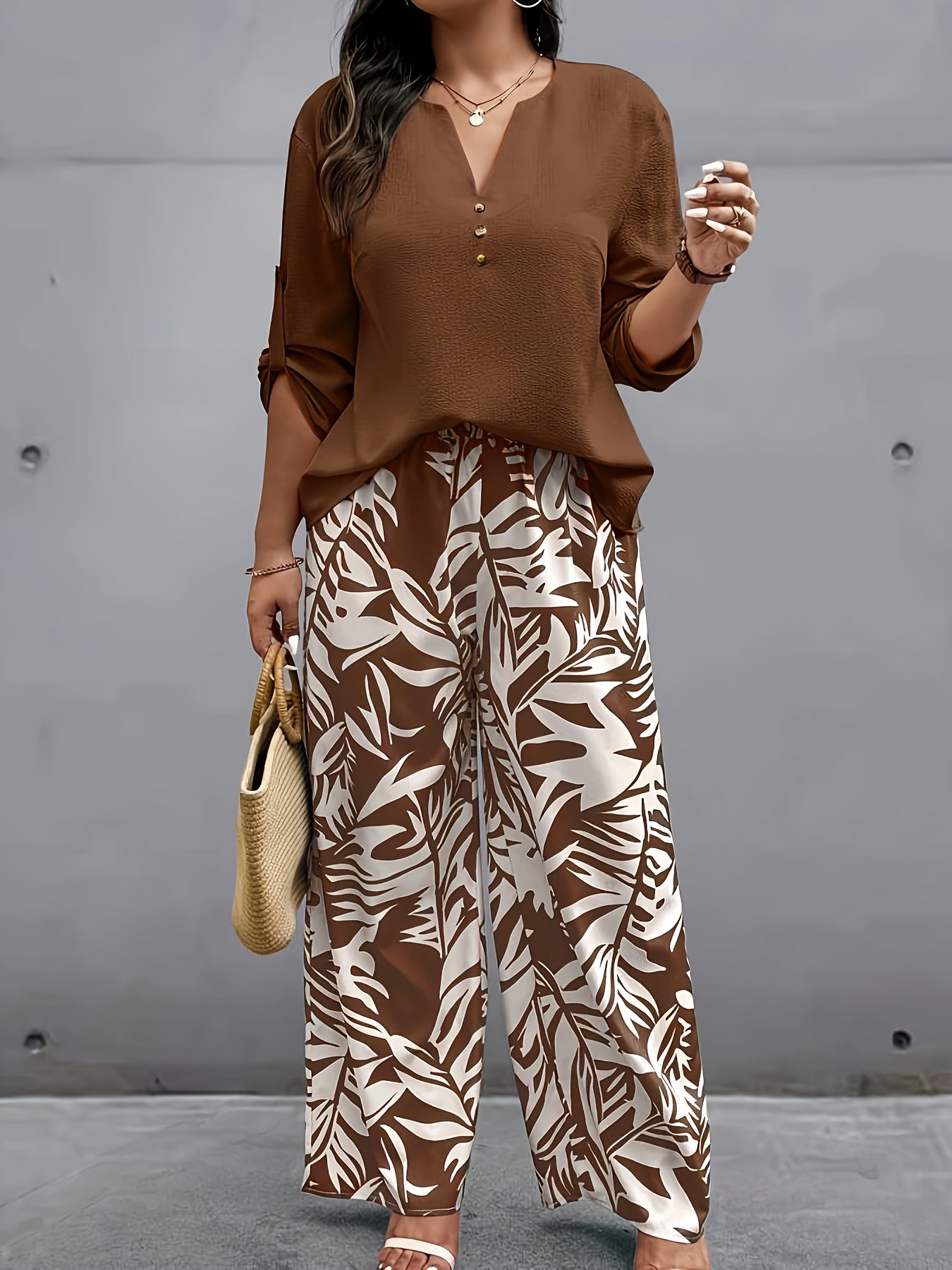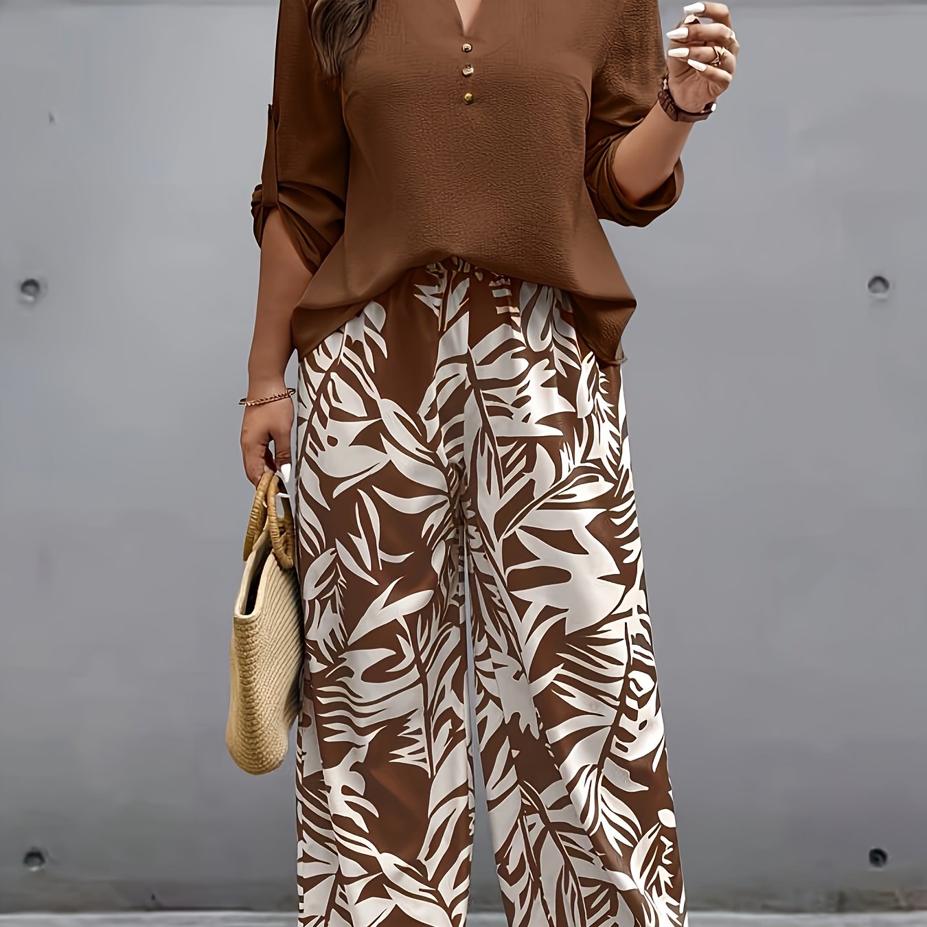 Summer Women's Fashionable New Short-Sleeve Pullover V-Neck Solid Color Top with Plant Print Wide-Leg Pants Two-Piece Set