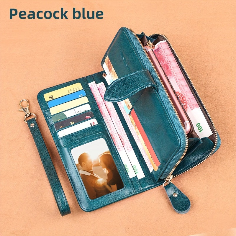 Two-Layer Cowhide Leather Clutch Wallet for Men & Women, Casual Large Capacity RFID Blocking Zippered Hand Purse with Transparent ID Slot and Anti-Theft Brush, Versatile for Going Out