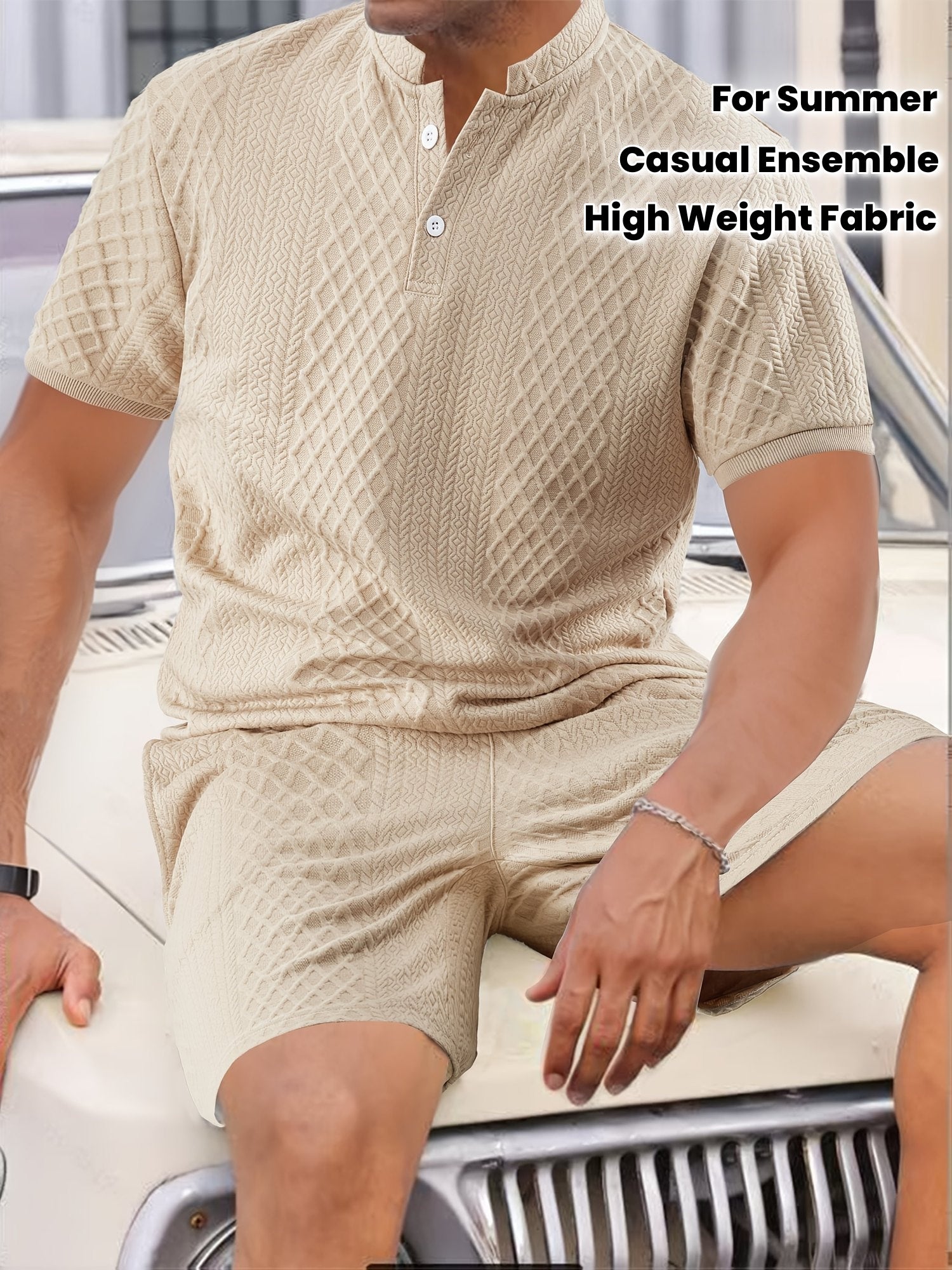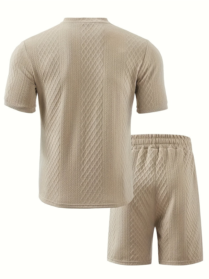 Two-Piece Set, Men'S Summer Outfit, Jacquard Set, Round Neck Short Sleeve, Drawstring Shorts, High Weight Fabric, Casual Ensemble.