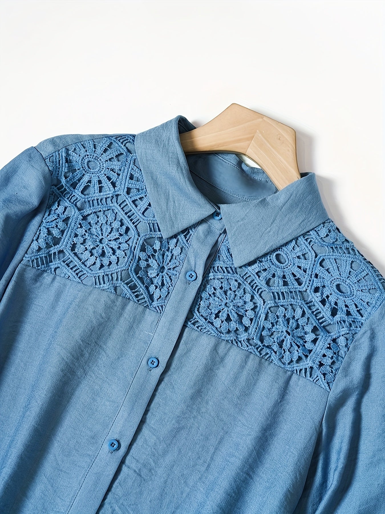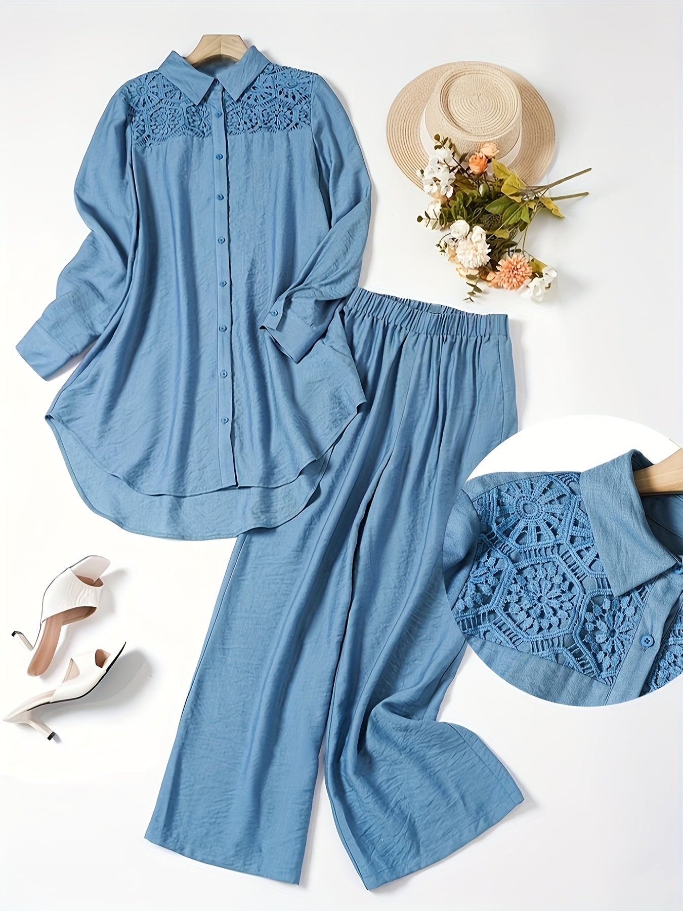 Two-Piece Women'S Solid Color Long Sleeve Shirt and Pants, Minimalist Everyday Casual Fashion Set [NS702], Polyester, Contrast Lace Detail, Elegant Style, for Spring/Summer