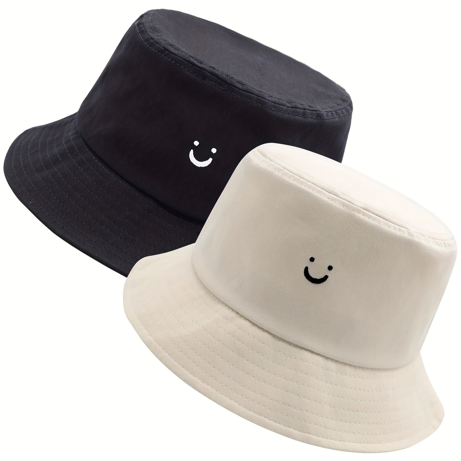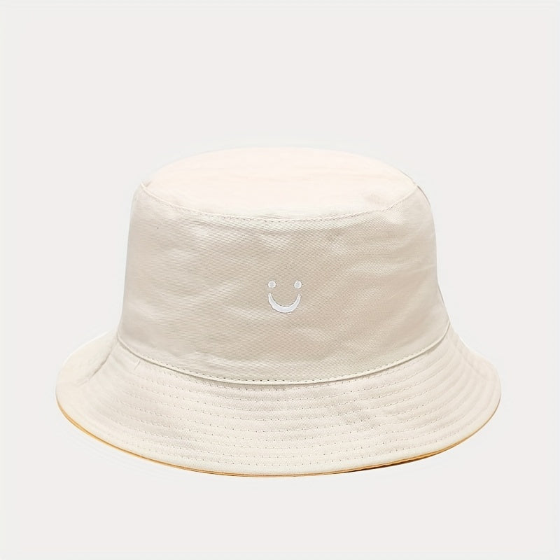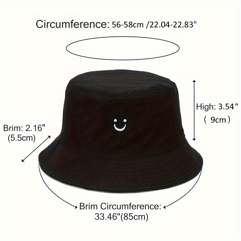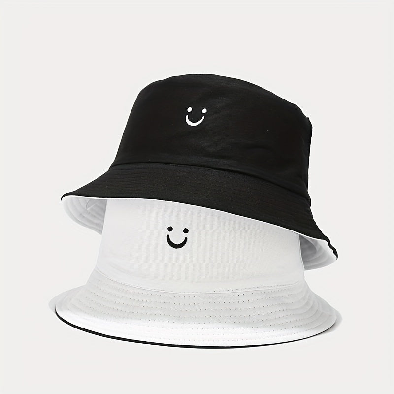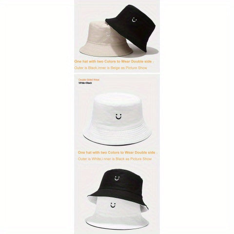 Unisex Black & White Fisherman Hat with joyful Face Embroidery - Double-Sided, Sporty Polyester Bucket Hat for Men and Women, Ideal for Outdoor Activities, Outdoor Hat | joyful Face Embroidery | Durable Headgear