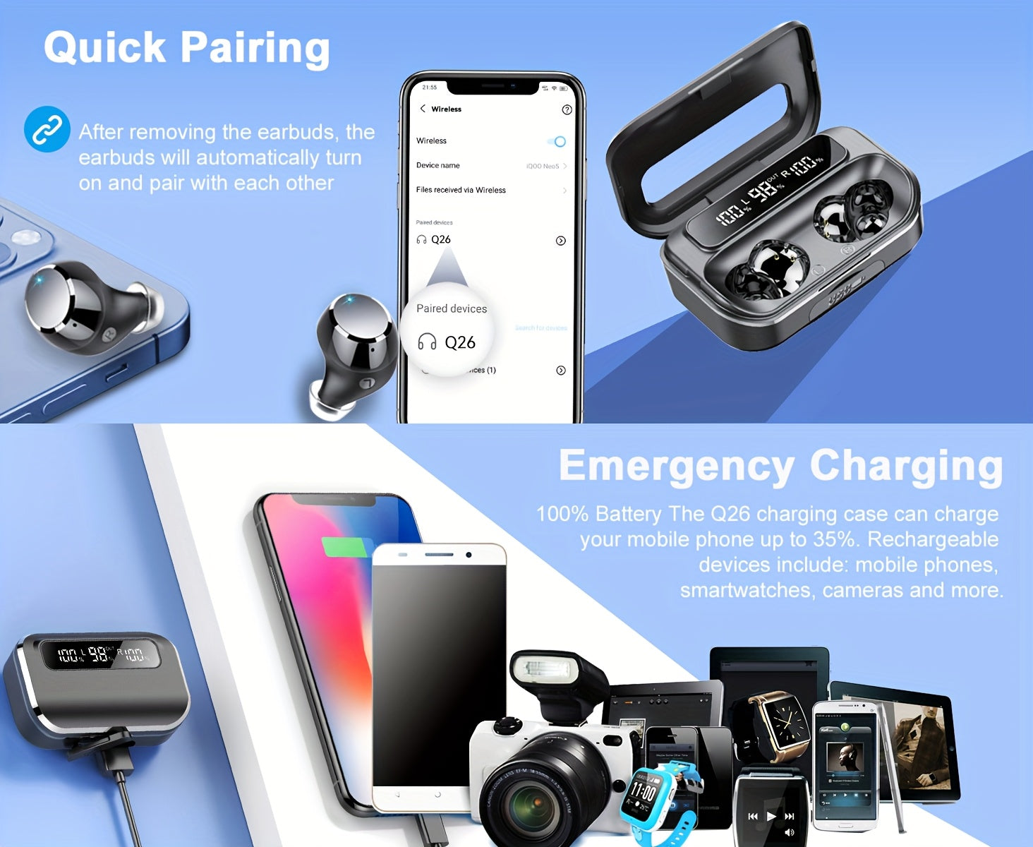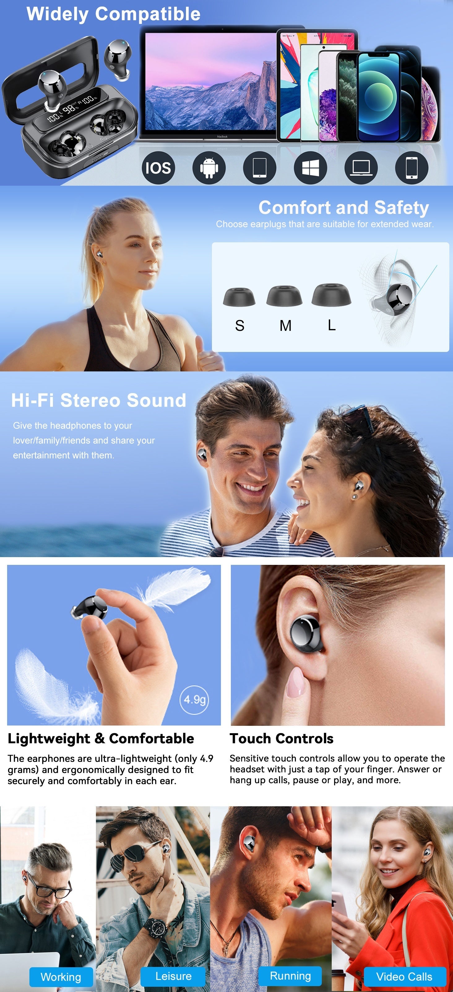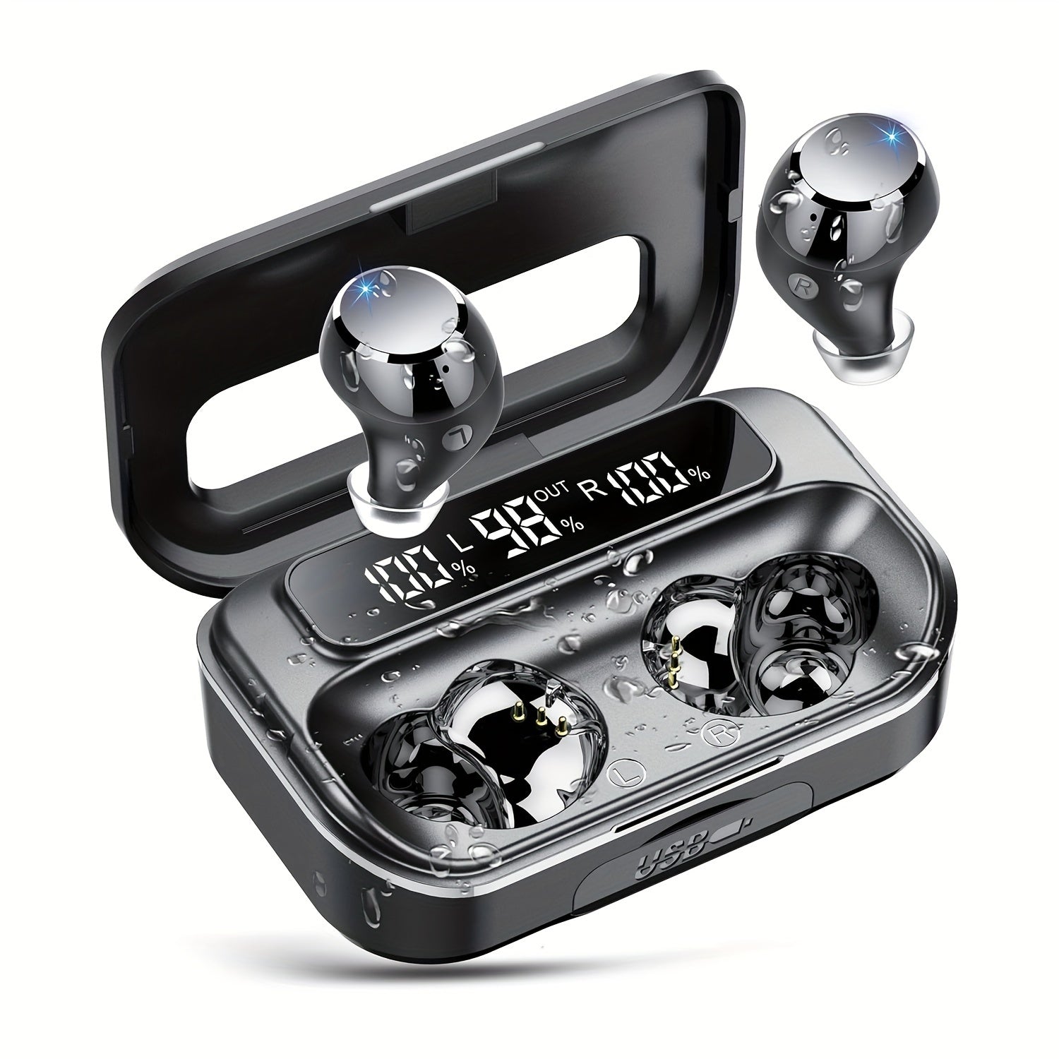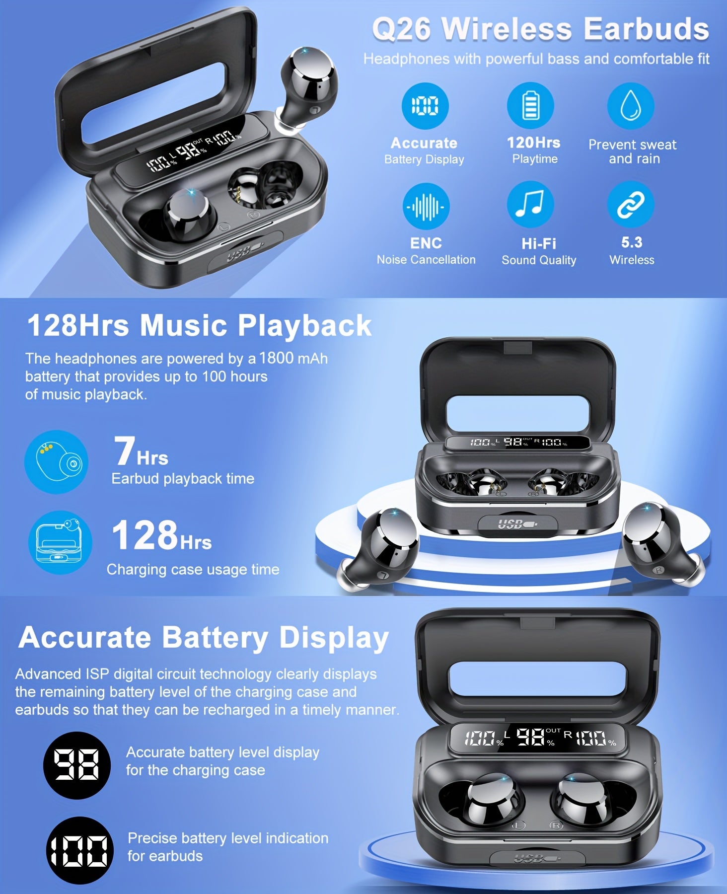 Wireless Earphones 5.3 True Wireless Earbuds with 120H Playback, LED Power Display, Wireless Charging Case, Microphone for TV, Smartphone, Laptop, Sports