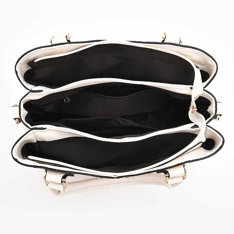 Wo 's Casual Geometric Two-Tone Large Capacity Handbag with Adjustable Strap, Detachable Wristlet & Zipper Closure - in Khaki/White/Pink/Red/Green/Black, Travel Accessory, Stylish Accessory, Durable Construction, Spacious