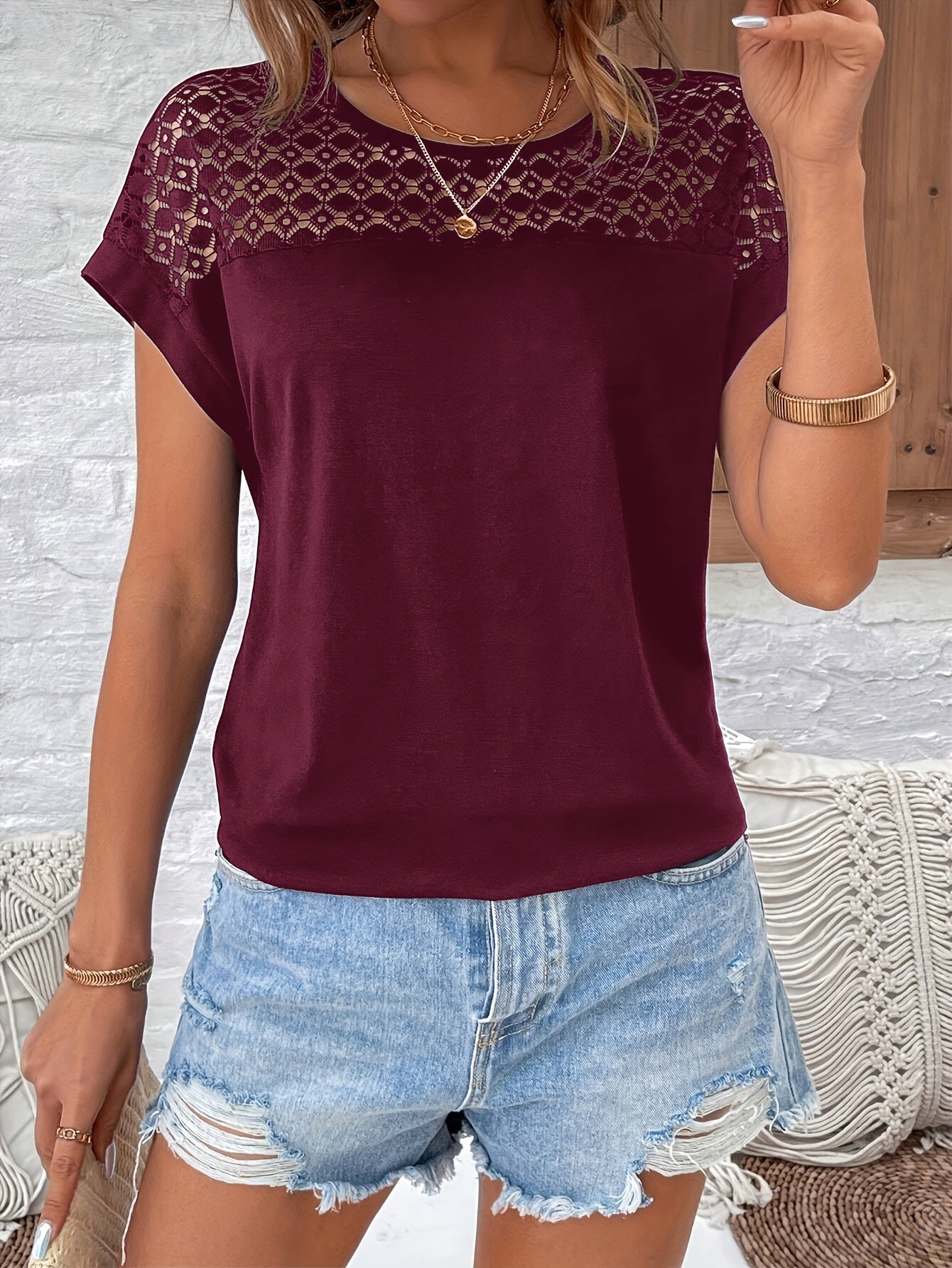 Women's Batwing Short Sleeve T-Shirt - Lace Contrast Raglan Sleeves, Round Neck Longline Top, Burgundy & White Elegant Design, Machine Washable All-Season Casual Wear, Vacation Clothing, Nontransparent Fabric