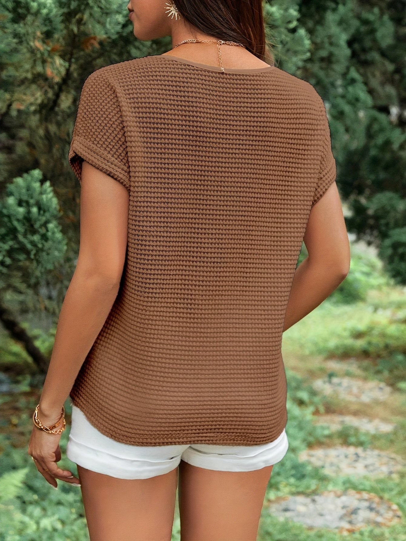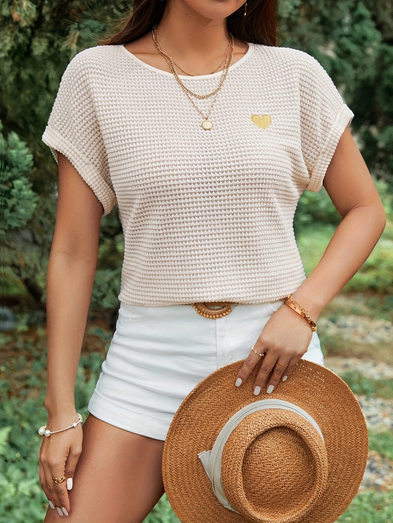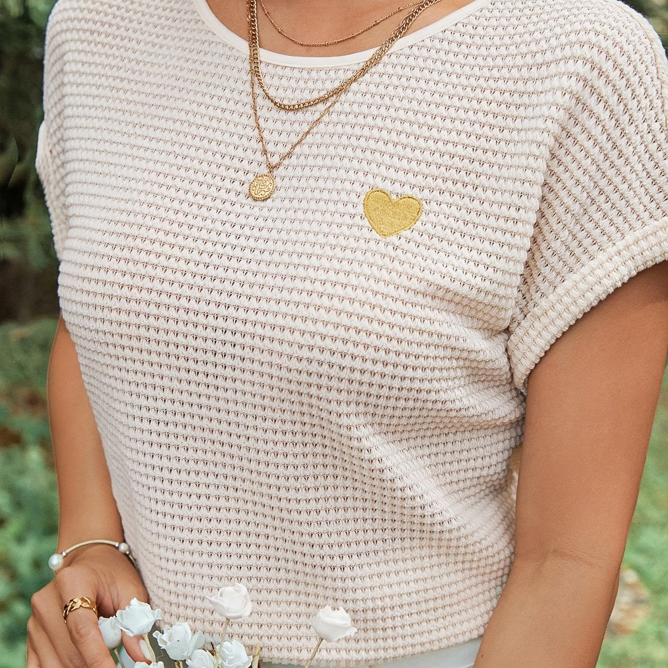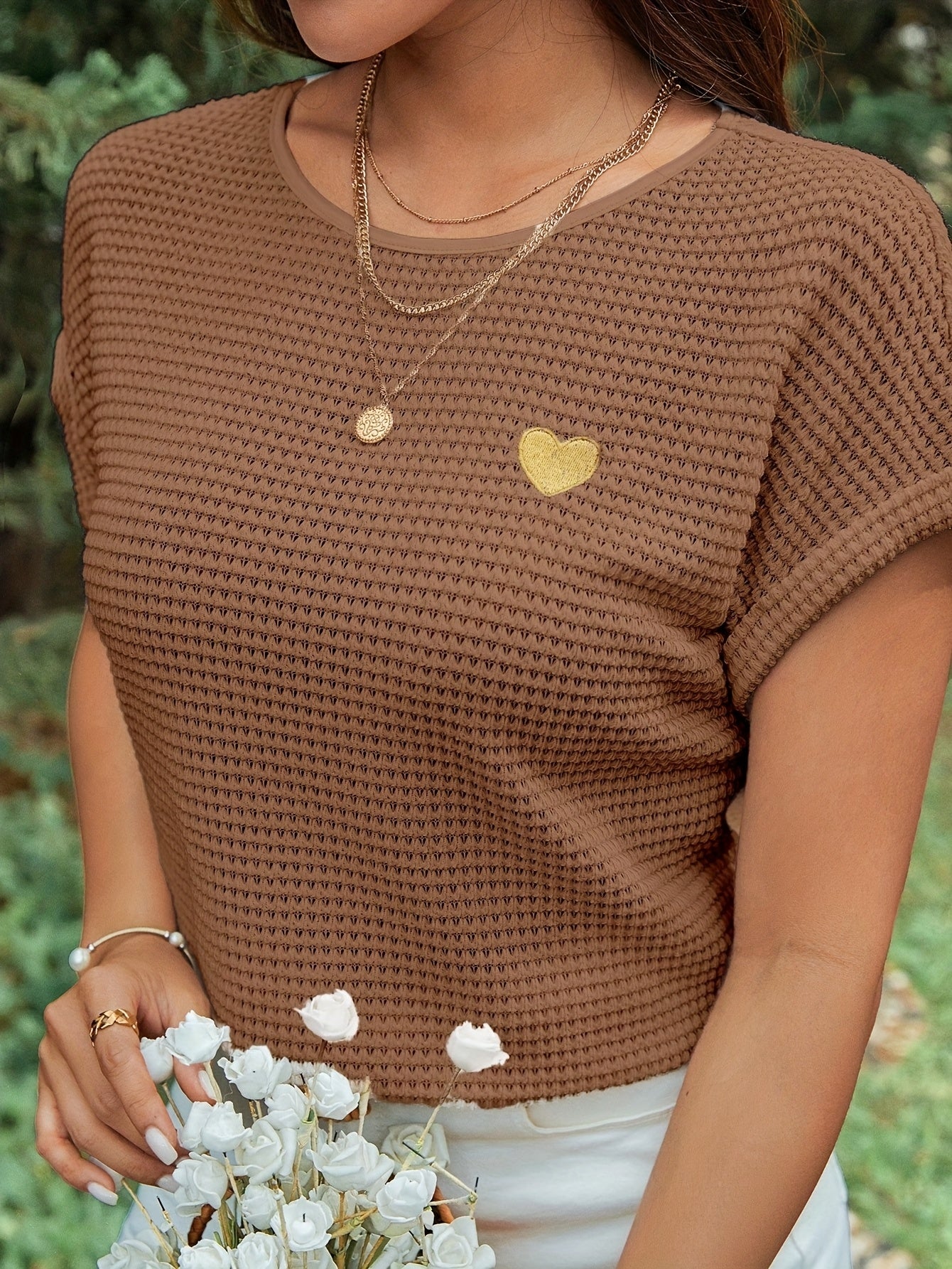 Women'S Black Knit Short Sleeve Top with Golden Heart Design - Casual Crew Neck, Spring/Summer Fashion, Casual Wear|Crew Neck Top|Knit Texture