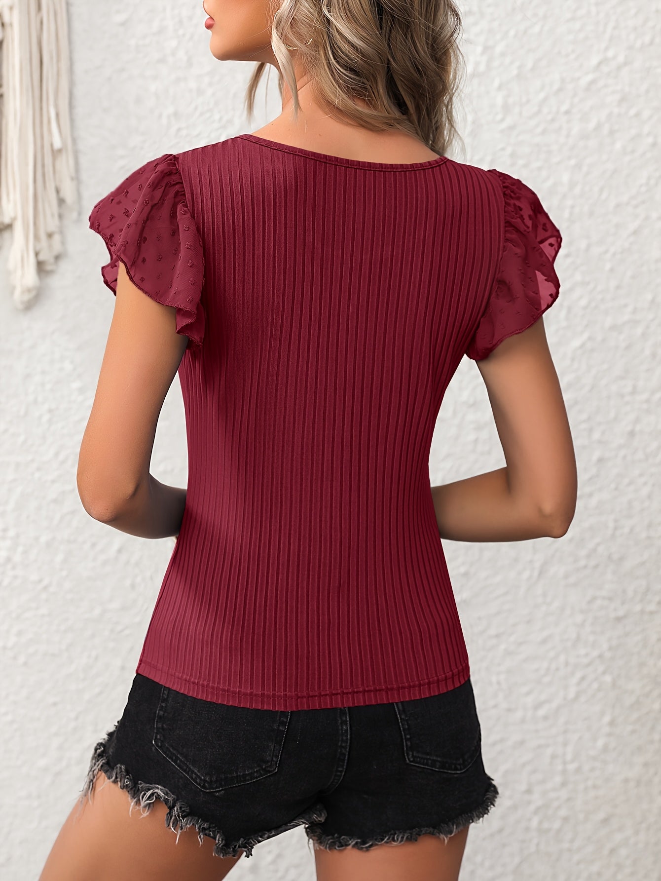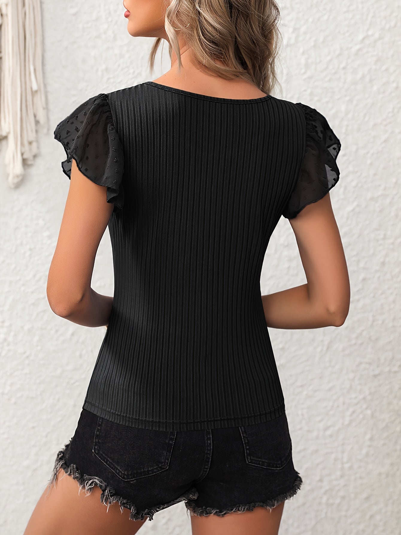 Women's Black Mesh Panel Puff Sleeve Round Neck T-Shirt - High Elasticity Breathable Top for Spring Summer Fall, Casual & Formal Wear, Seasonal Wardrobe Staple, Elegant Blouse, Stretchy Material, Stylish Blouse, Office Attire