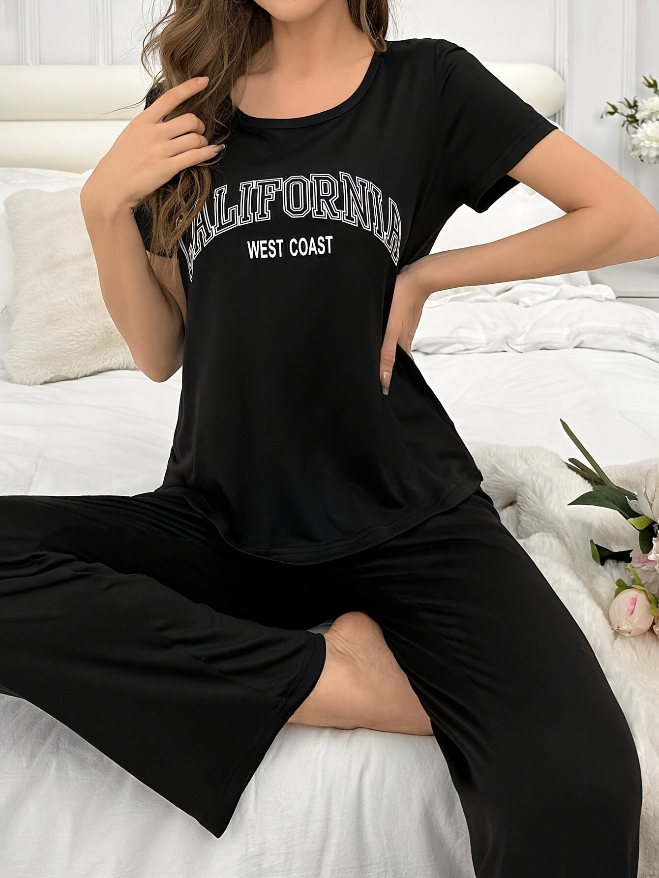 Women'S California West Coast Slogan Printed Pajama Set, Casual Crew Neck Short Sleeve Top and Pants, Polyester Knit Fabric, All Season Comfort Wear, 95% Polyester 5% Elastane, 140gsm