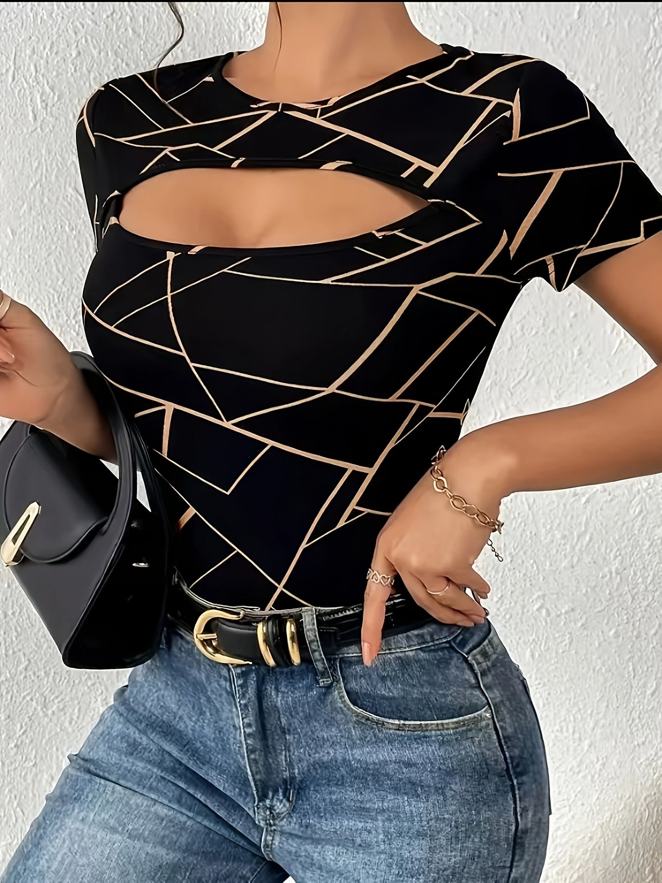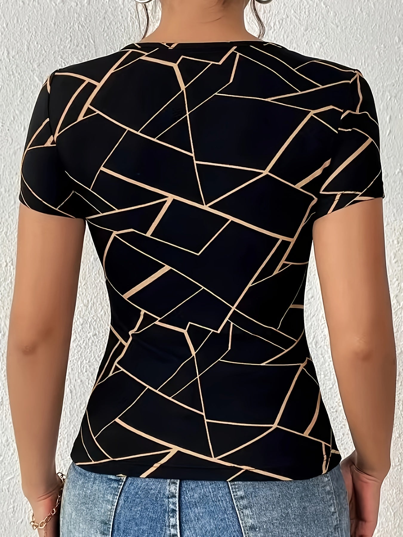 Women's Casual Geometric Diamond Pattern Off-Shoulder T-Shirt - Black & Golden Contrast, Lightweight Breathable Fabric, Machine Washable Spring Summer Tops, Ladies T-shirts, Trendy Outfit, Elegant Neckline, Contrast Detailing