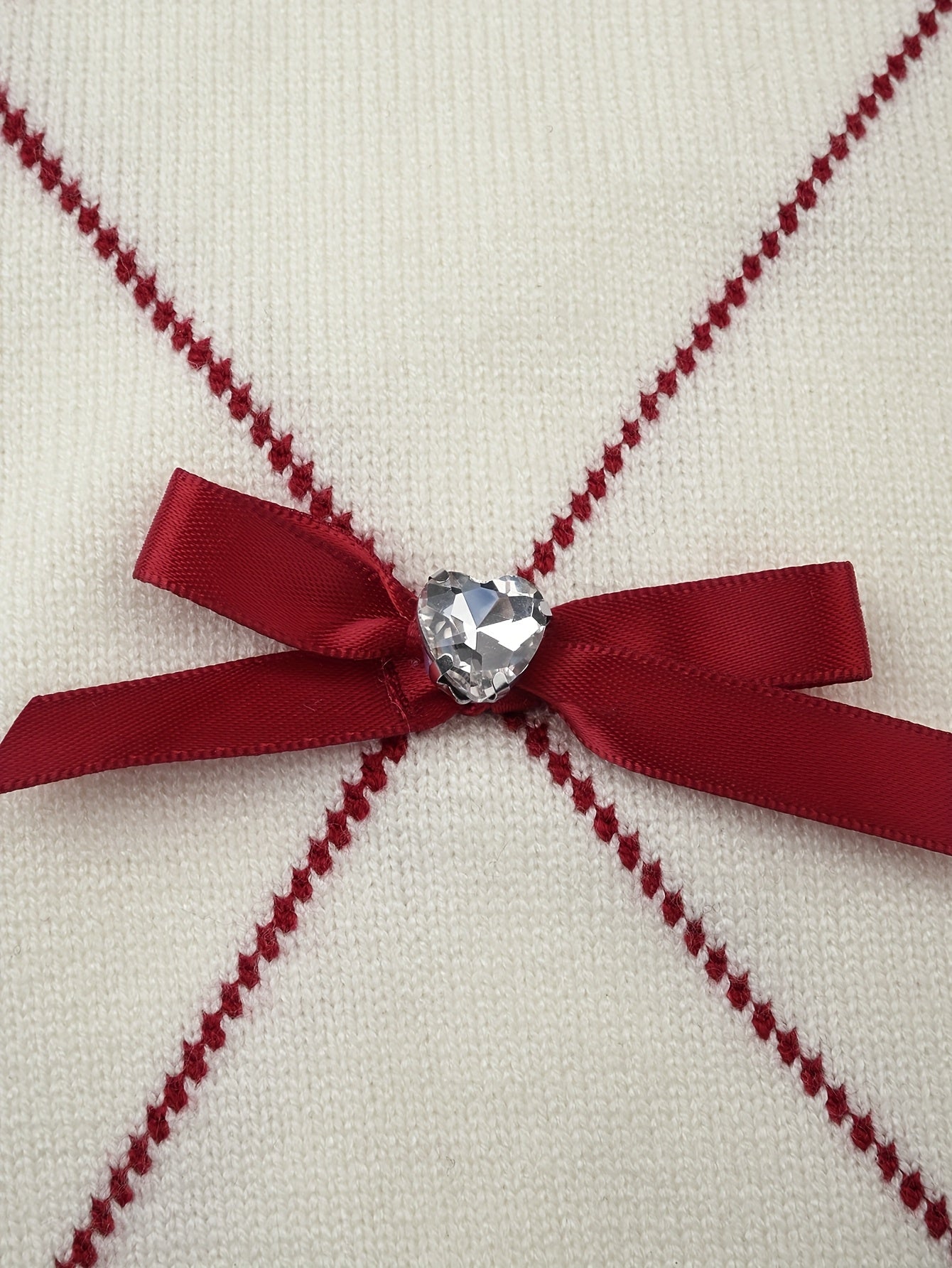 Women'S Casual Geometric Pattern Vest with Red Bow Detail - & Red Color Block Design, Round Neck, Long Sleeve, All-Season Layering Piece, Casual Wear, |geometric Pattern Vest|sleeve Vest, Sweater Vest