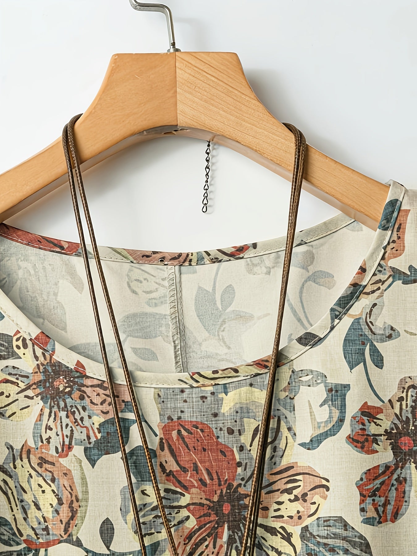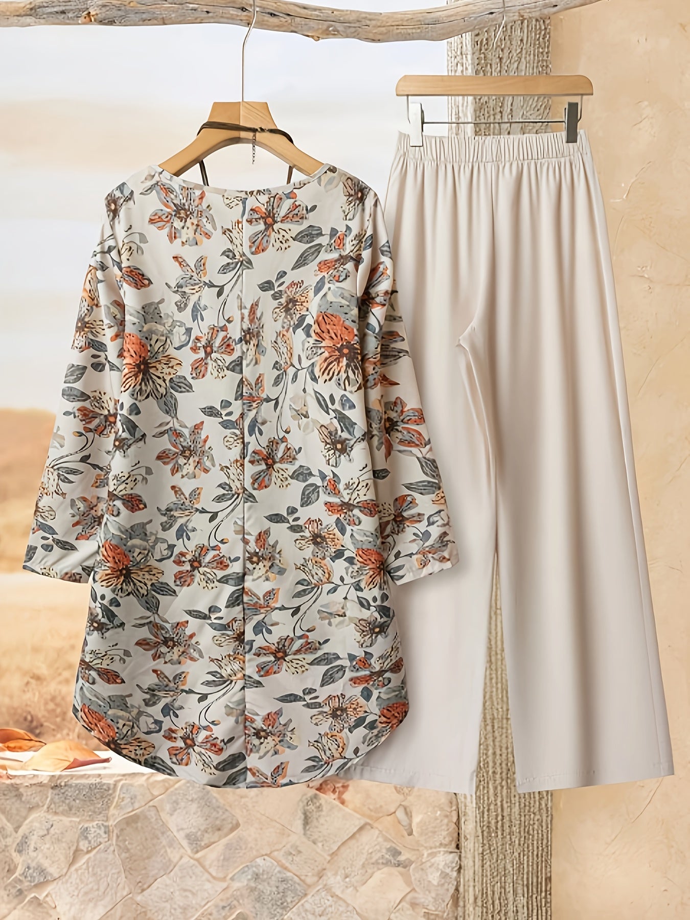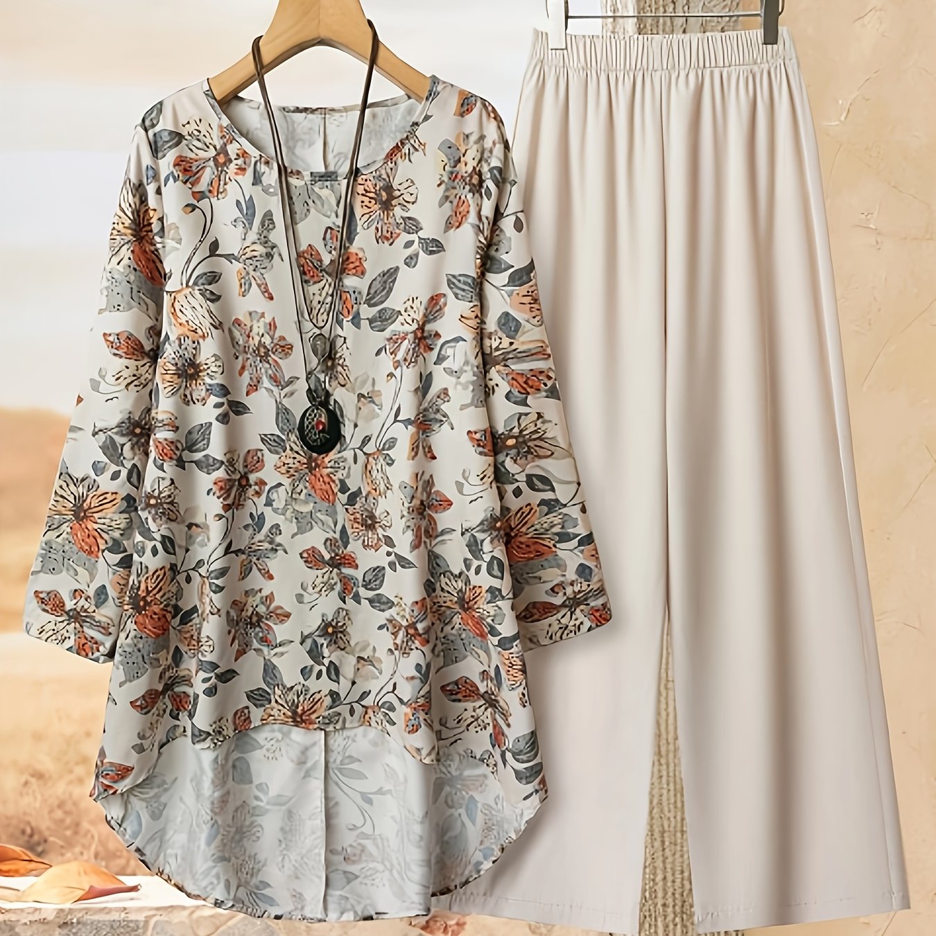 Women's Casual Round Neck Printed Long Sleeve Top and Solid Color Pants Two-Piece Set