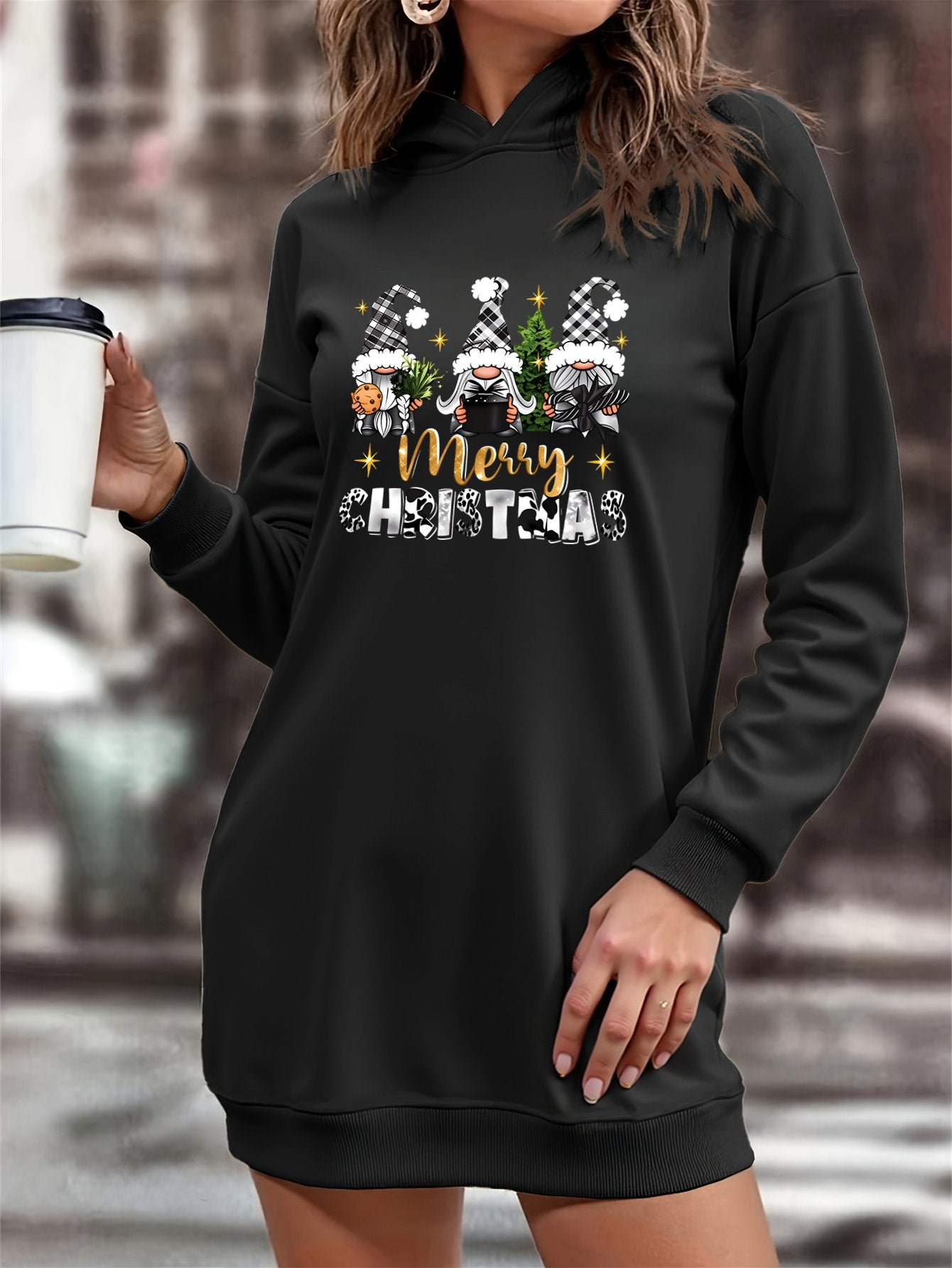 Women's Christmas Gnome Print Hooded Sweatshirt Dress - Soft Slim Fit Sweater Dress with Holiday Cheer Gnome Patterns, All-Season Casual Dress for Christmas Party Outfits (Machine Washable)