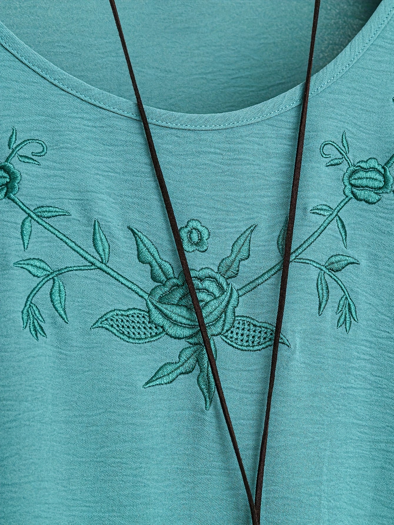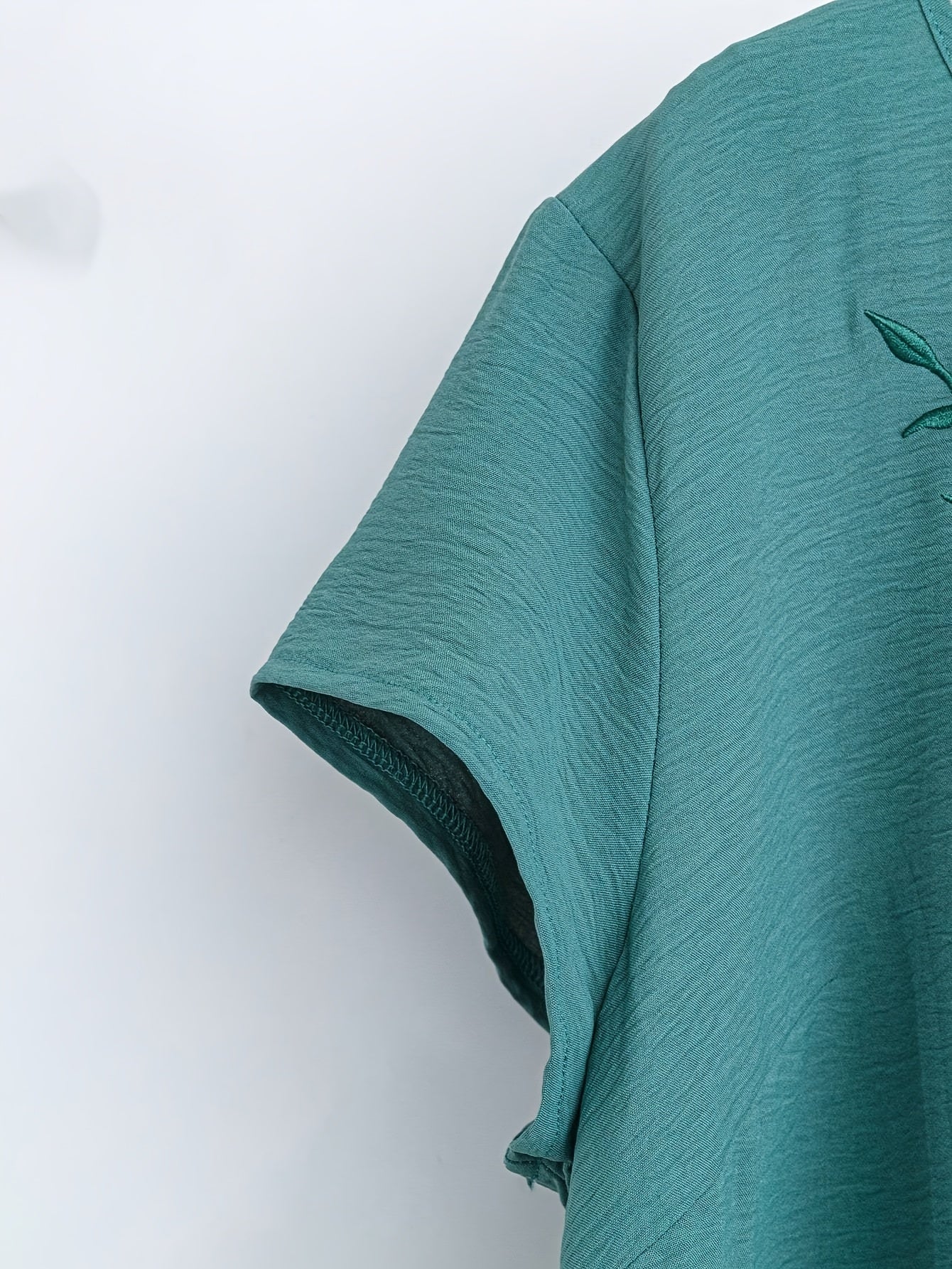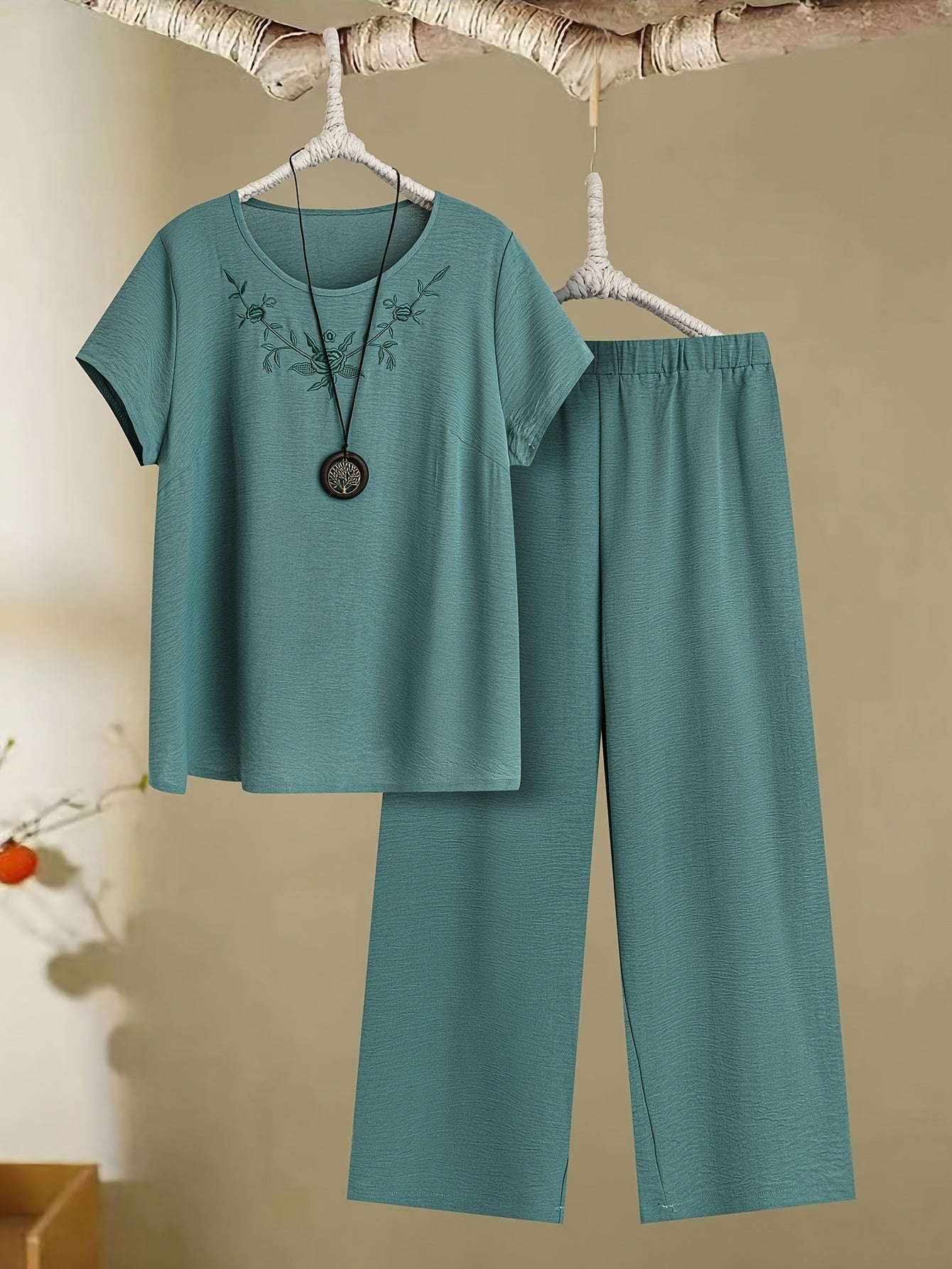 Women'S Comfortable Embroidered Short Sleeve T-Shirt and Pants Set - Casual Crew Neck, Straight Leg, Solid Color with Floral Design, Polyester Blend, Spring/Summer Collection
