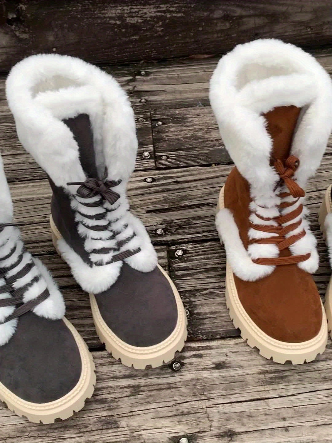 Women's Cozy Fleece-Lined Winter Boots - Mid-Calf Lace-Up with Thick Faux Fur Trim, Round Toe & Chunky Heel in Brown or Black, Perfect for Cold Weather Comfort, Winter Boots