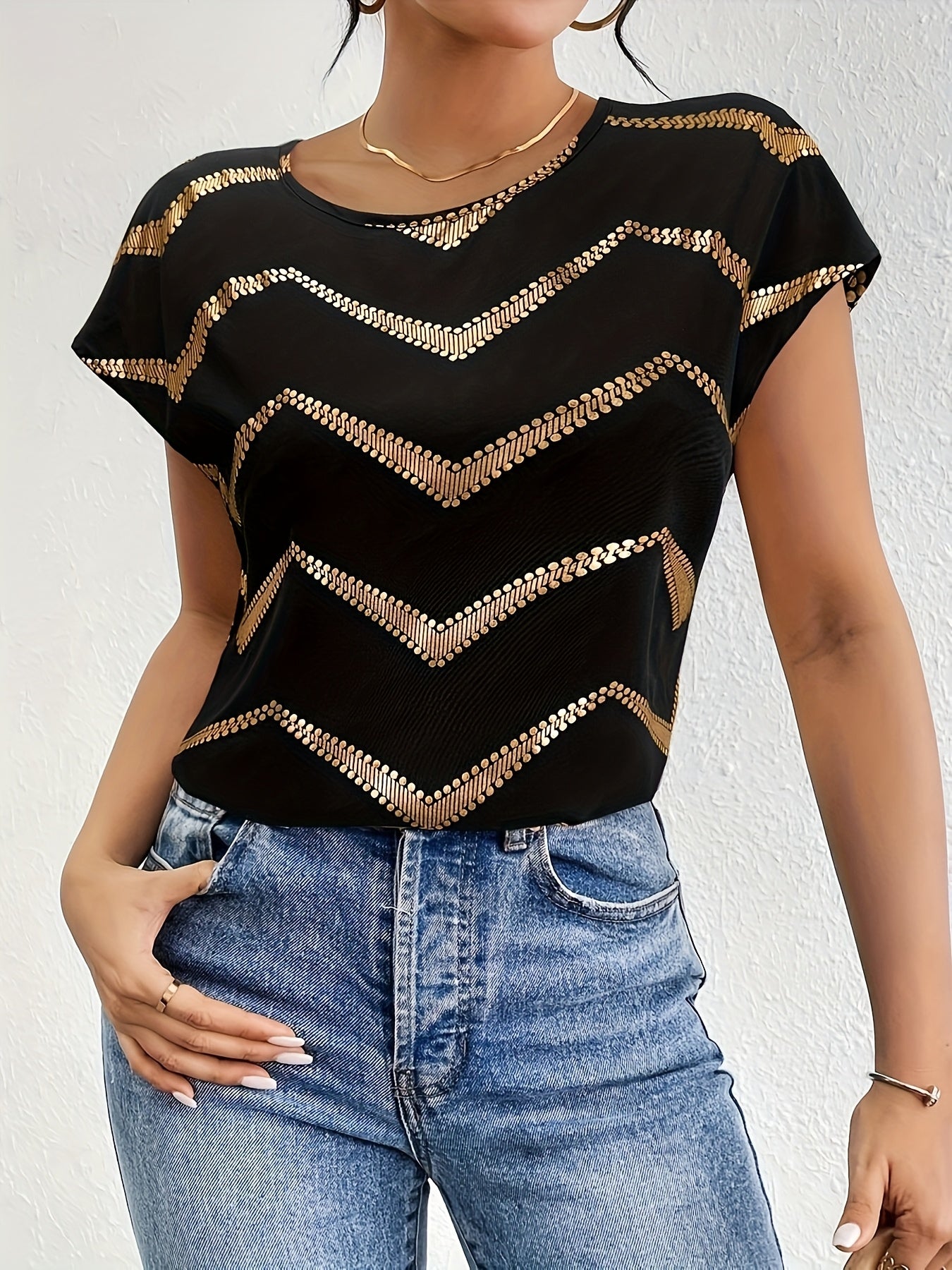 Women's Elegant Batwing T-Shirt - Black with Golden Geometric Print, Stretchy Polyester-Spandex Blend, Round Neck Casual Top for Spring Summer Fall, Machine Washable for Parties Dates Casual Attire