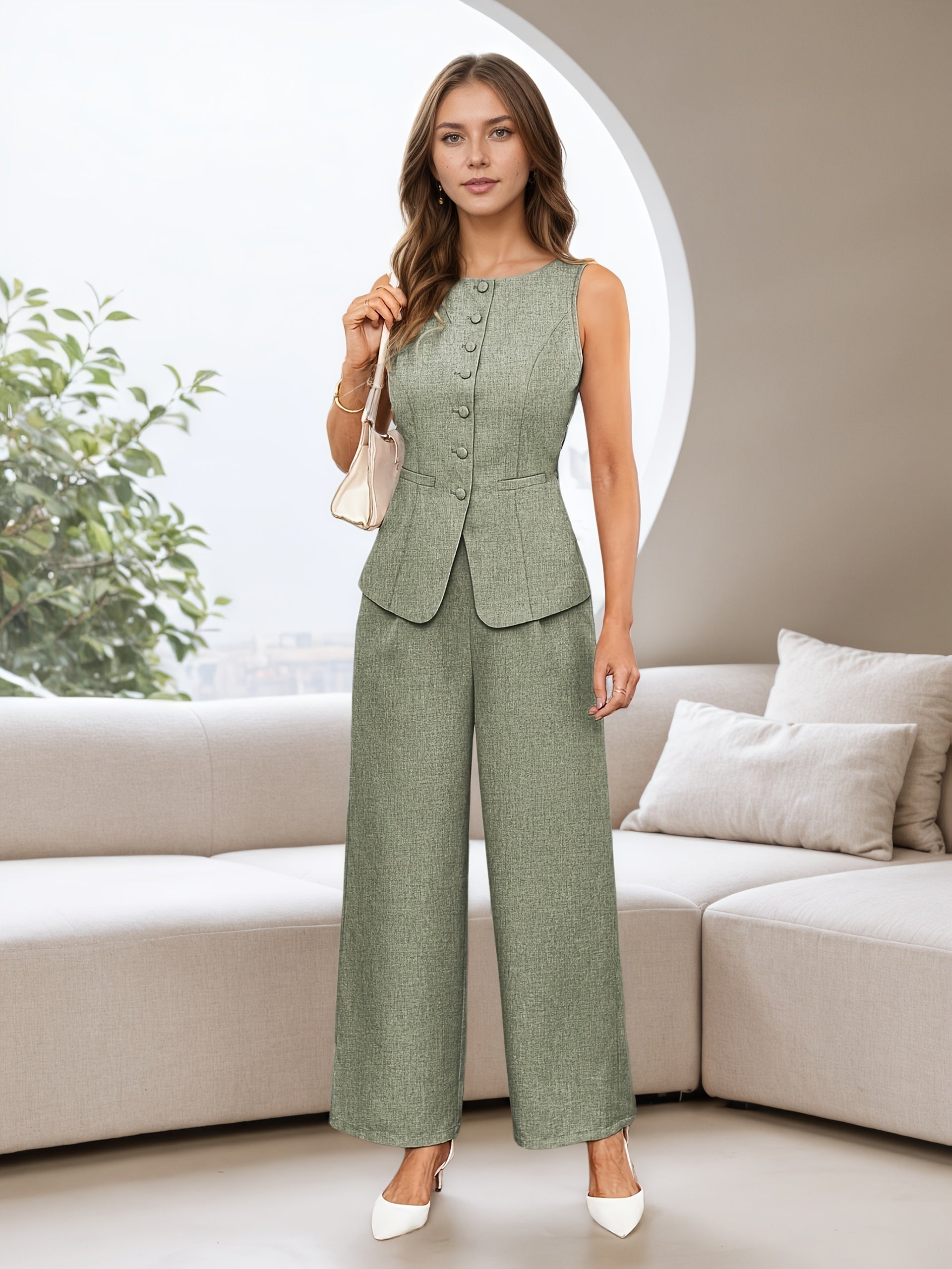Women'S Elegant Beige Two-Piece Suit with V-Neck, Sleeveless Blazer & Wide-Leg Pants - Breathable Polyester, Button-Up Design, Perfect for Office or Casual Wear, Spring/Summer Collection, Casual Attire|Sophisticated Style|Pol