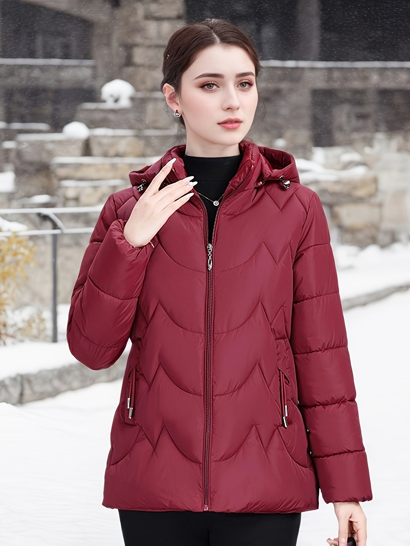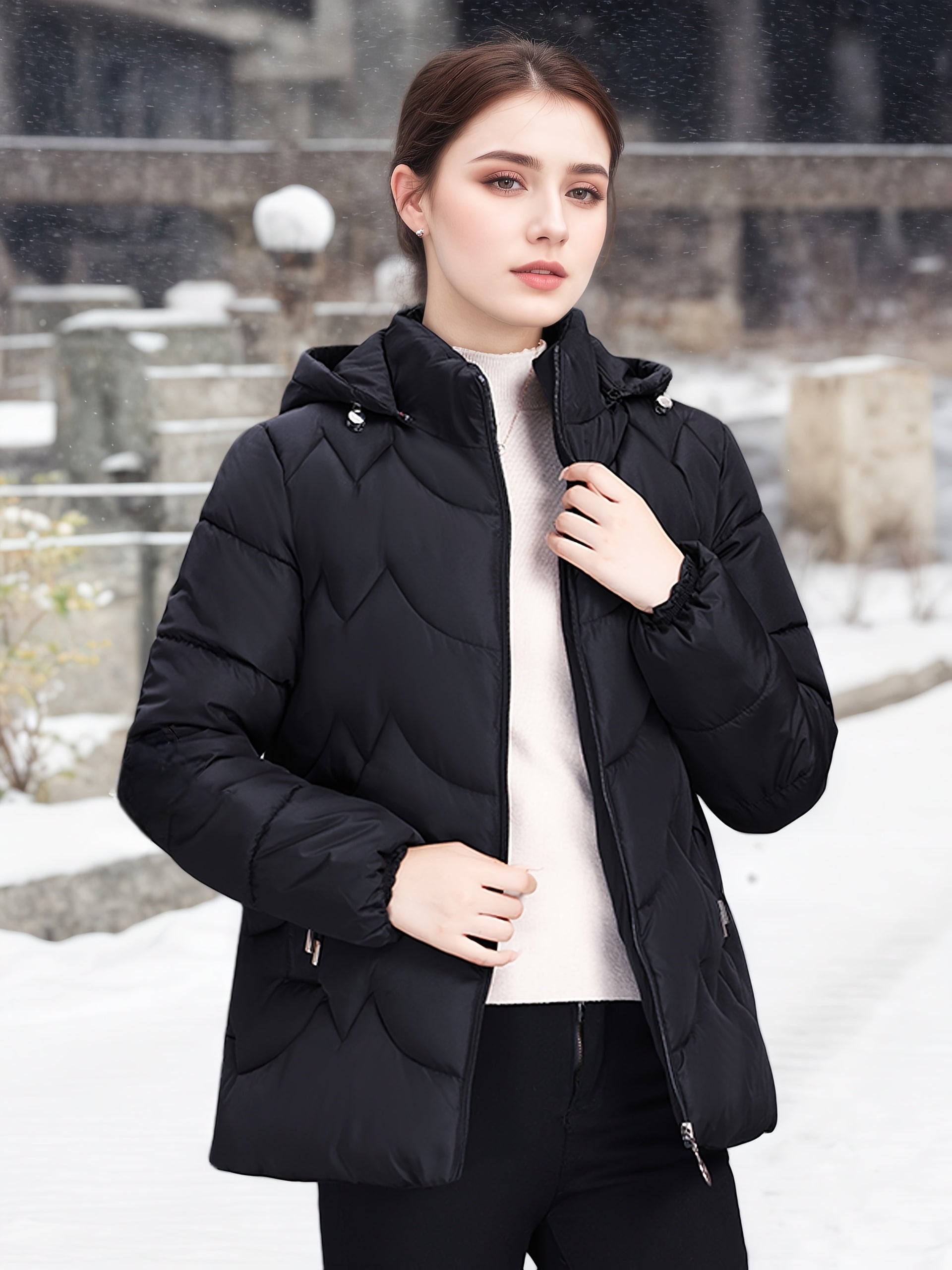 Women'S Elegant Black Winter Puffer Jacket - Long Sleeve, Zip-Up, Casual Style with Beaded Detail, Perfect for Snowy Days, Casual Winter Wear | Zippered Jacket | Functional Pockets