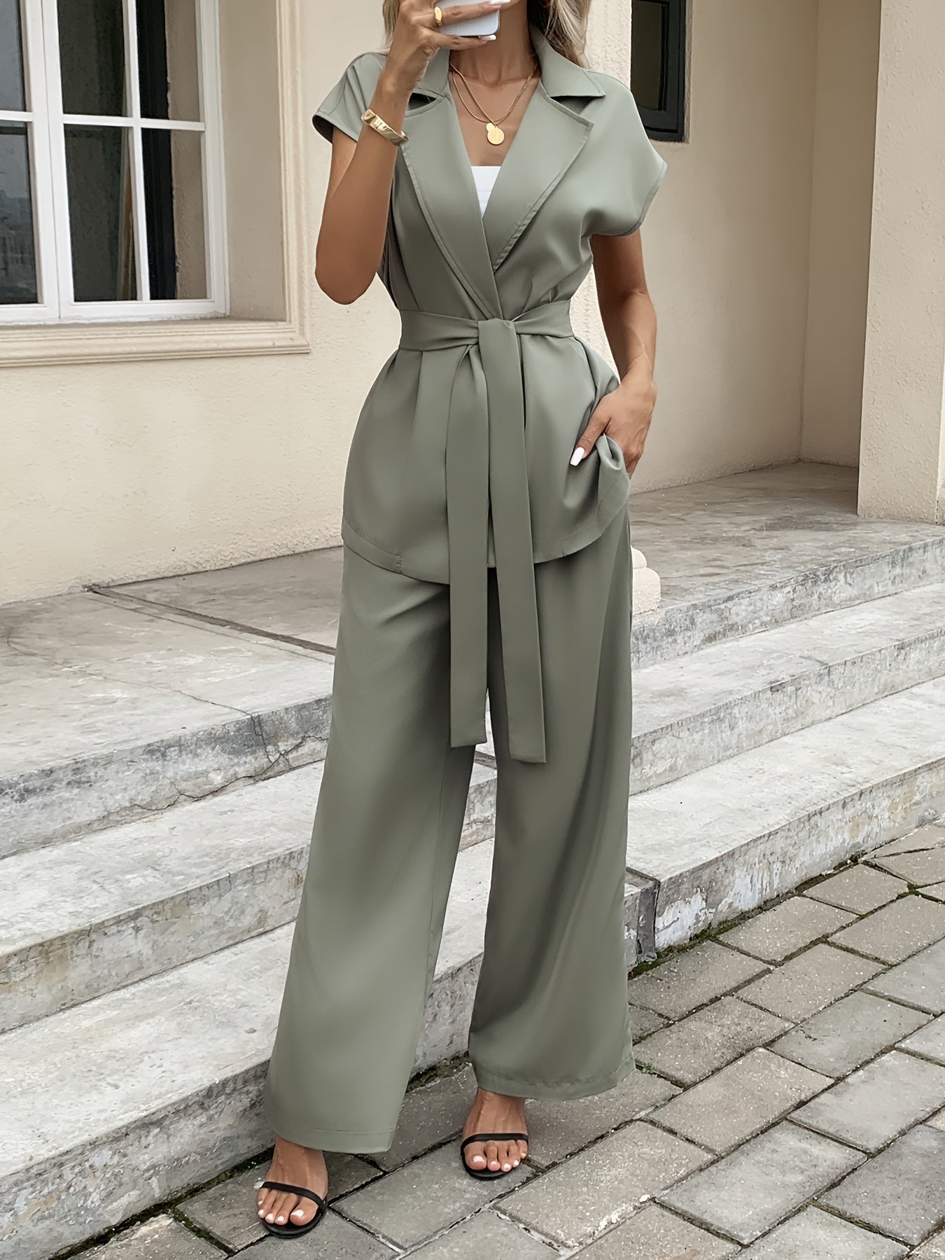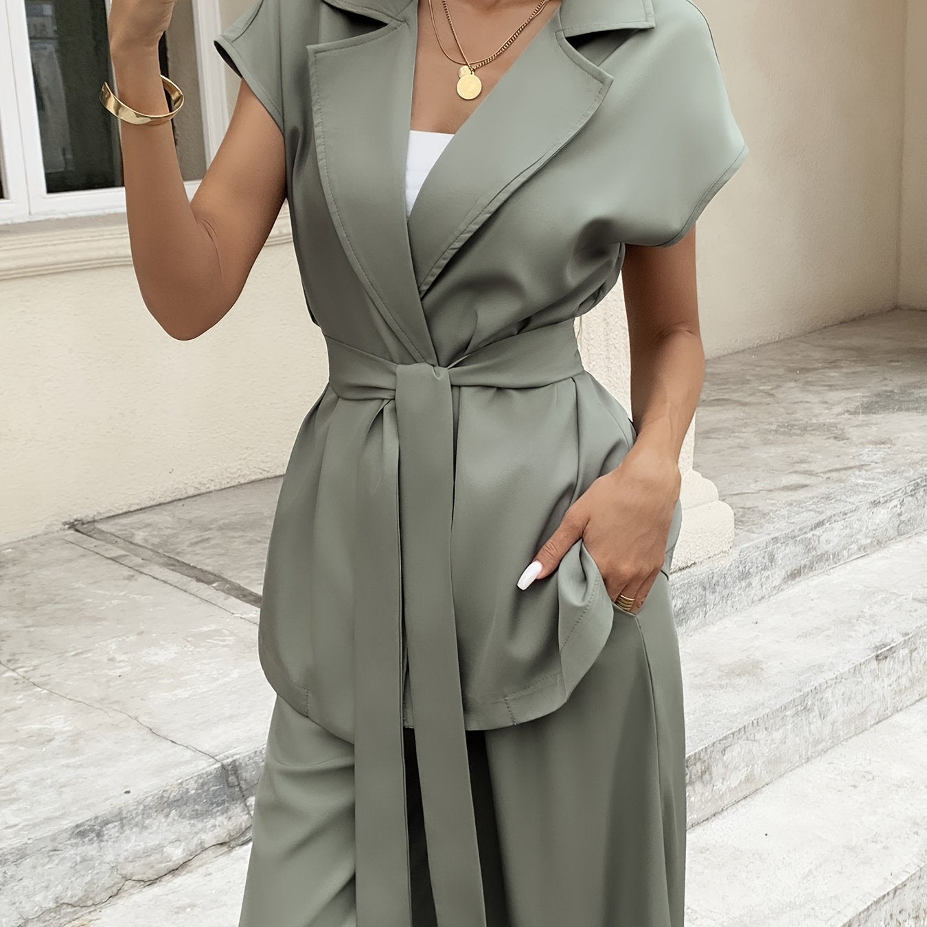 Women'S Elegant Drop Shoulder Suit Vest + Elastic Waist Ruched Pants Two-Piece Set with Belt