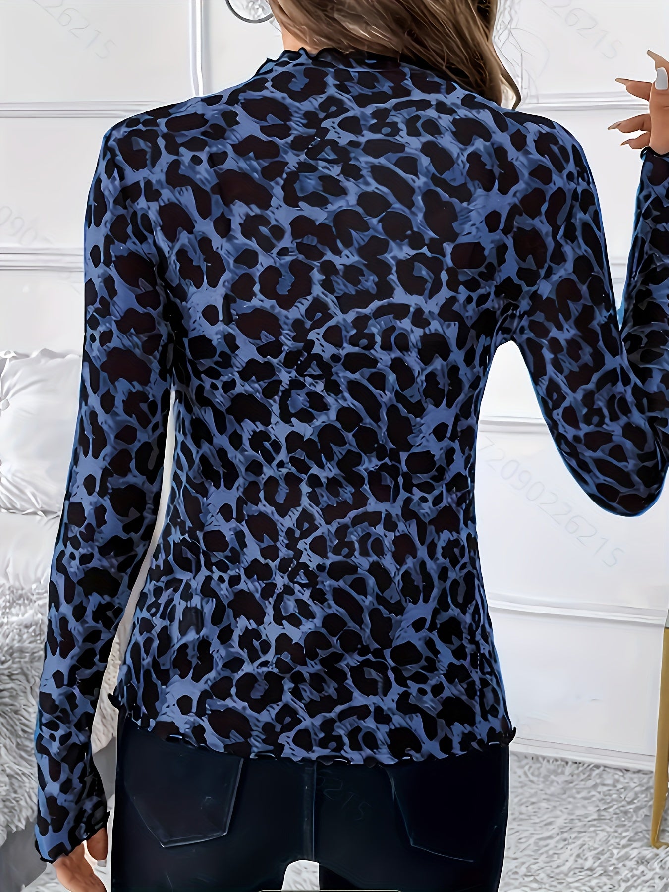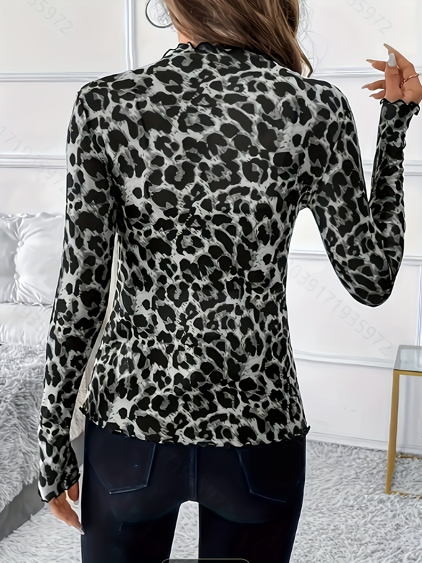 Women'S Elegant Leopard Print Long Sleeve T-Shirt - Stretchy Polyester Blend, Semi-High Neck, Ruffled Hem, Machine Washable, Spring/Summer/Fall Top, Casual Wear|Ruffled Hem Top|Stretchy Fabric