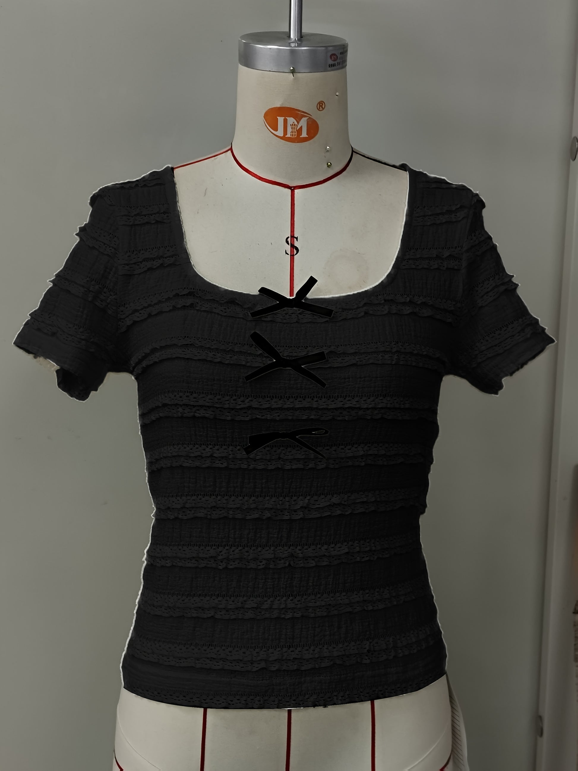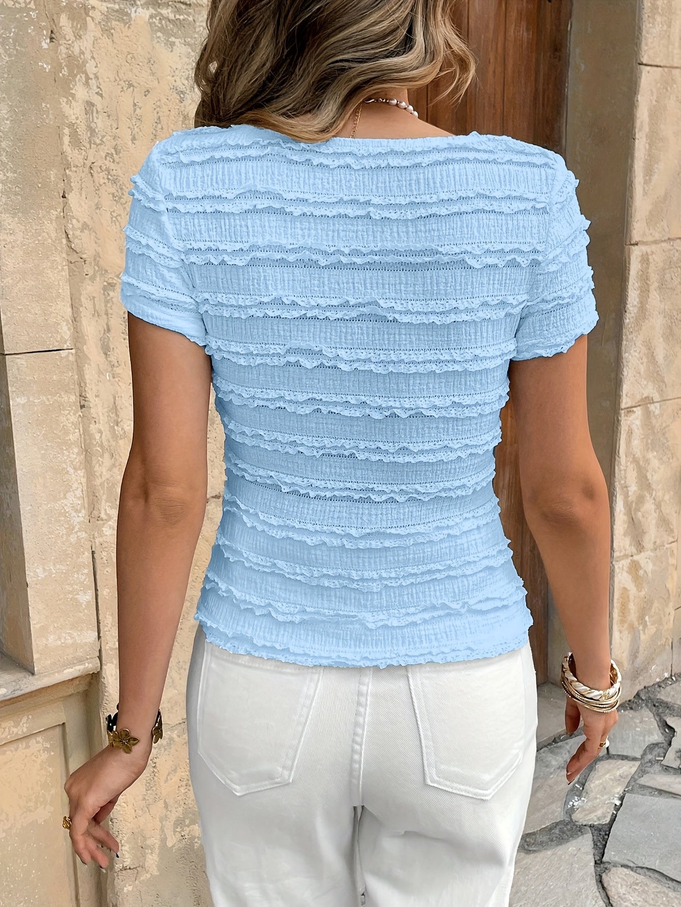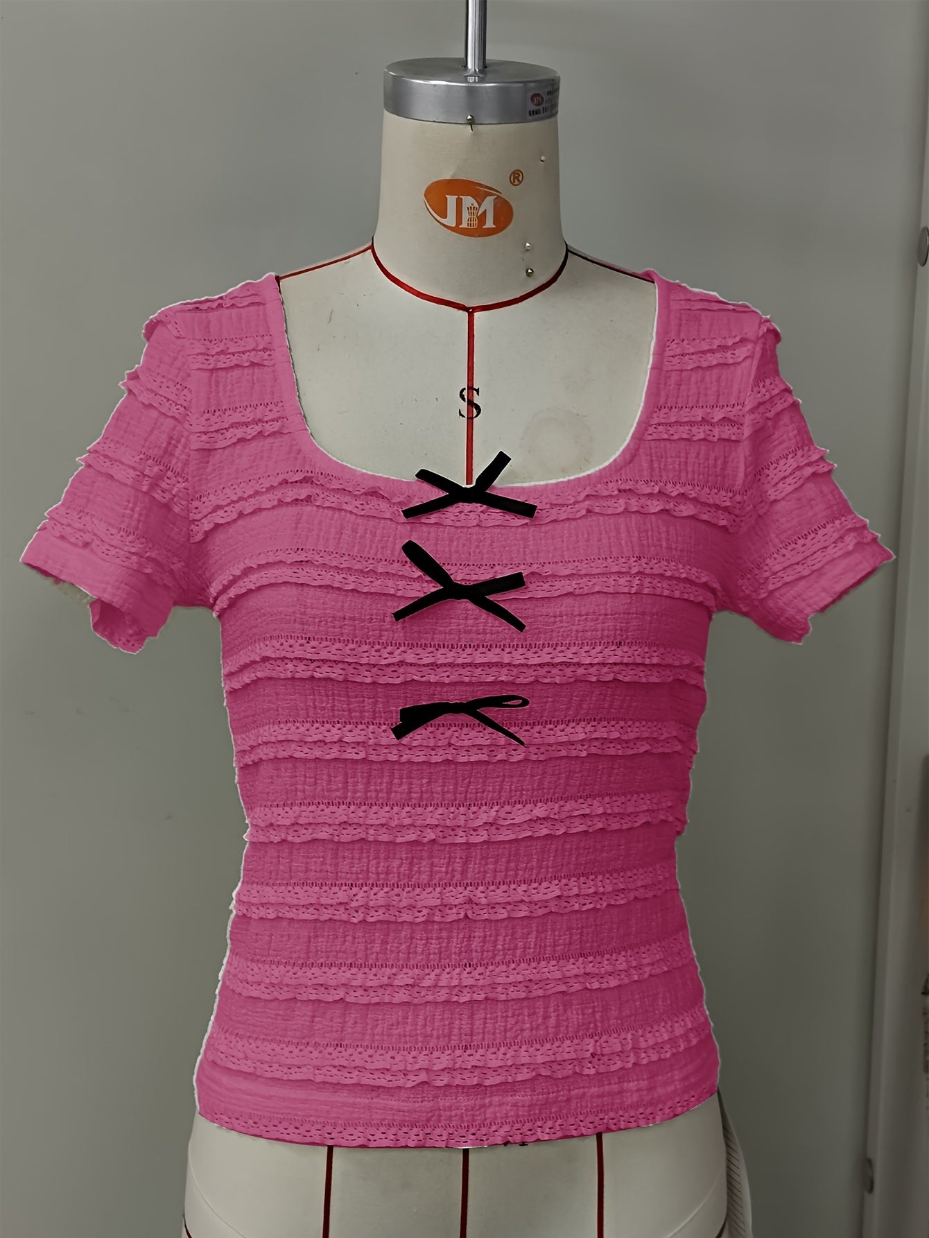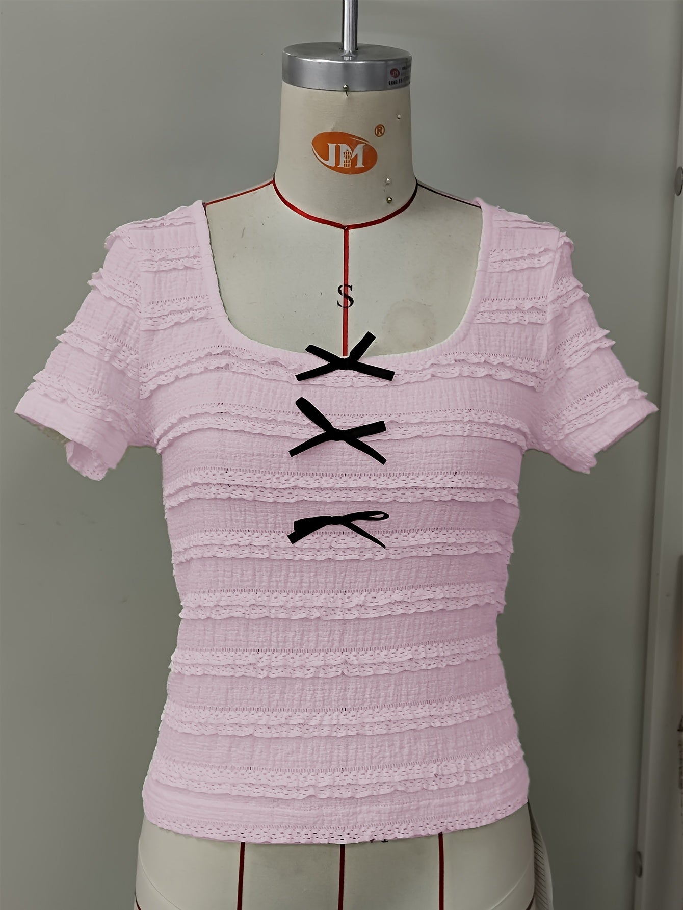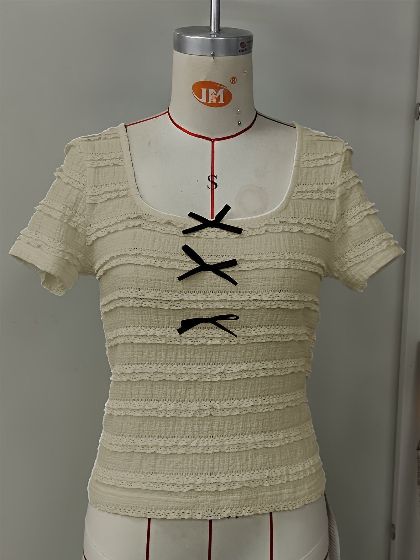 Women'S Elegant Ruffle Trim Short Sleeve T-Shirt with Front Bow Detail - Lightweight Casual Beach Vacation Top, Solid Color, Spring/Summer Collection, Beach Vacation Top | Ruffle Trim Top | Lightweight Fabric