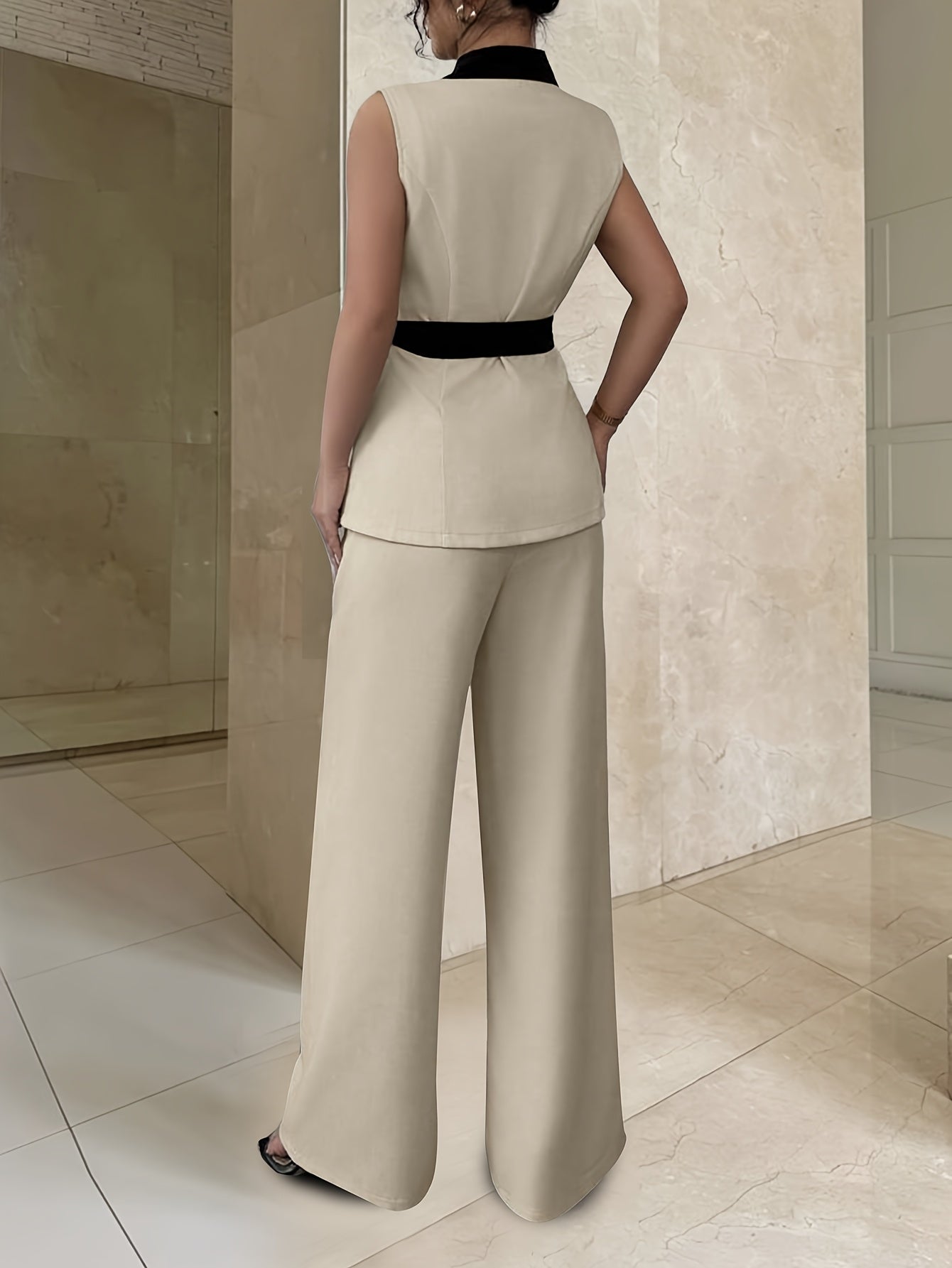 Women'S Elegant Sleeveless Blazer and Wide-Leg Pants Set - Beige with Black Accents, Belted Waist, Button-Up Top, Flowy Pants, Perfect for Spring/Summer, Stylish Office or Casual Wear, Casual Attire | Elegant Outfit | Polyest
