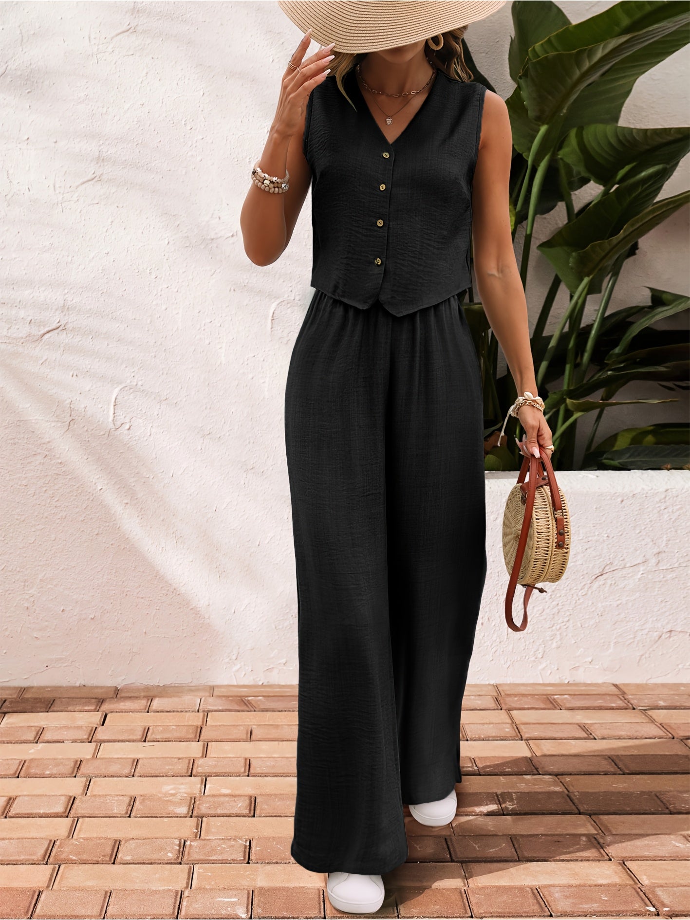 Women'S Elegant Solid Color Sleeveless V-Neck Two-Piece Set - Casual Summer Jumpsuit with Button Placket, Wide Leg Pants, and Beige Wedge Sandals, Casual Attire|Vneck Jumpsuit|Elegant Jumpsuit