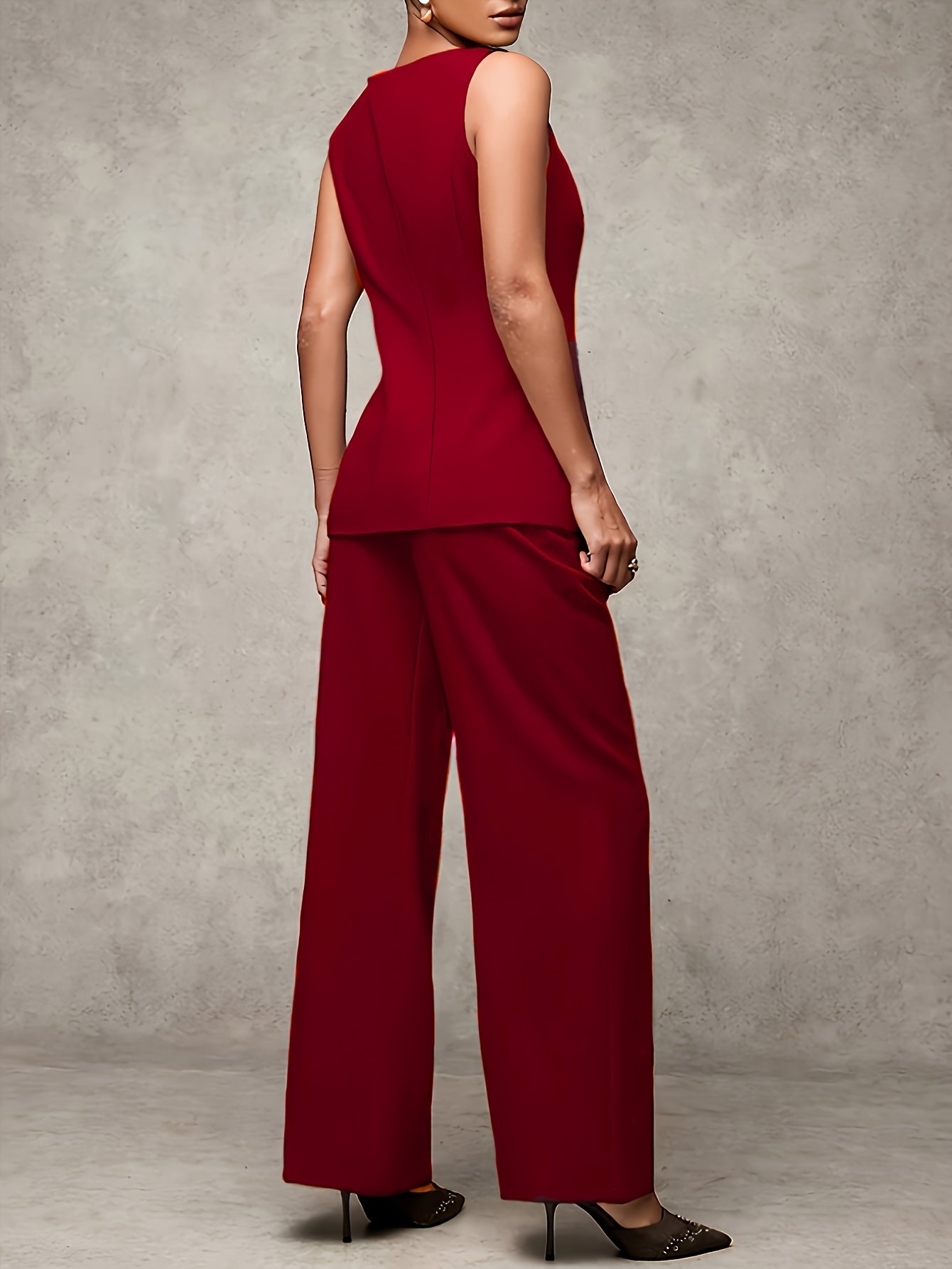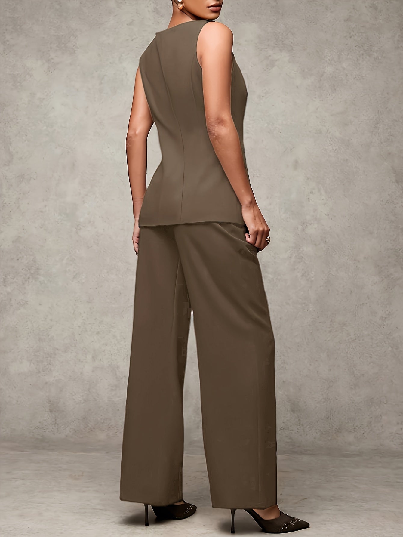 Women'S Elegant Two-Piece Office Set - Sleeveless Top with Button Details & Wide-Leg Pants, Black & White Striped, Perfect for Summer & Autumn, Office Attire|Sleeveless Top|Button Detailin