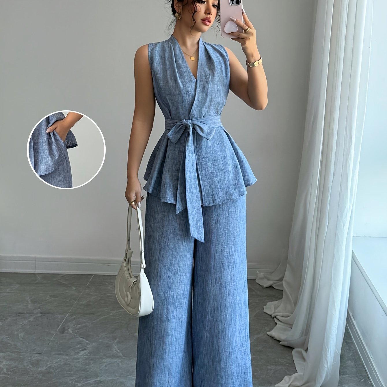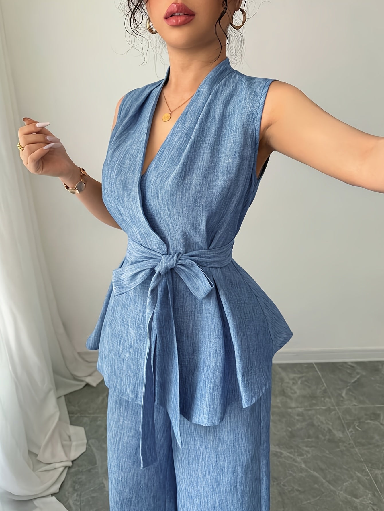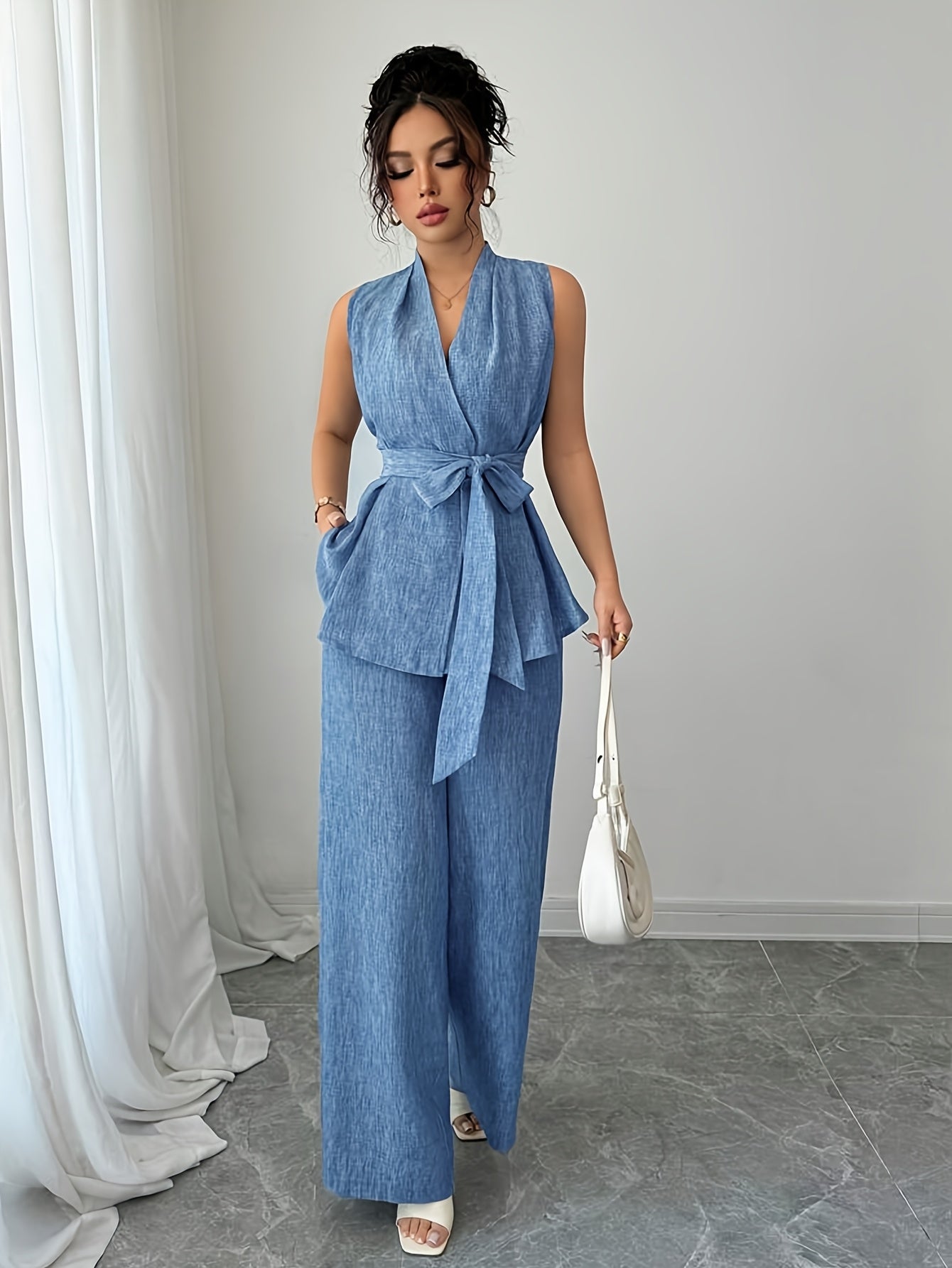 Women'S Elegant Two-Piece Summer Set - Sleeveless V-Neck Crop Top with Tie Detail & High-Waisted Wide-Leg Pants, Solid Color, Perfect for Spring/Summer, Casual Attire|Elegant Two-Piece Set|Polyester Fabric