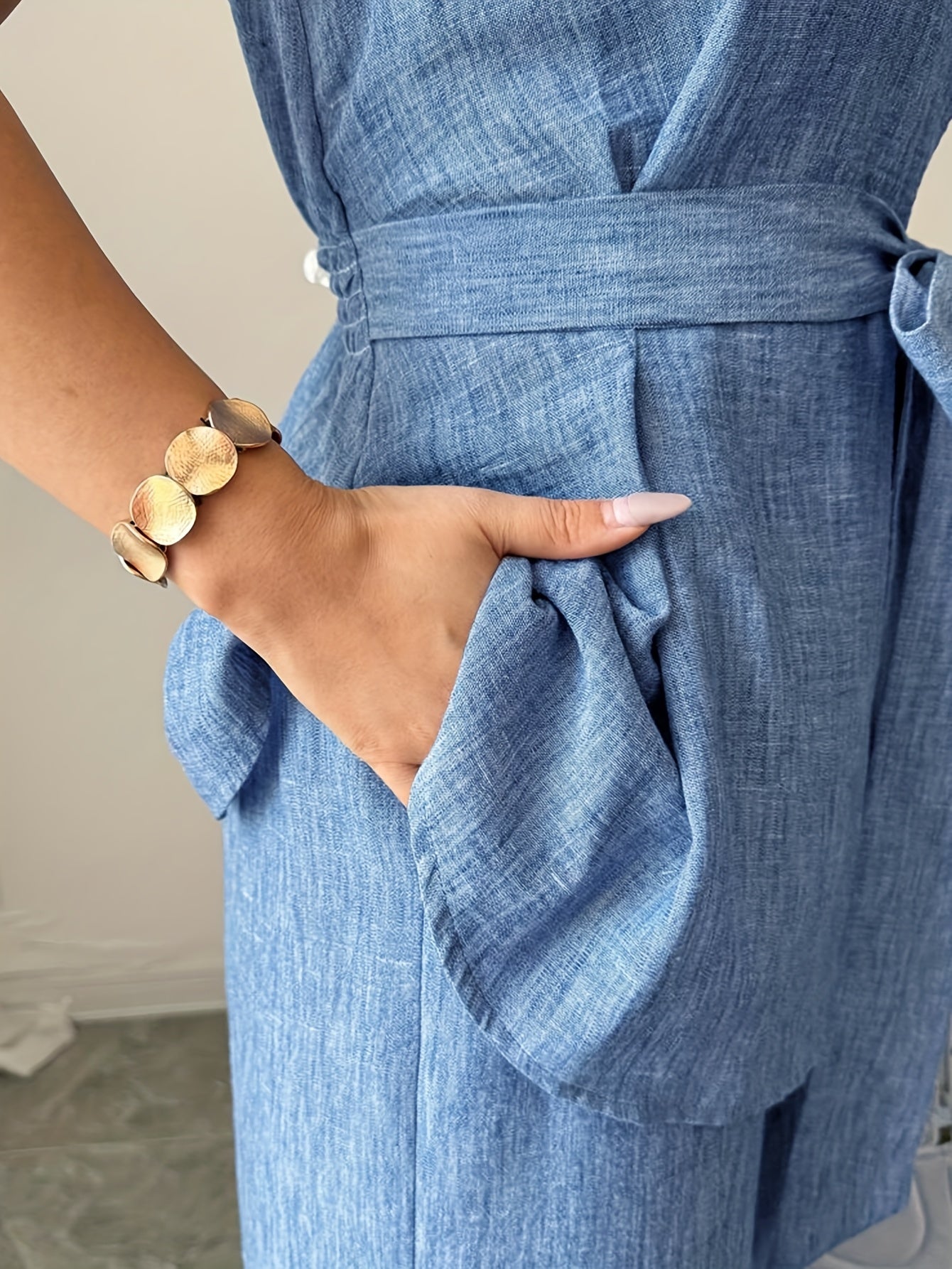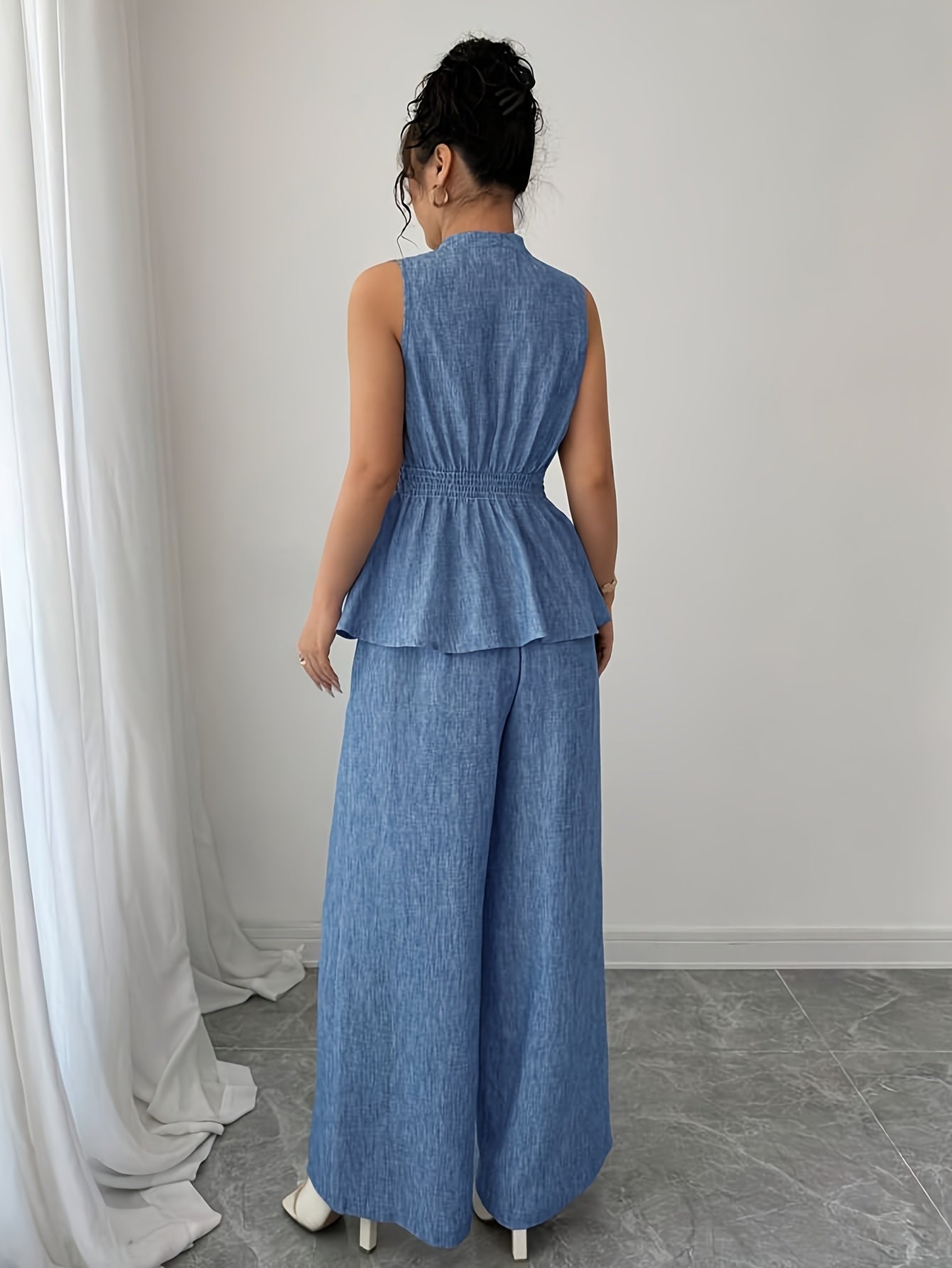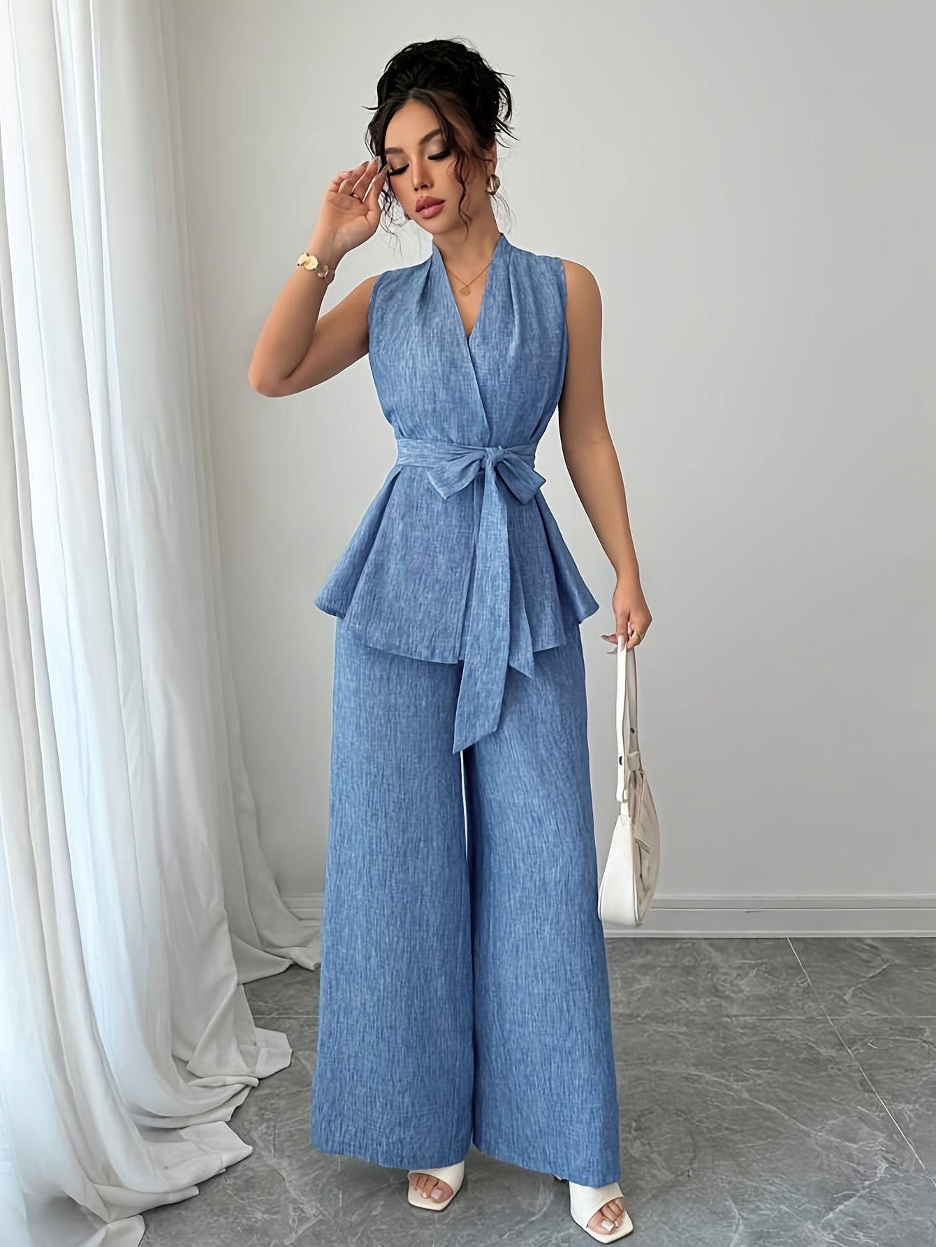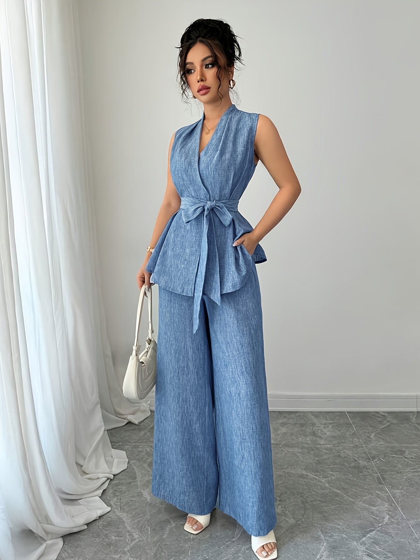 Women'S Elegant Two-Piece Summer Set - Sleeveless V-Neck Crop Top with Tie Detail & High-Waisted Wide-Leg Pants, Solid Color, Perfect for Spring/Summer, Casual Attire|Elegant Two-Piece Set|Polyester Fabric