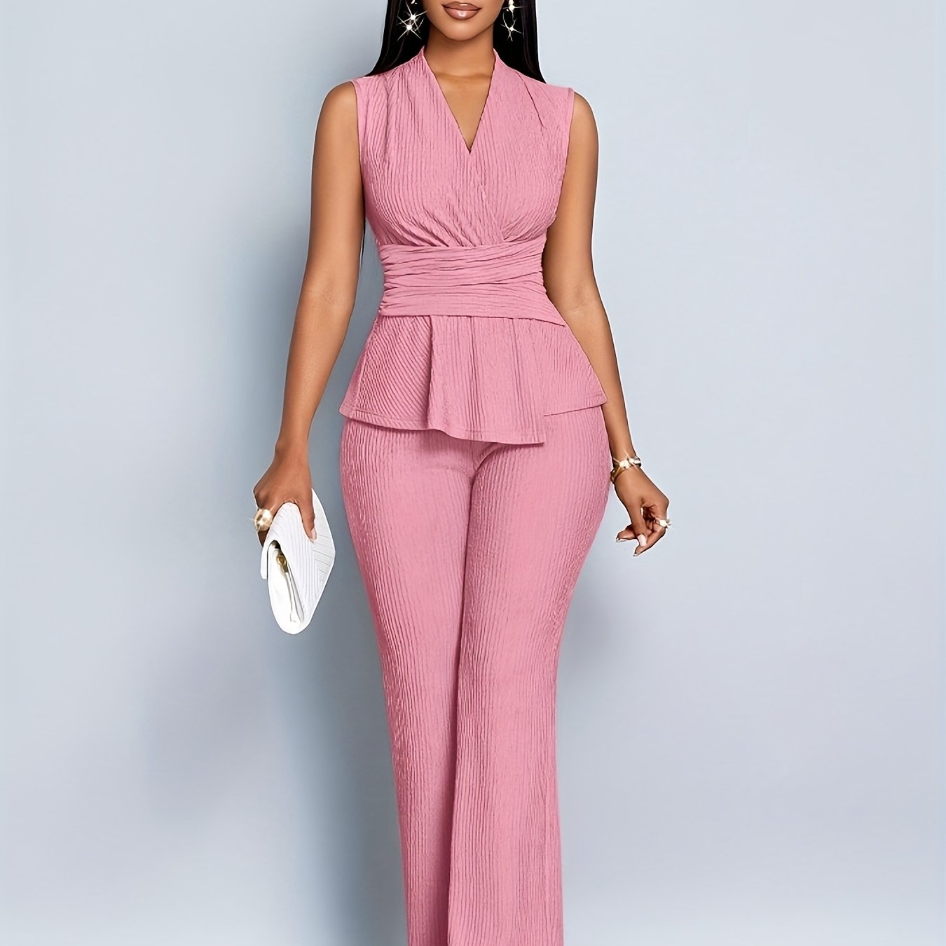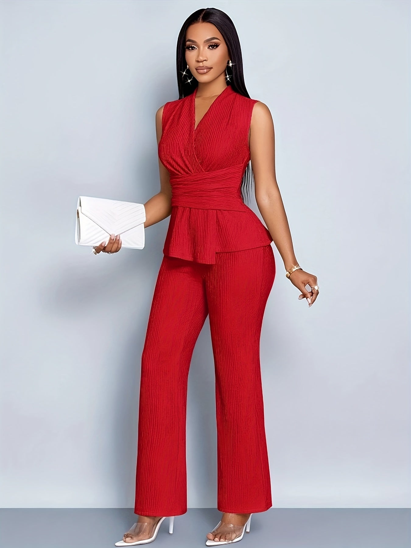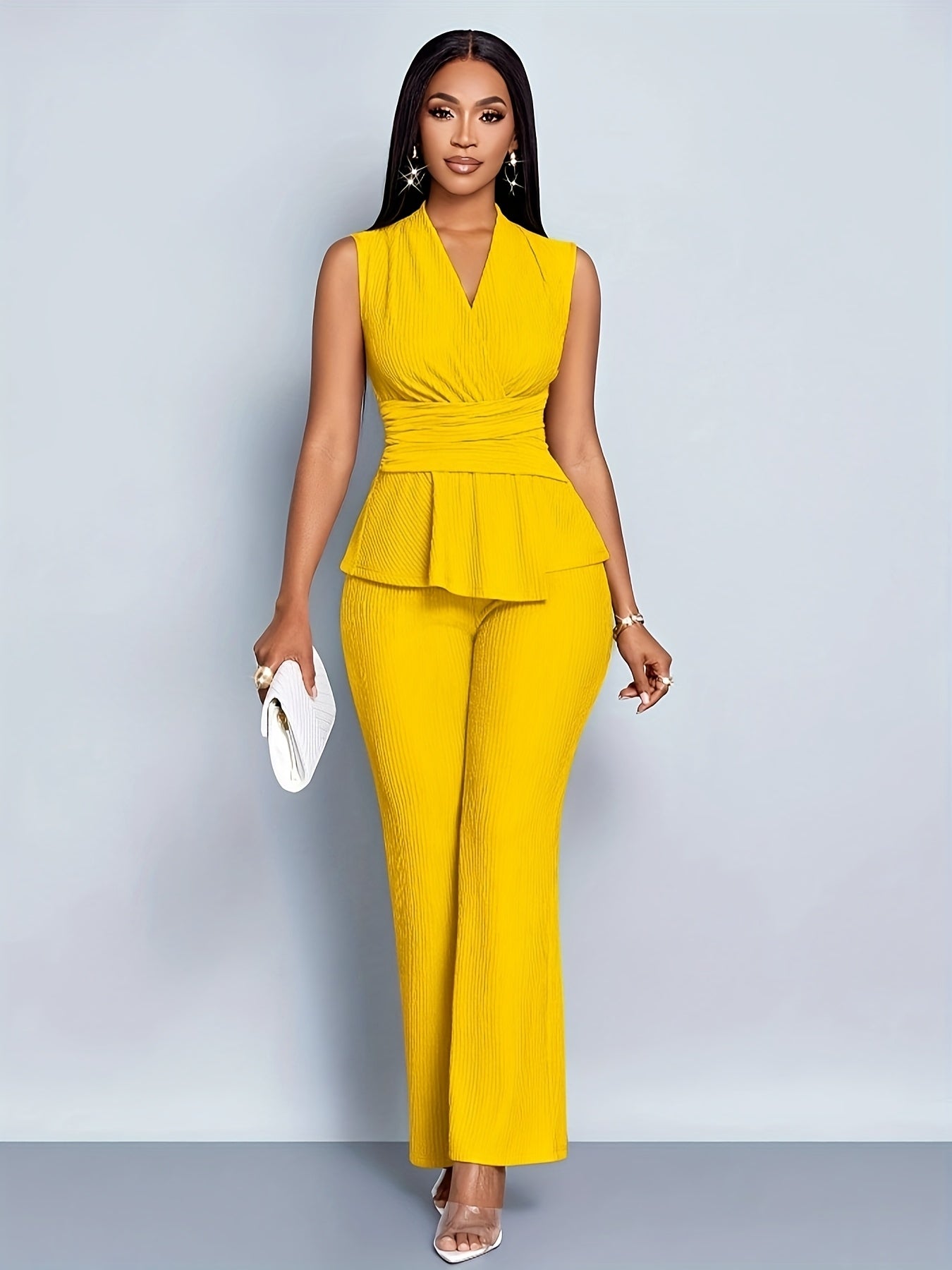 Women's Elegant V-Neck Sleeveless T-Shirt and Wide-Leg Pants Two-Piece Set, Asymmetrical Hem Casual Spring/Summer Outfit