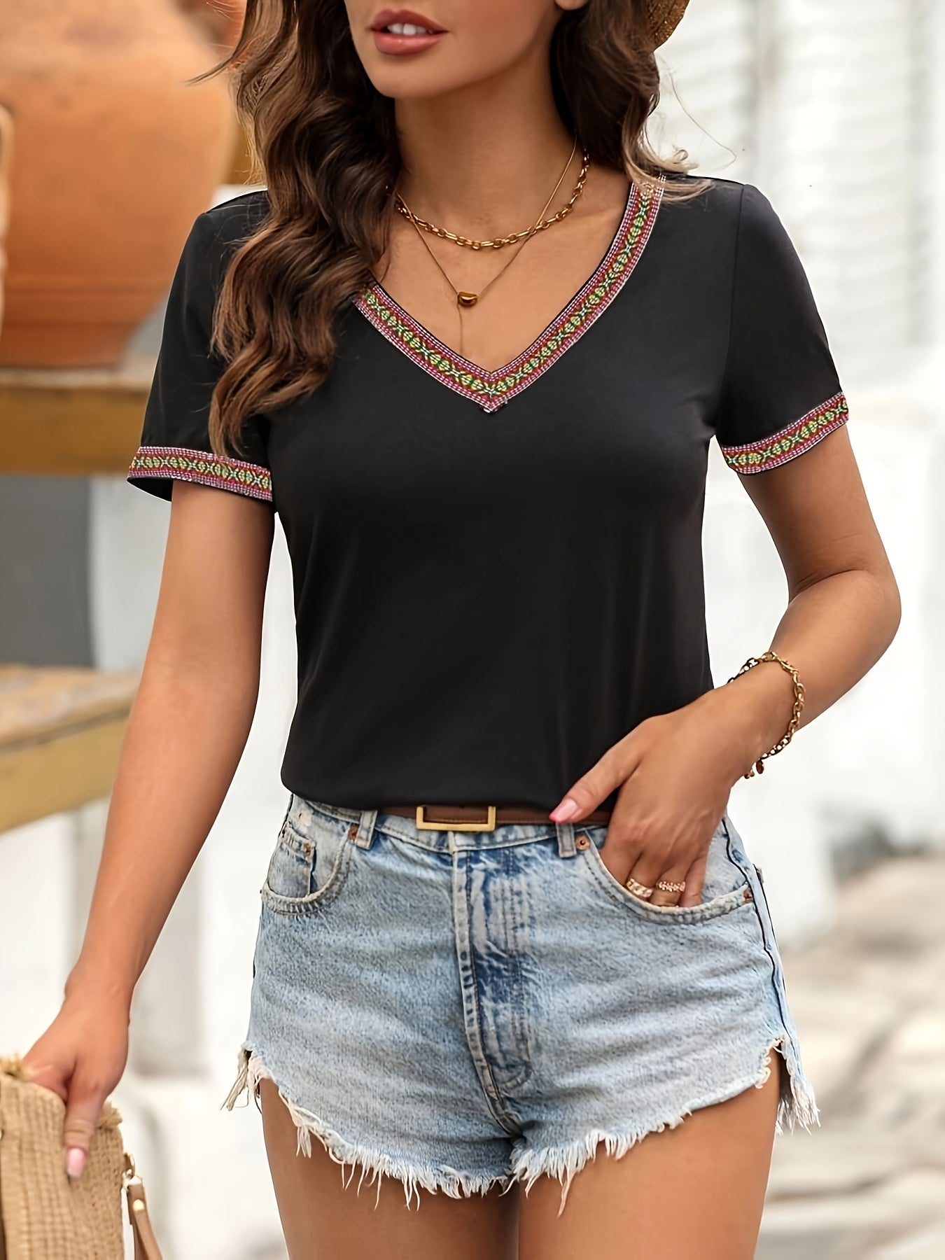 Women's Elegant V-Neck T-Shirt with Contrast Color Accents - Black & Multicolor Geometric Pattern, Short Sleeve Spring/Summer Top, Machine Washable, Everyday Fashion, Nontransparent Fabric