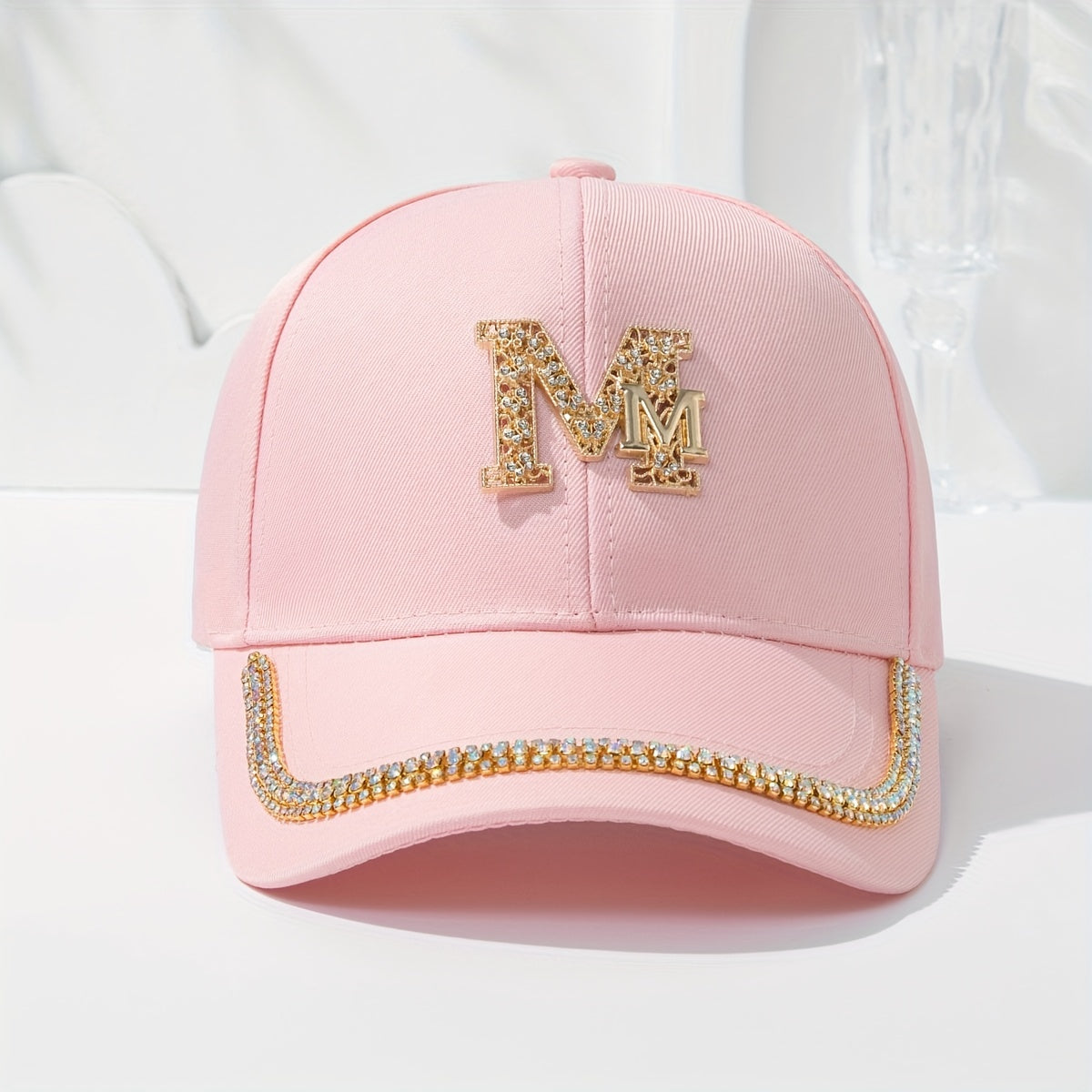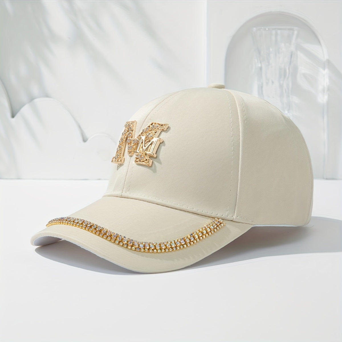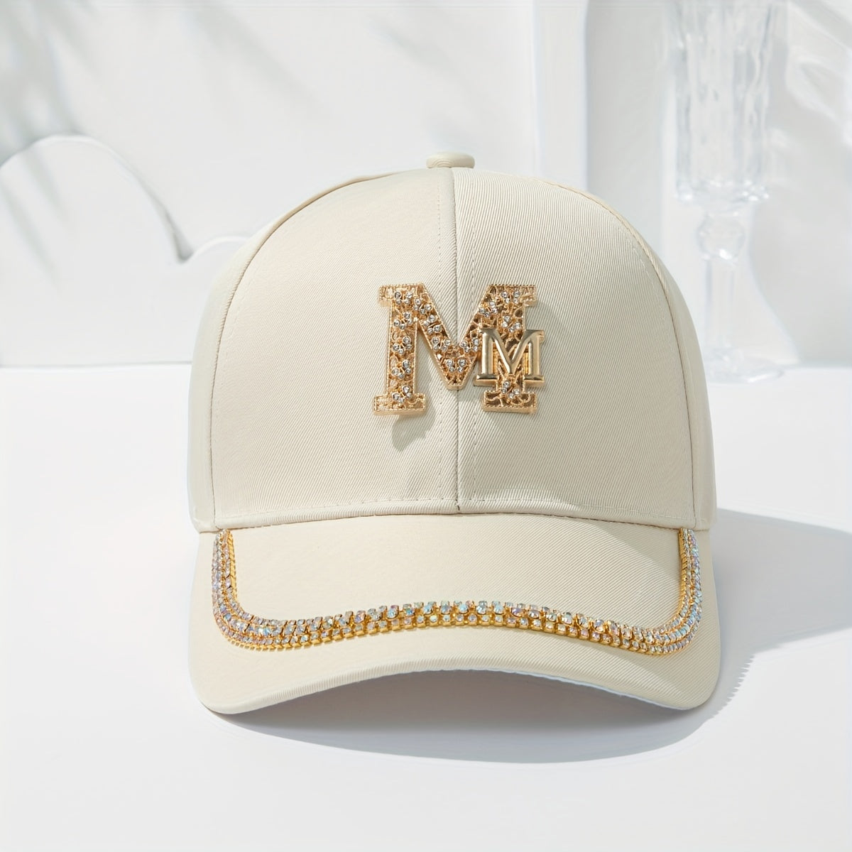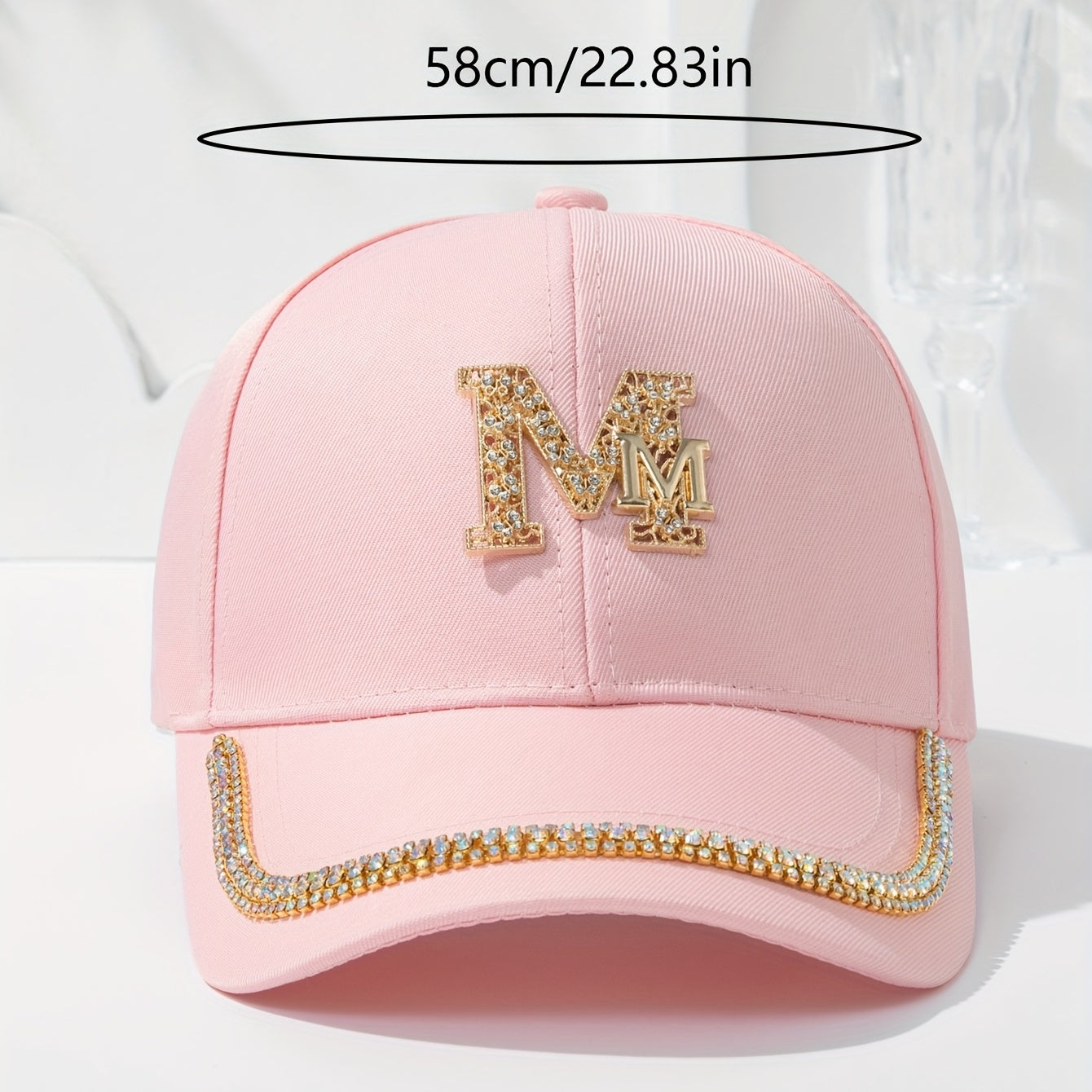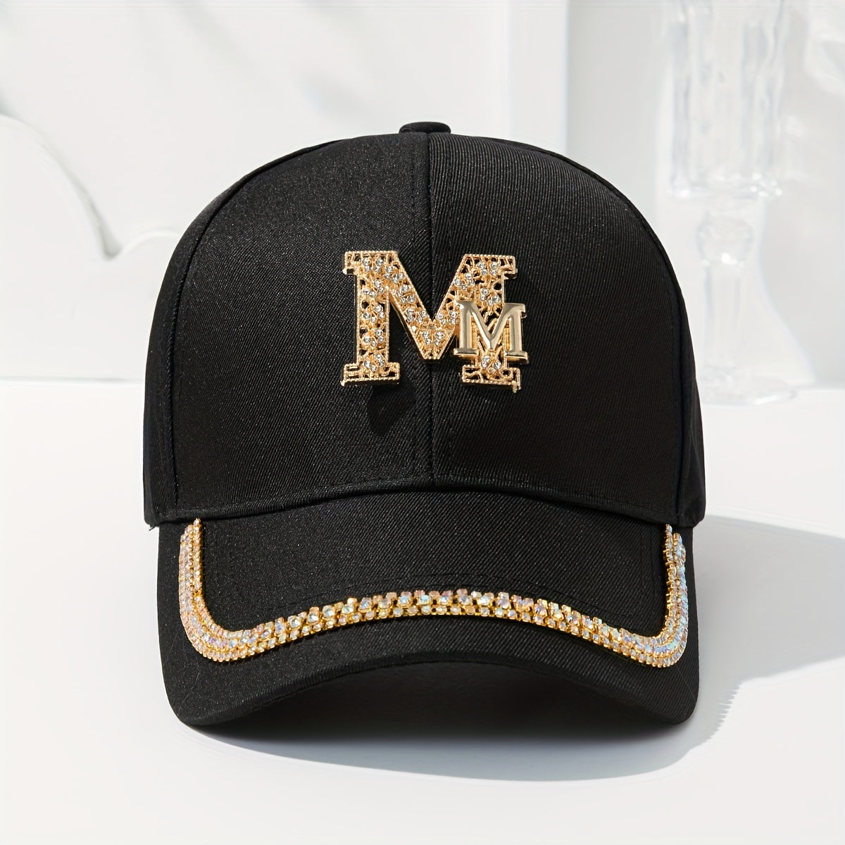 Women's Fashion Patch Baseball Cap With Metallic "M" Initial, Rhinestone Accents, Adjustable Snapback Cps, Wide Brim Sun Hats