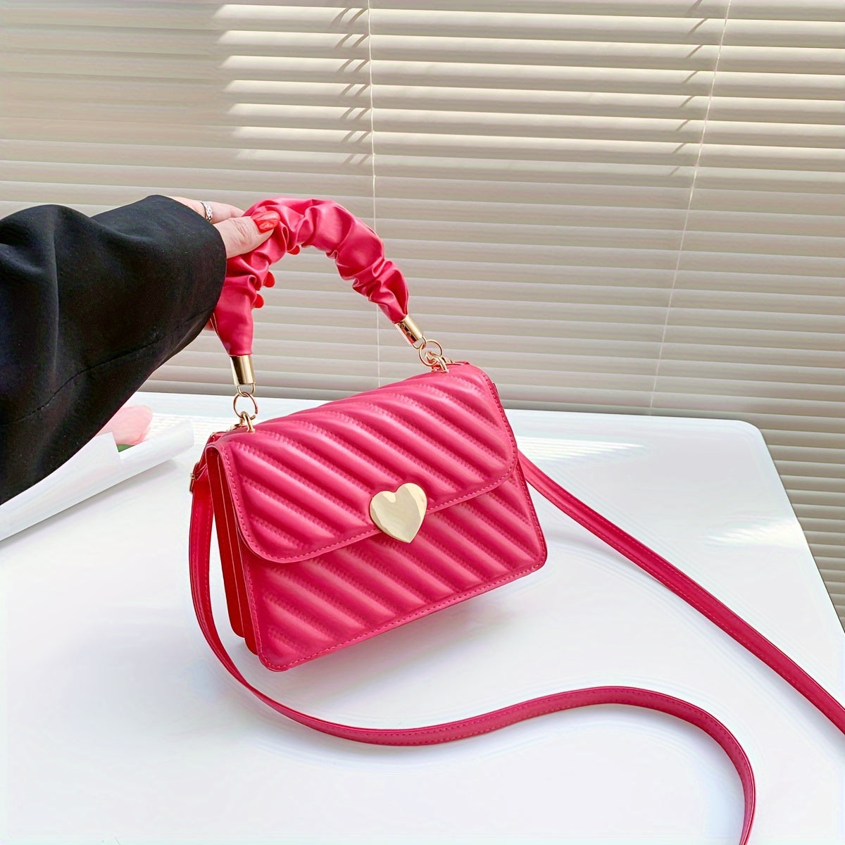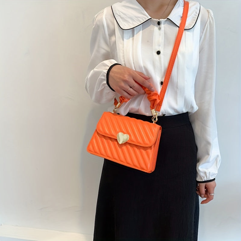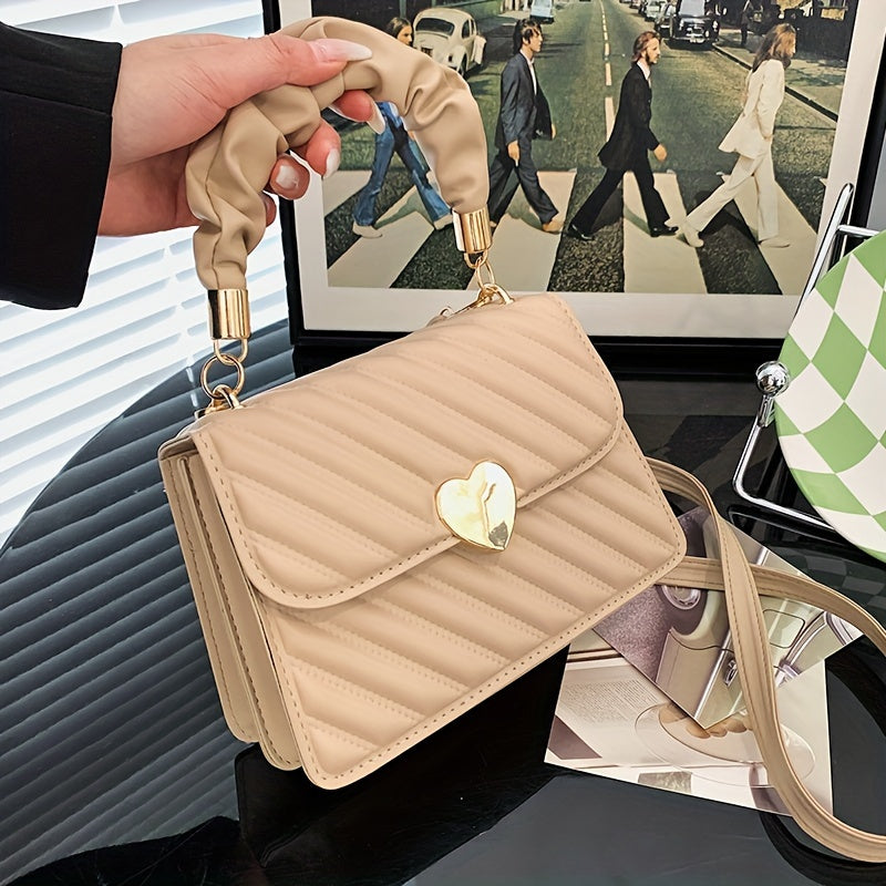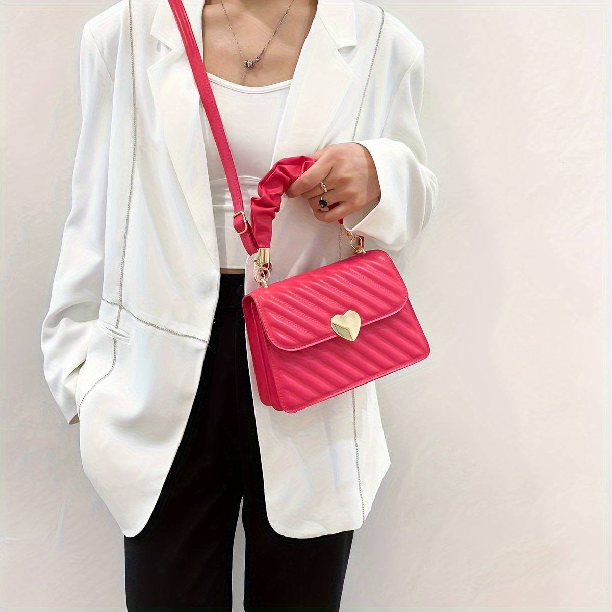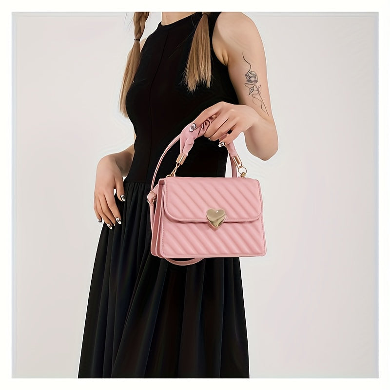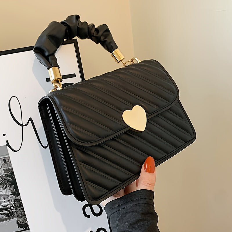 Women'S Fashion Shoulder Bag, Korean Version, Faux Leather, Quilted Solid Color, Heart Accent, Removable Strap, Magnetic Closure, Synthetic Faux Leather Lining, Painted Edges, Versatile Crossbody Purse - Available in Black, R