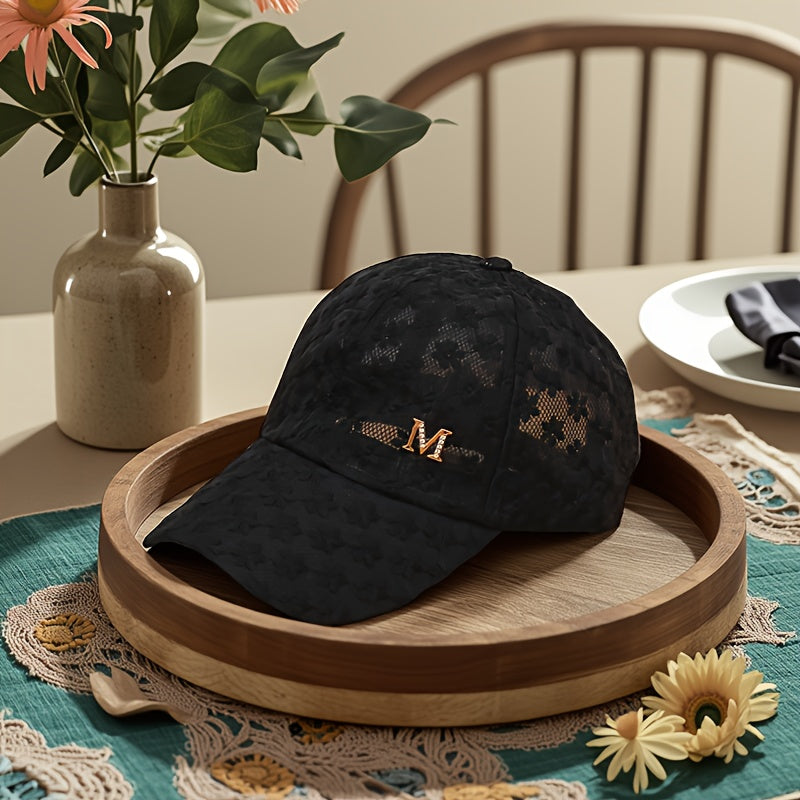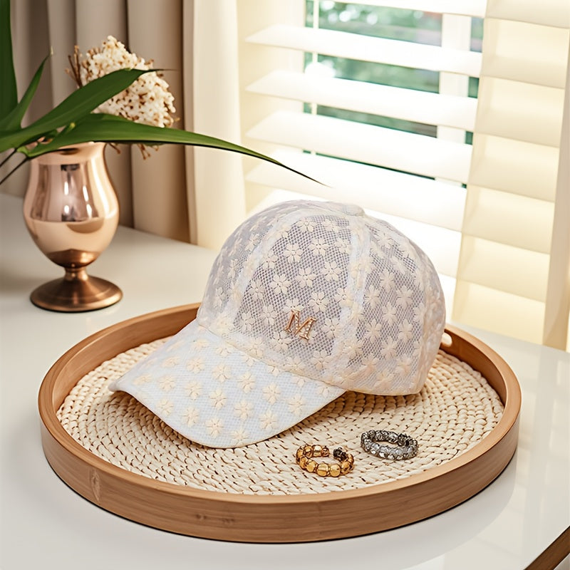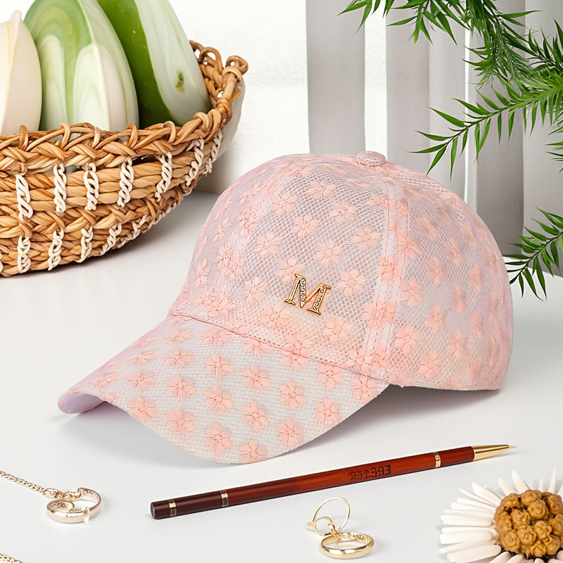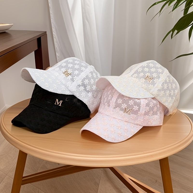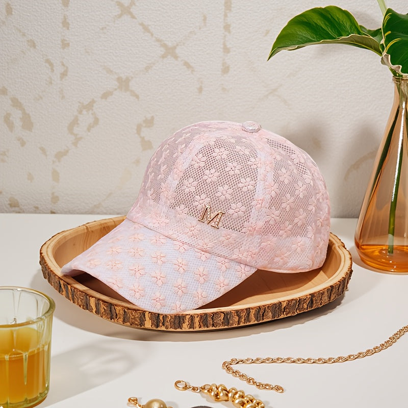 Women's Floral Lace Baseball Cap with Breathable Mesh Back & Embroidered 'M' Detail - Adjustable Snapback Closure, Lightweight Design for Valentine's Day, Casual Outings, City Travel, Outdoor Activities Hat, Embroidered Detai