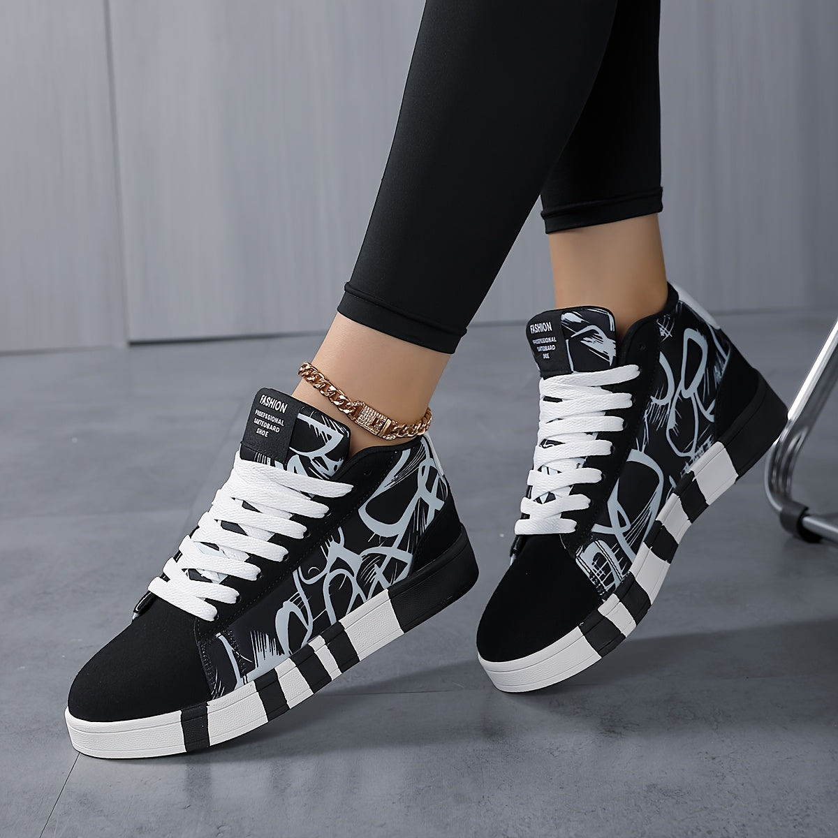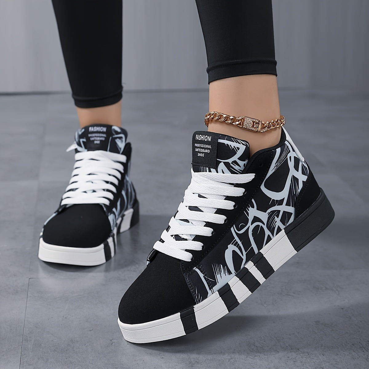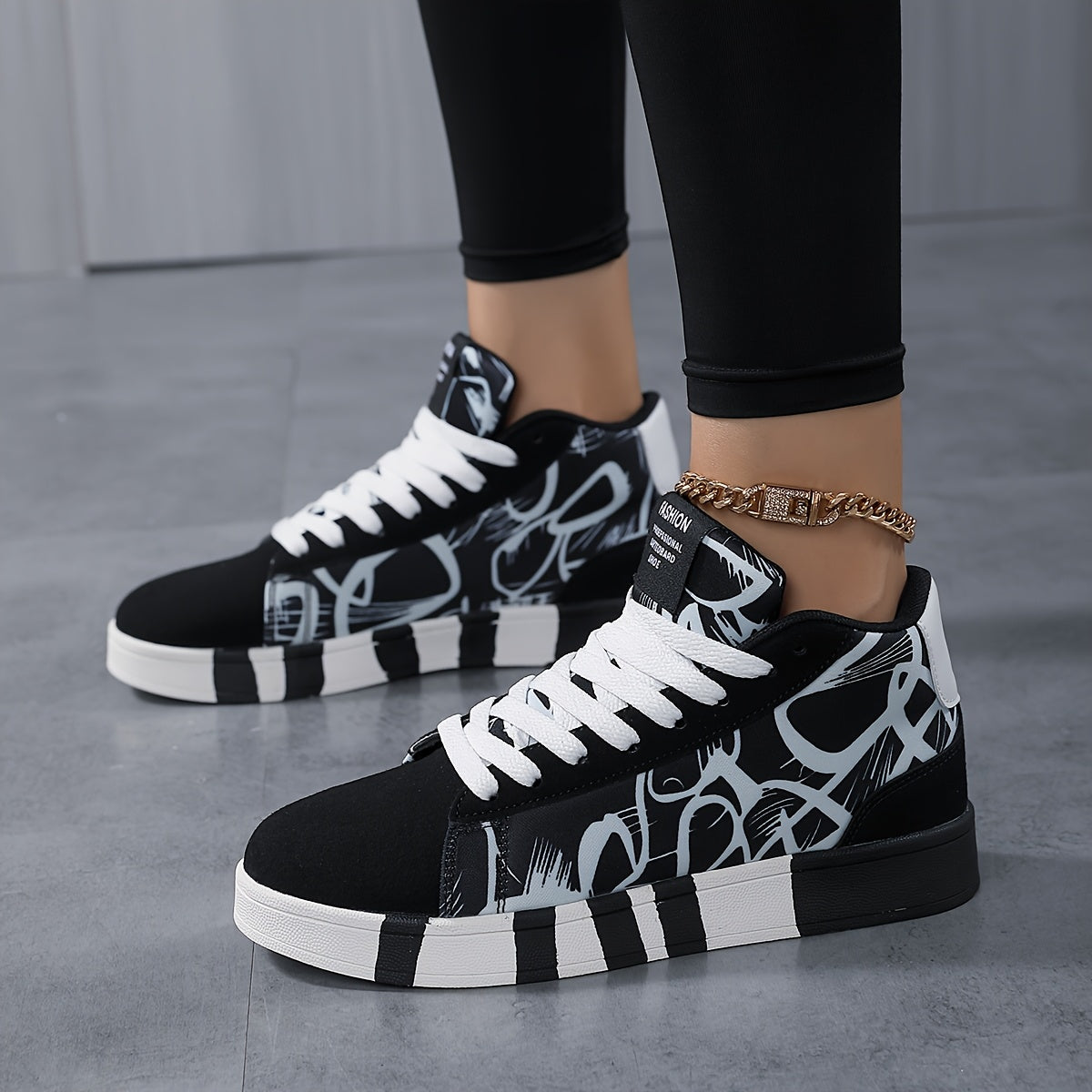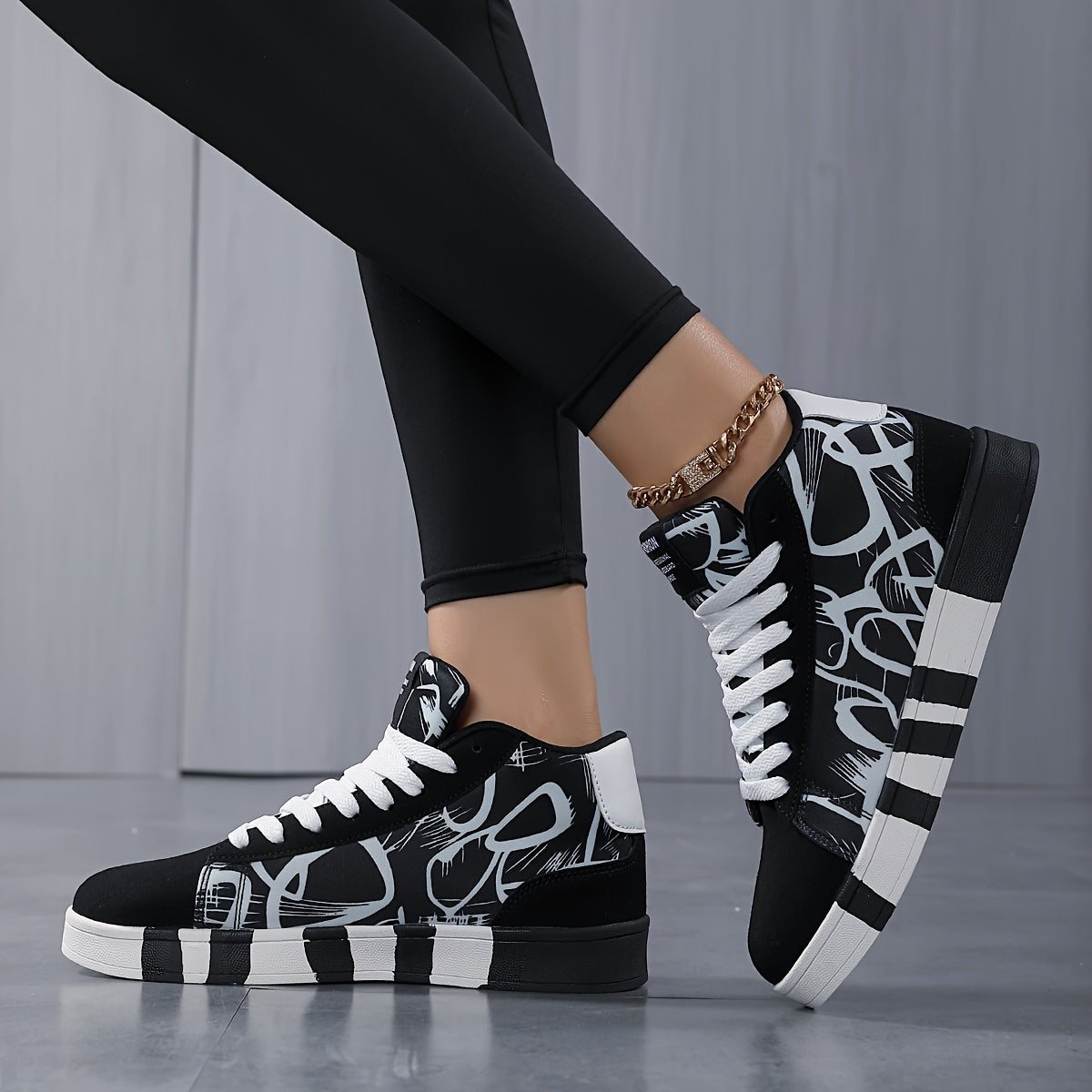 Women'S High-Top Casual Skate Shoes, Black and White Graffiti Design, Lightweight Fabric Lining, All-Season Rubber Sole Sneakers for Outdoor Sports and Hiking, Skate Shoes