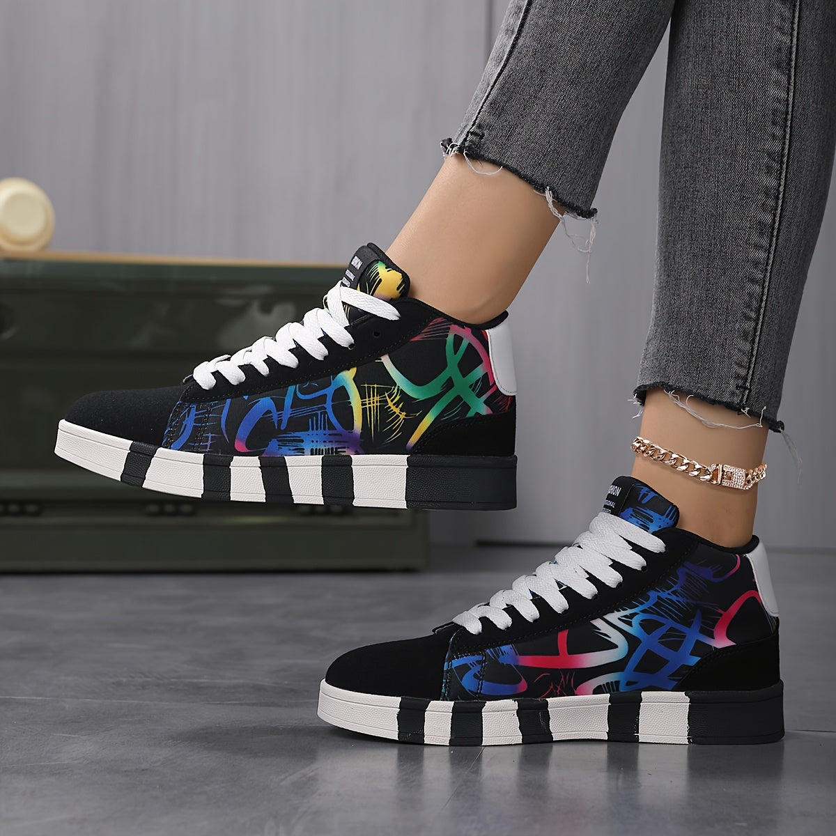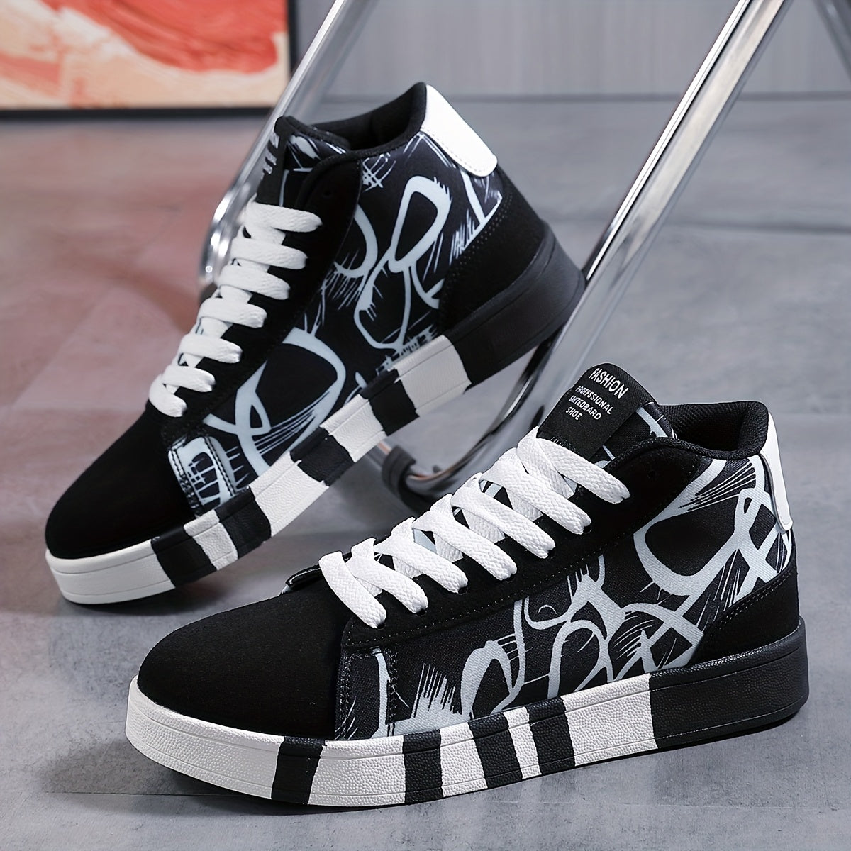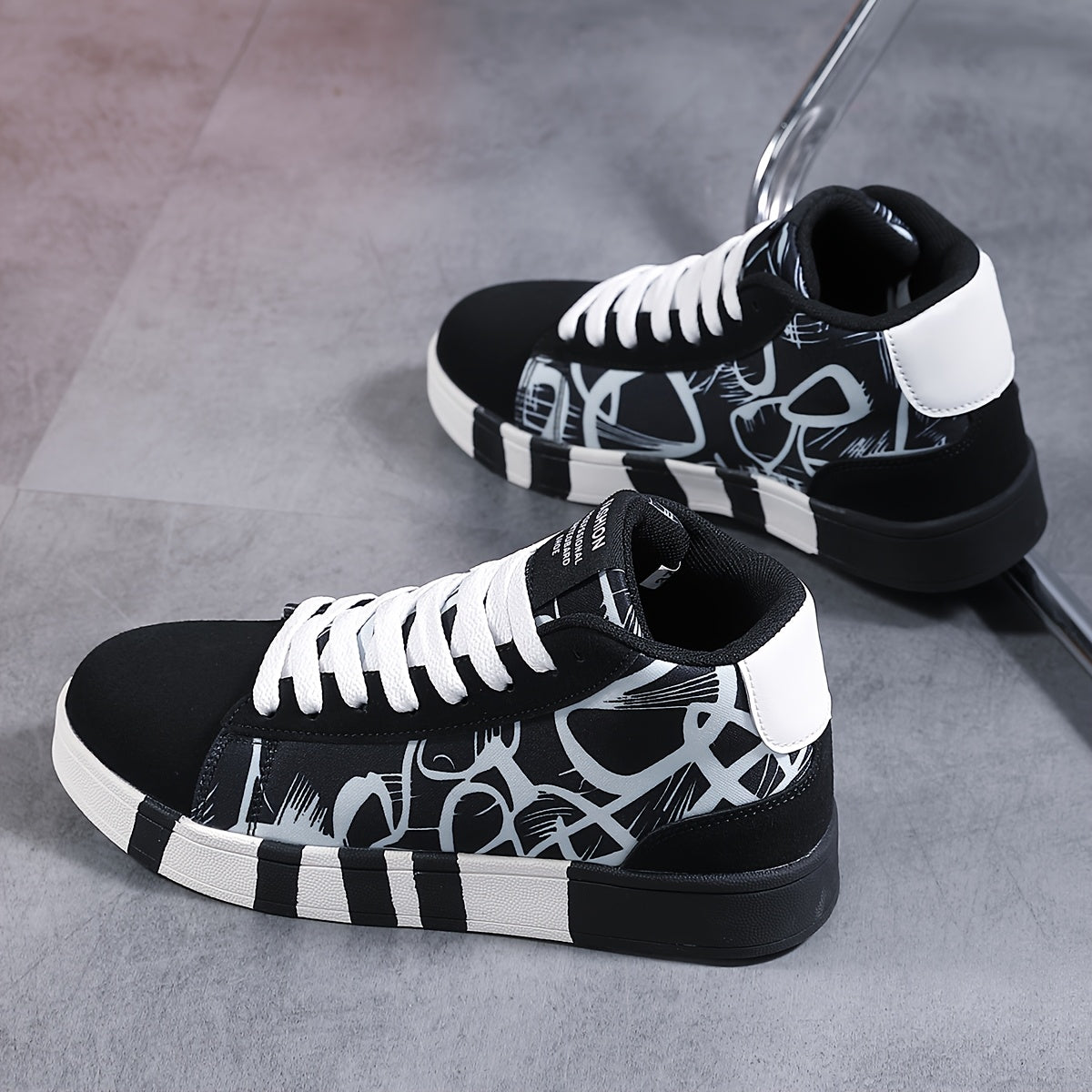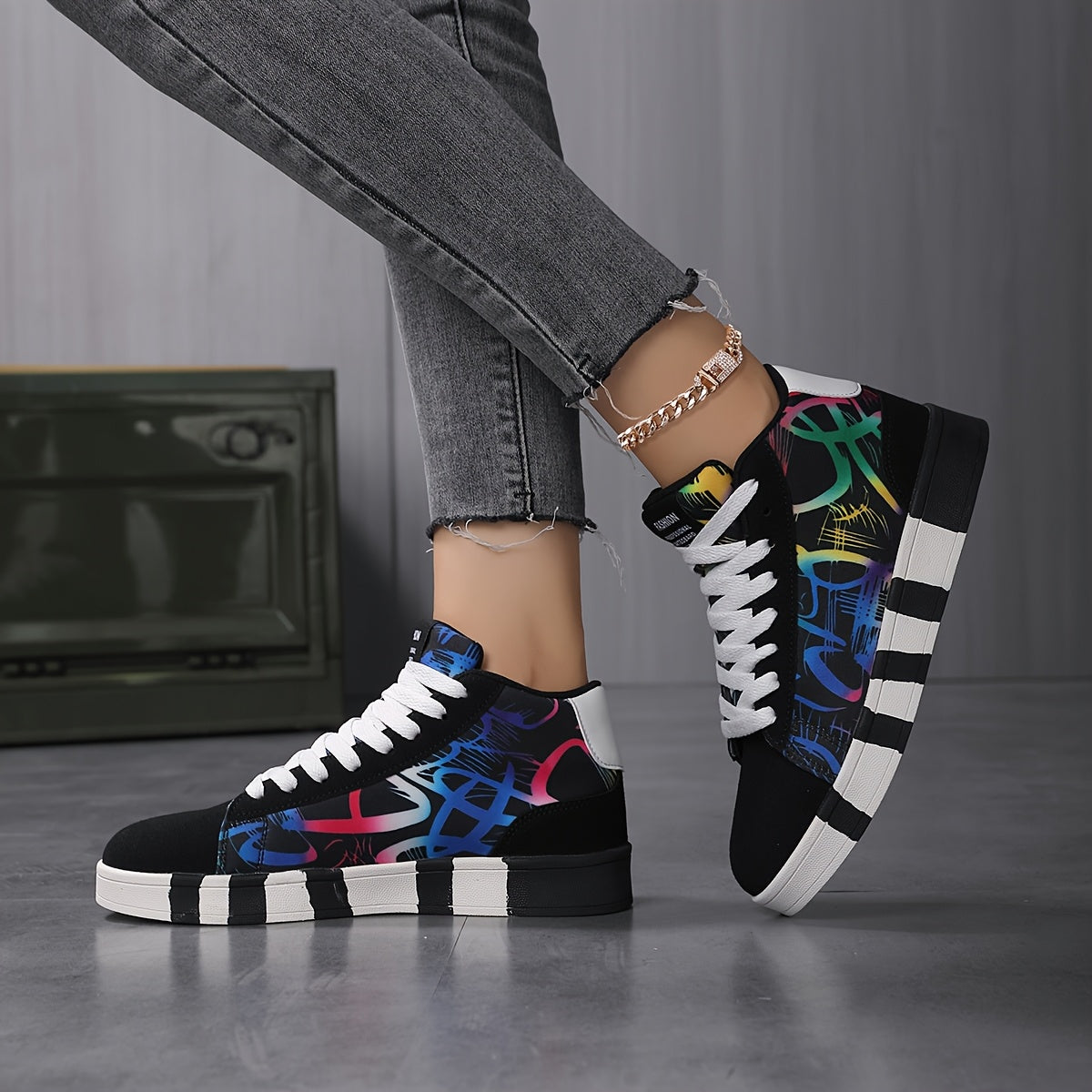 Women'S High-Top Casual Skate Shoes, Black and White Graffiti Design, Lightweight Fabric Lining, All-Season Rubber Sole Sneakers for Outdoor Sports and Hiking, Skate Shoes