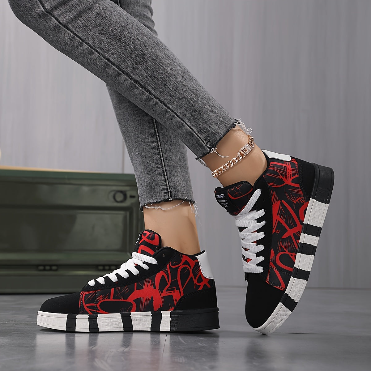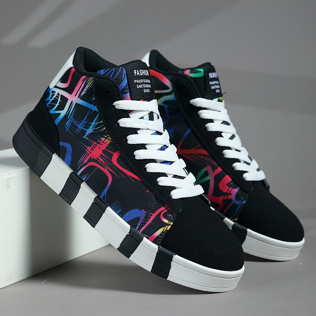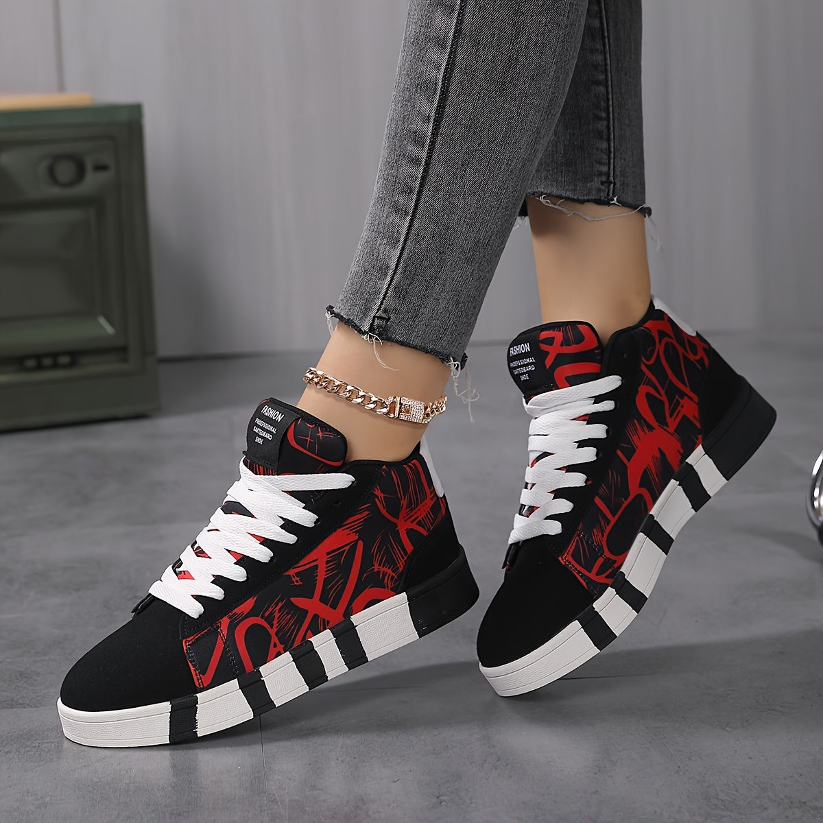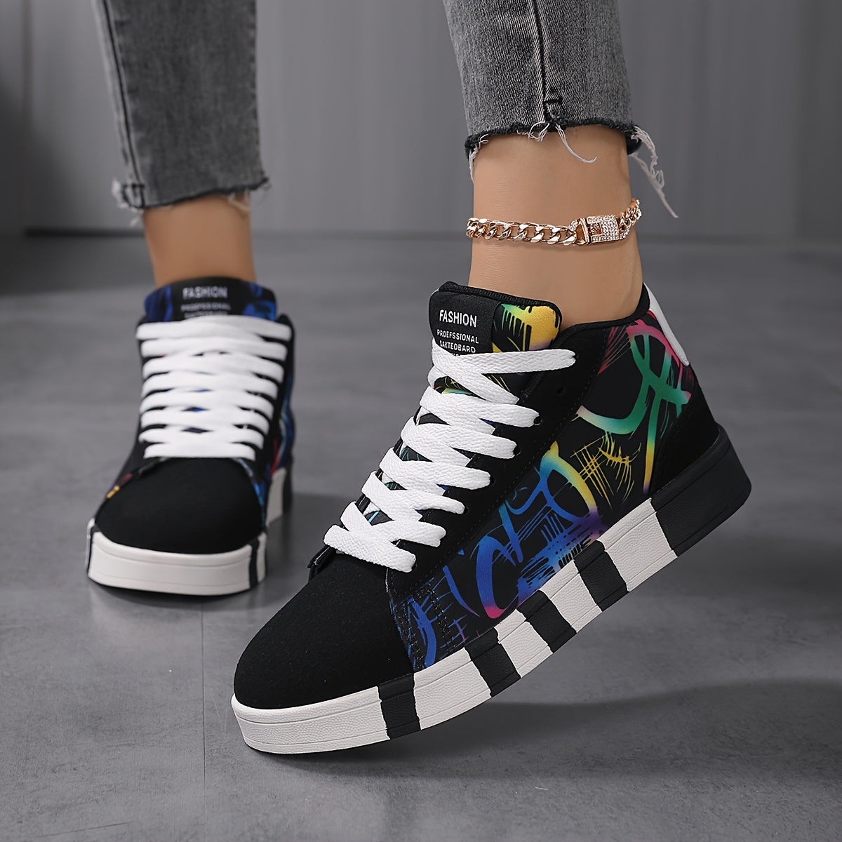Women'S High-Top Casual Skate Shoes, Black and White Graffiti Design, Lightweight Fabric Lining, All-Season Rubber Sole Sneakers for Outdoor Sports and Hiking, Skate Shoes