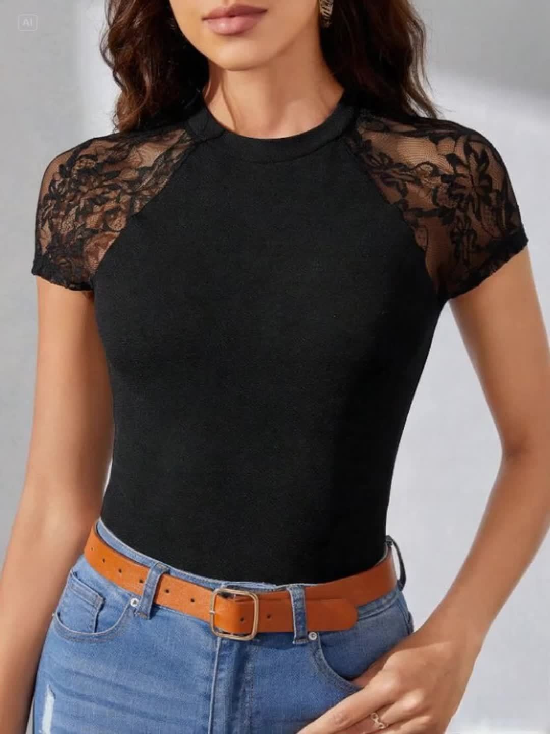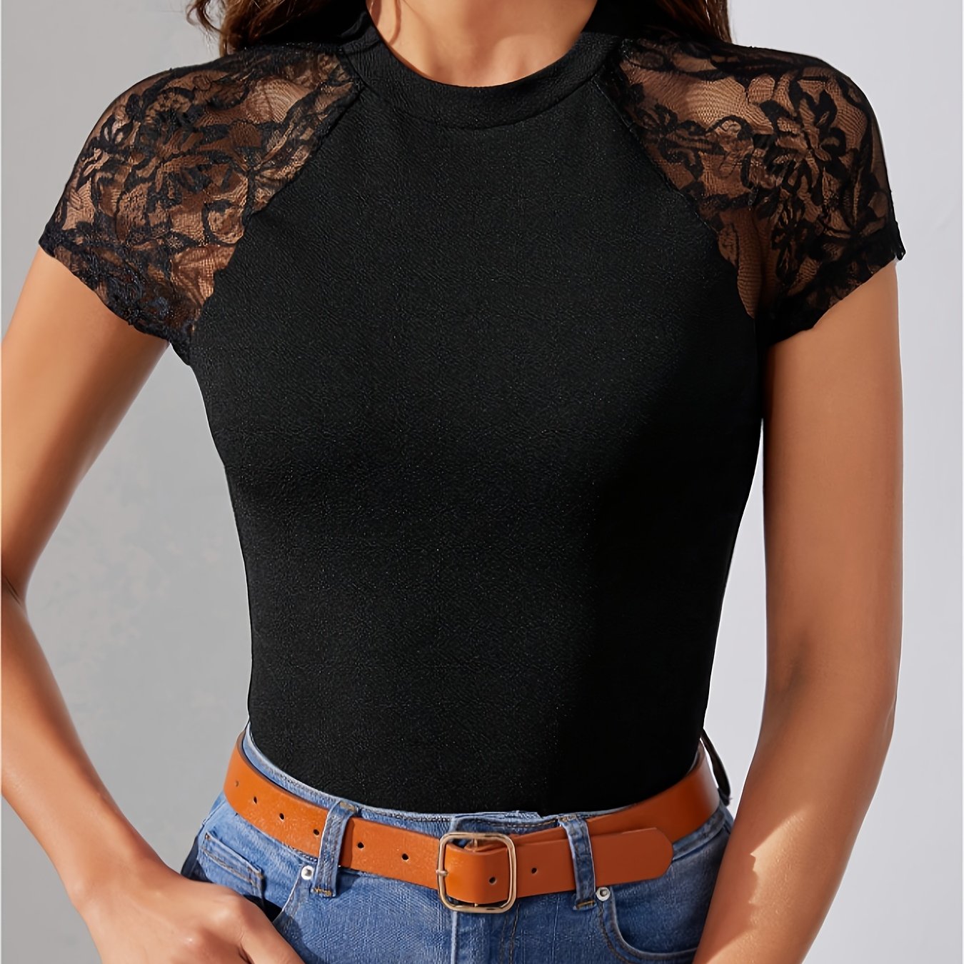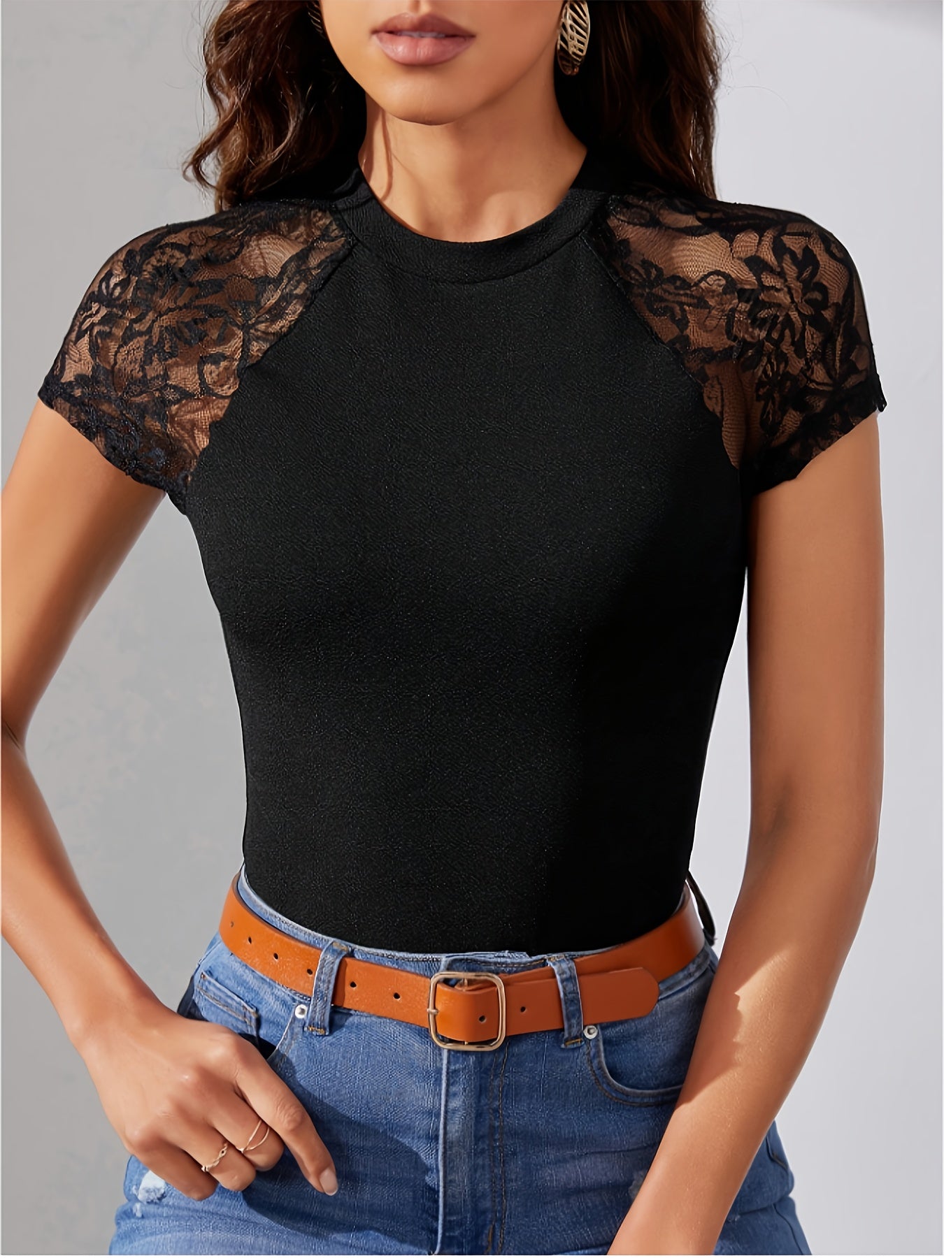 Women's High Waist Slim Fit T-Shirt - Black with Lace Contrast Raglan Sleeves, Stretch Polyester Blend, Breathable & Machine Washable, Elegant Casual Daily Wear Top, Versatile Clothing, Stylish Blouse, Soft Texture, Fitted Bl