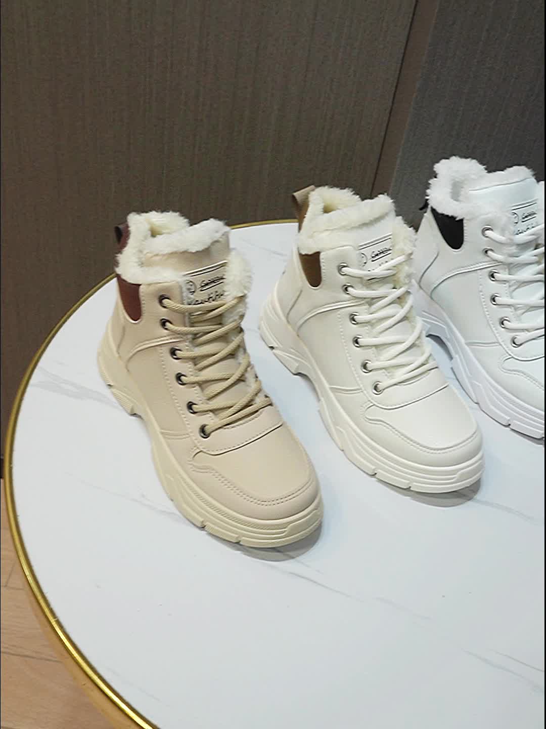 Women's Insulated Winter Boots with Plush Collar & Thick Sole - White Faux Cover Round-Toe Lace-Up Ankle Boots, Cushioned Insole & Arch Support, Warm TPU Outsole for Cold Weather, Casual to Semi-Formal Outfits