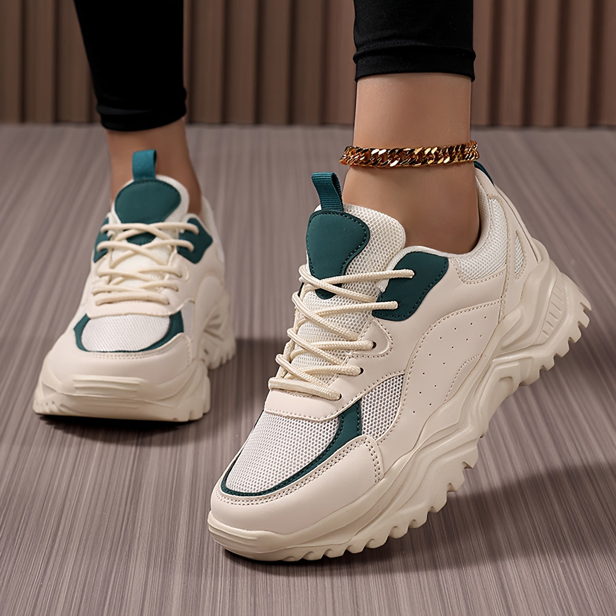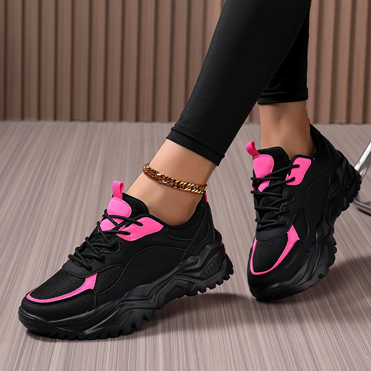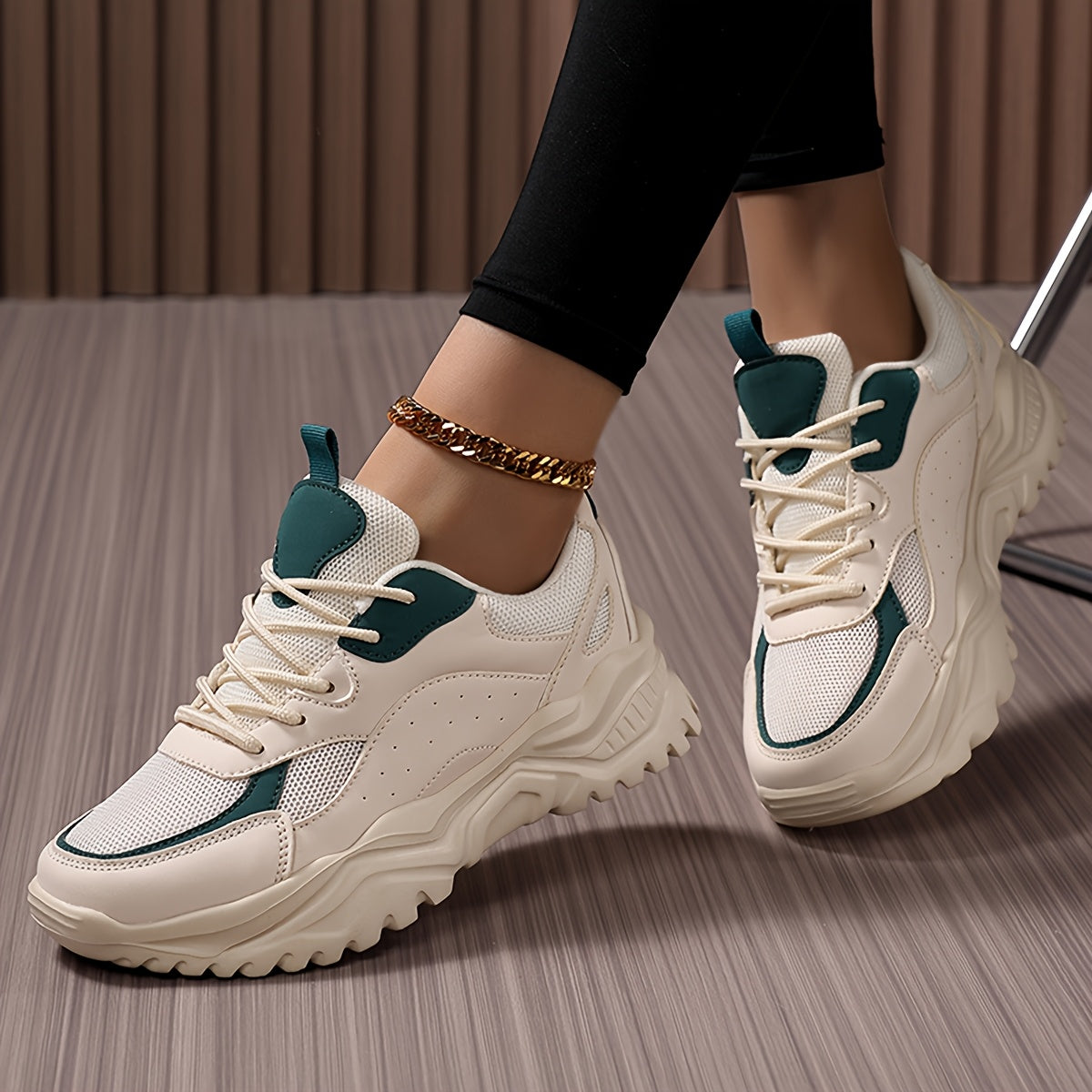 Women's Lightweight Chunky Sneakers - Versatile Korean Style Dad Shoes with Thick Sole, Breathable Mesh Upper, Casual Lace-Up Athletic Footwear in White, Green/White, and Black/Pink