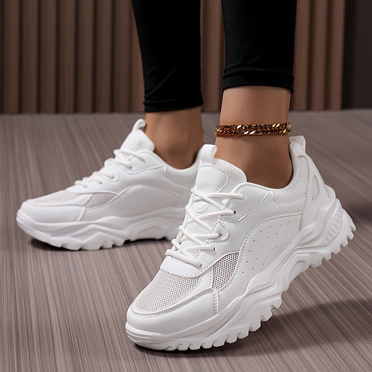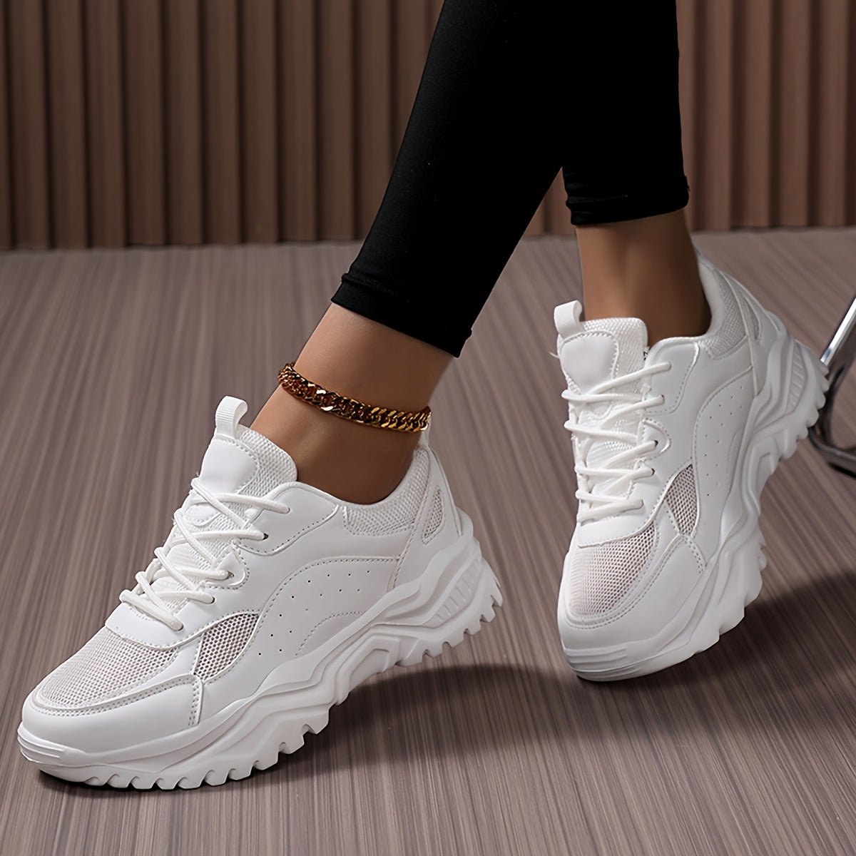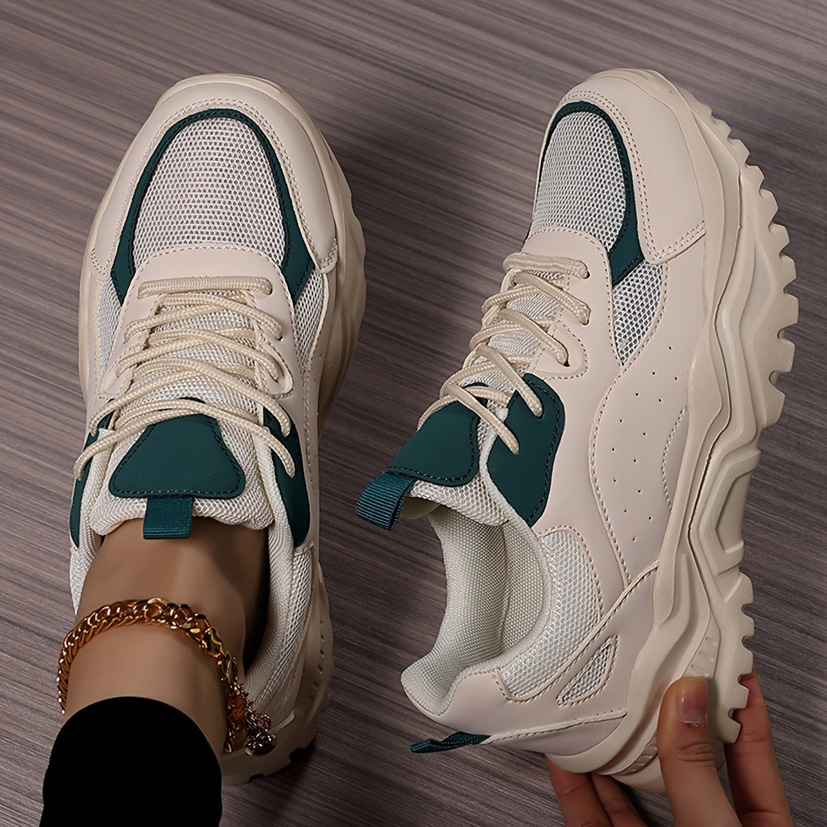 Women's Lightweight Chunky Sneakers - Versatile Korean Style Dad Shoes with Thick Sole, Breathable Mesh Upper, Casual Lace-Up Athletic Footwear in White, Green/White, and Black/Pink