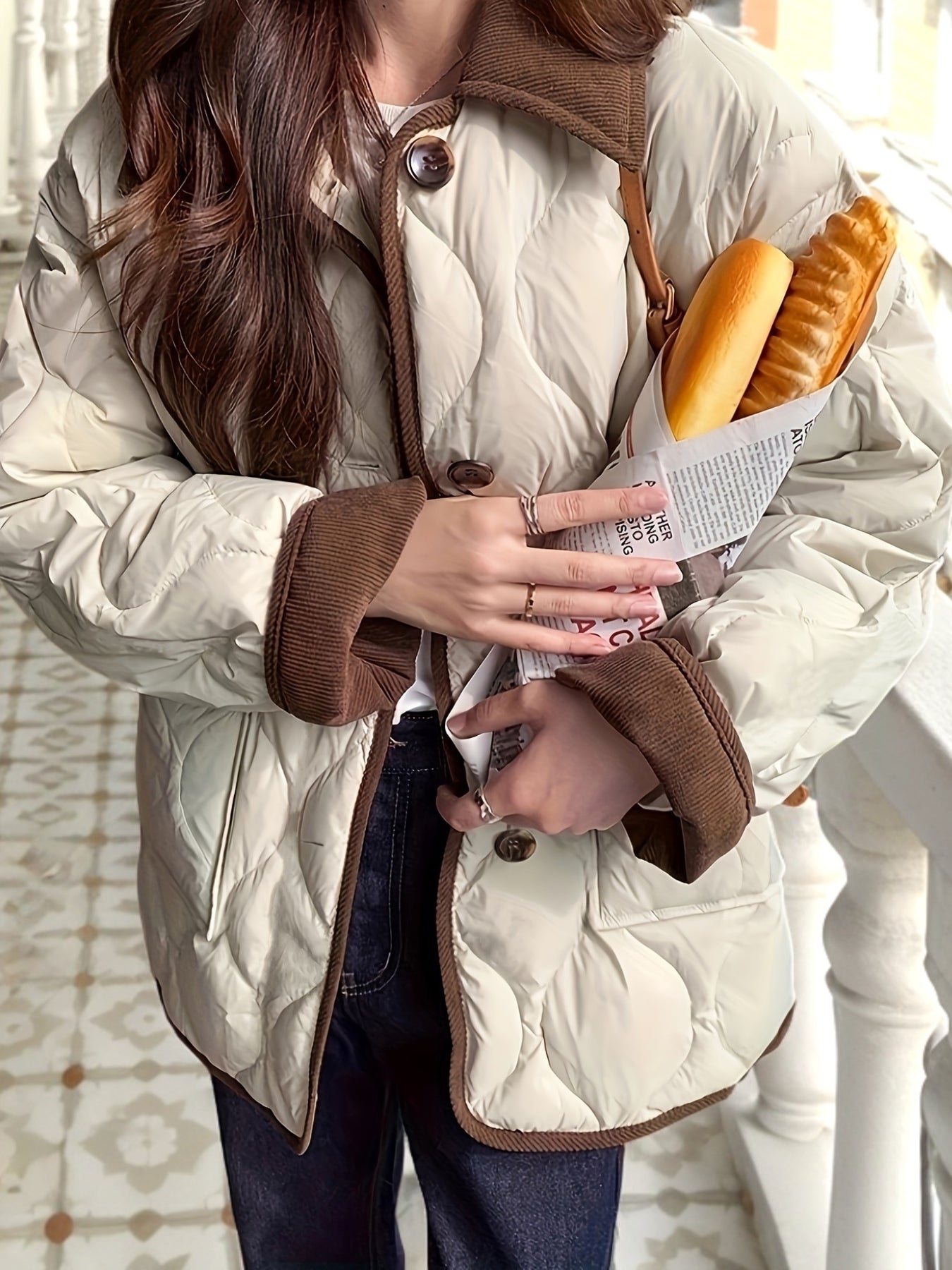 Women's Navy Blue Quilted Jacket with Faux Fur Trim - Elegant Long Sleeve Outerwear, Polyester, Button-Up Front, Warm & Stylish for Winter