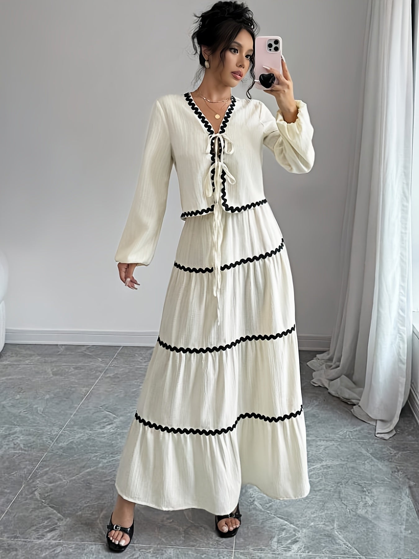 Women'S New Arrival Black and White Ruffled Lace Trim Long Sleeve Shirt with Tie Waist Umbrella Skirt Set, Stylish Elegant Vacation Commute Daily Wear Date Party Two-Piece Outfit Suitable for All Seasons