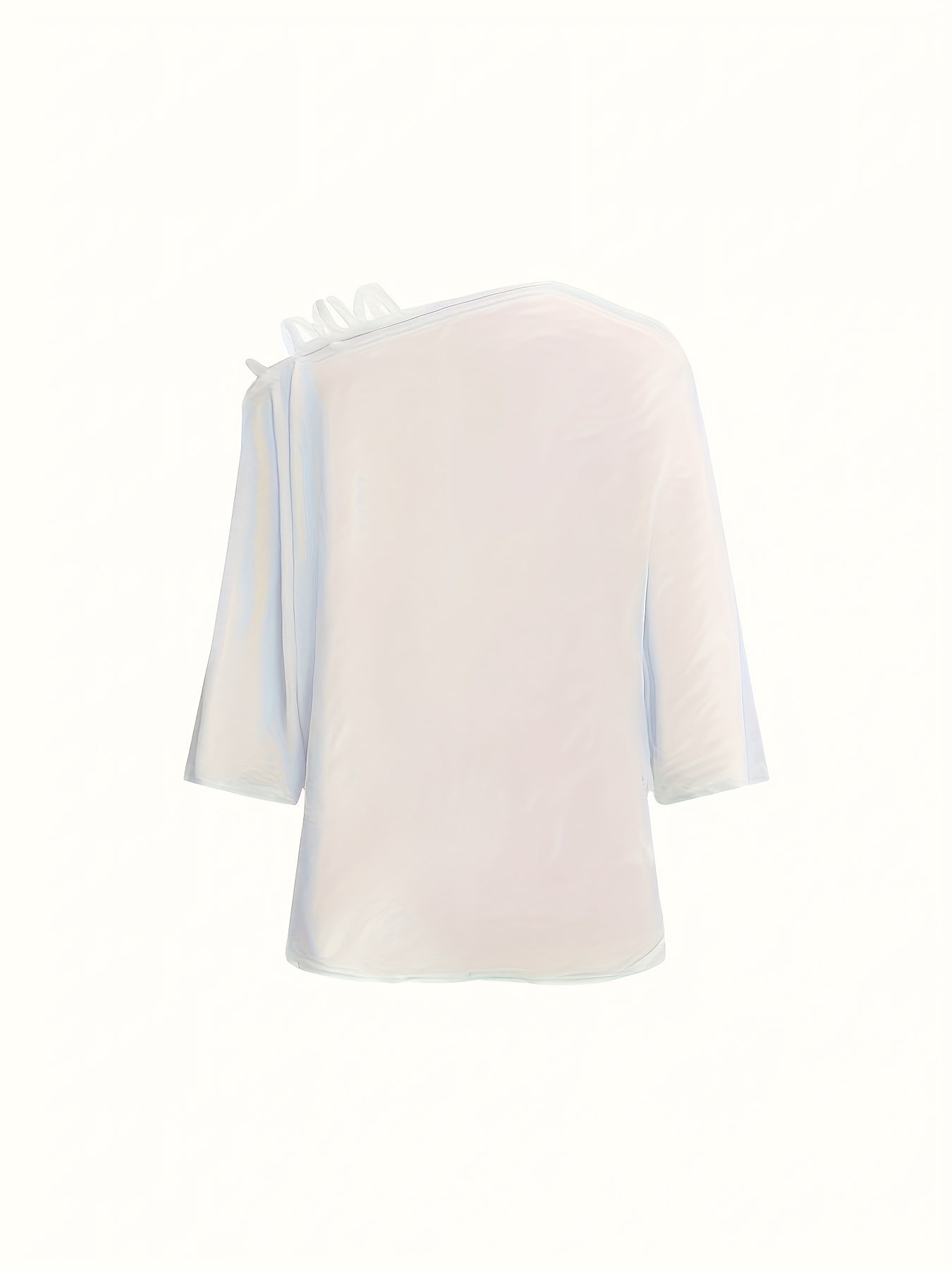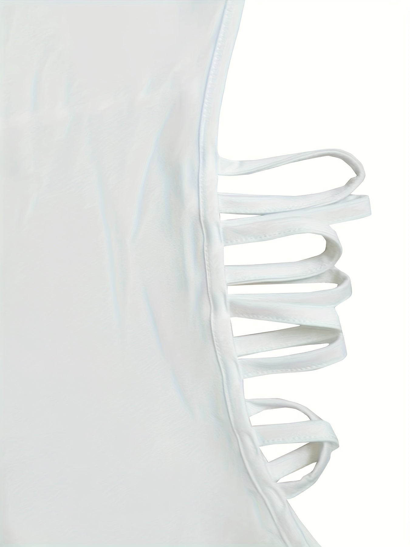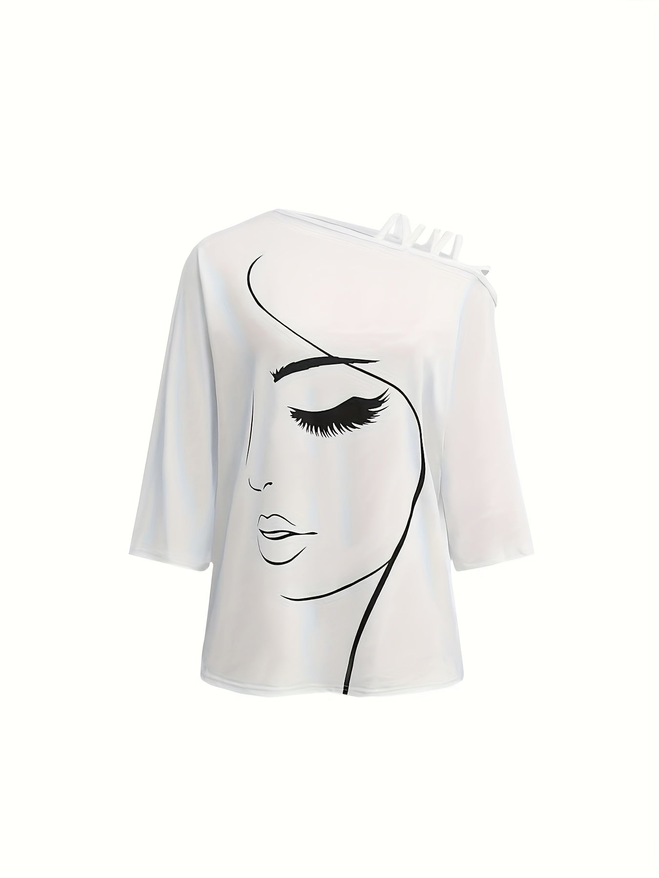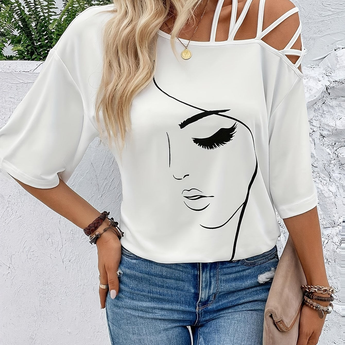 Women's Off-Shoulder Graphic Tee - Stretchy Polyester Blend, Short Sleeve, Cross-Strap Detail, Elegant Face Line Art Print, Casual Vacation Style, Machine Washable