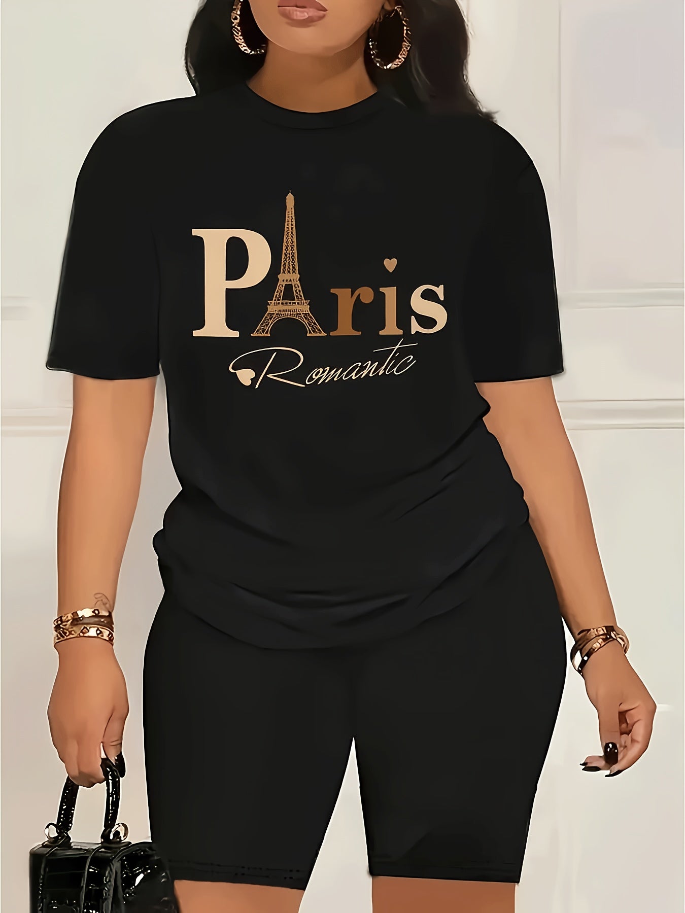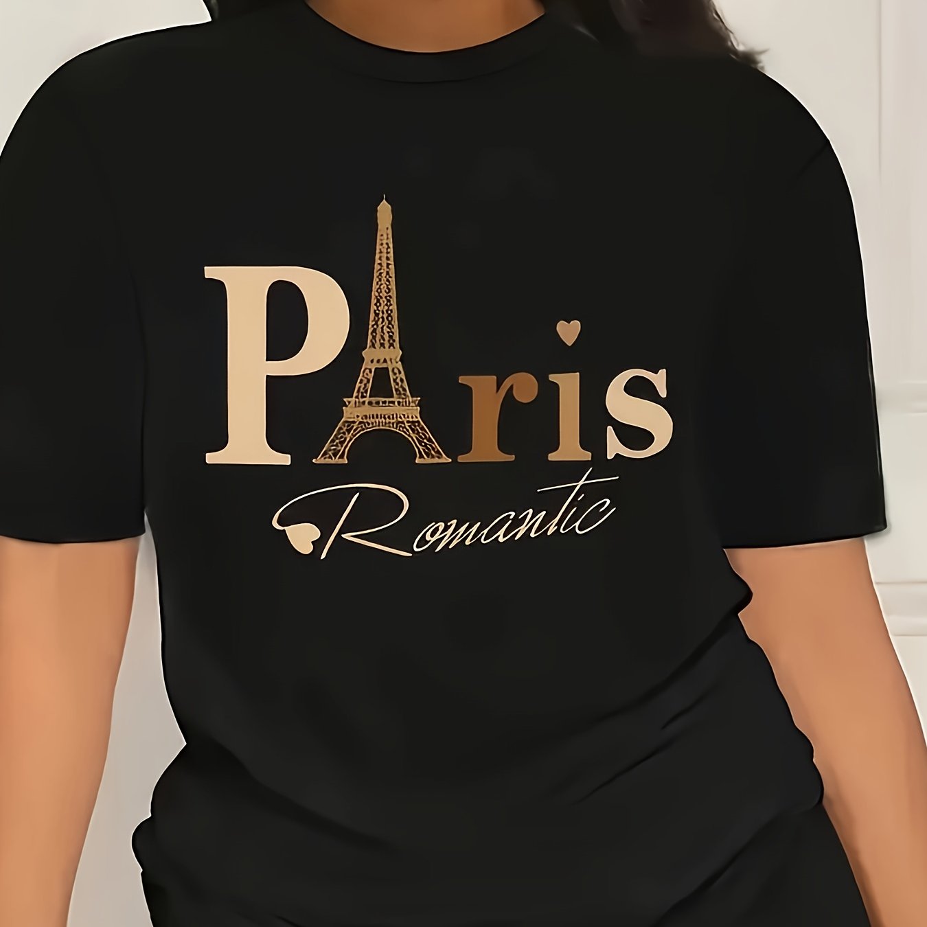 Women's Paris Romantic Graphic Print T-Shirt - Black & Golden Eiffel Tower Design, Short Sleeve Crew Neck Casual Top, Breathable Summer & Spring Tee, Machine Washable, Everyday Fashion, Fashionable Casualwear, Relaxed Fit Shi