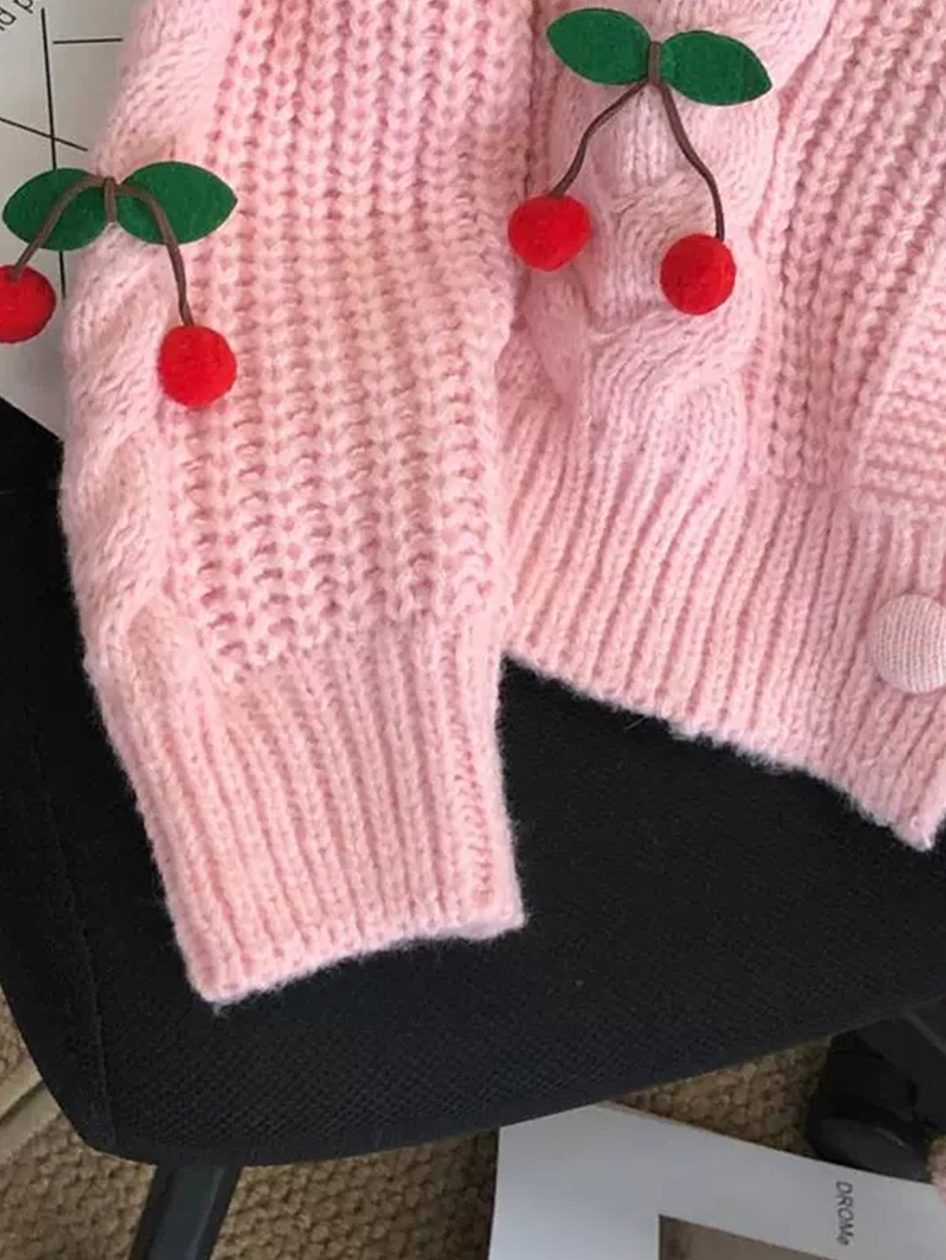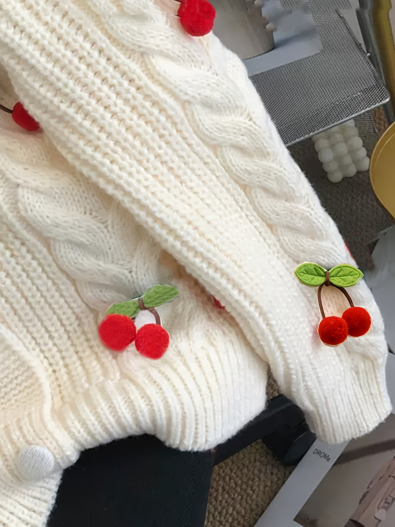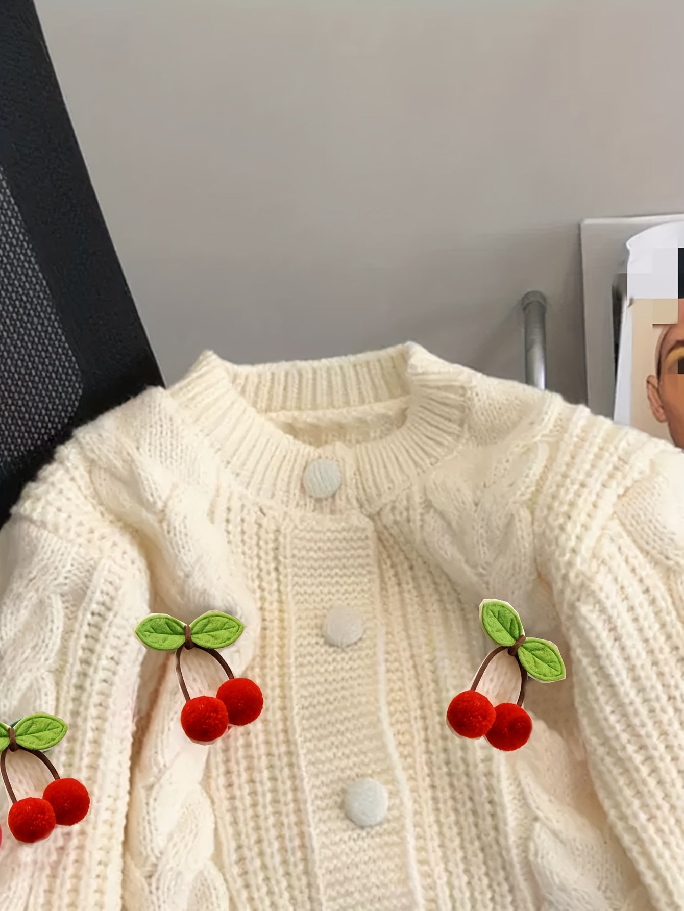 Women'S Purple Cable Cardigan with Cherry & Leaf Embellishments - Cozy Button-Up Sweater for Fall & Winter, Soft & Stylish Design, Perfect for Casual or Holiday Outfits, Winter Cardigan | Cable Cardigan | Buttoned Closure, Sw