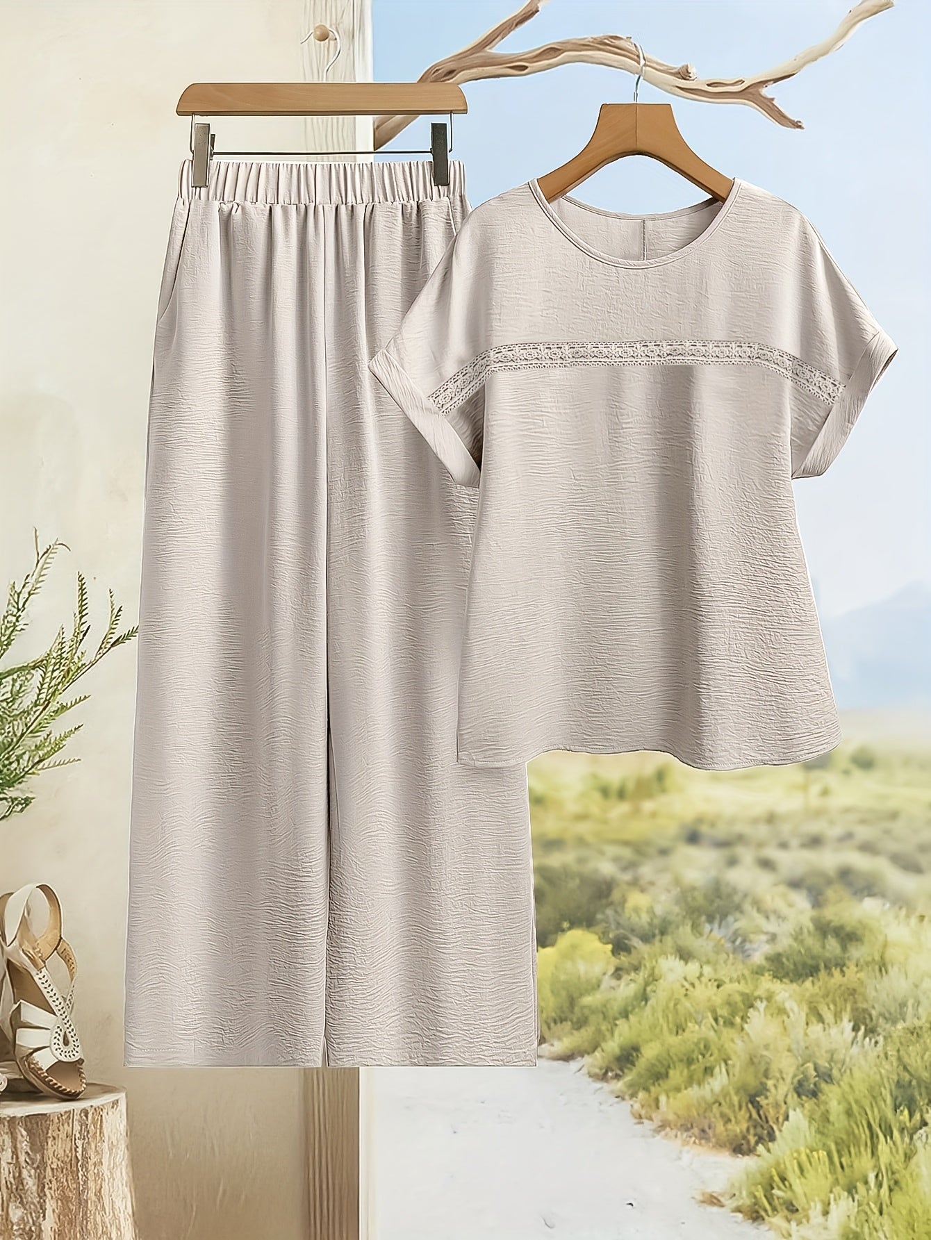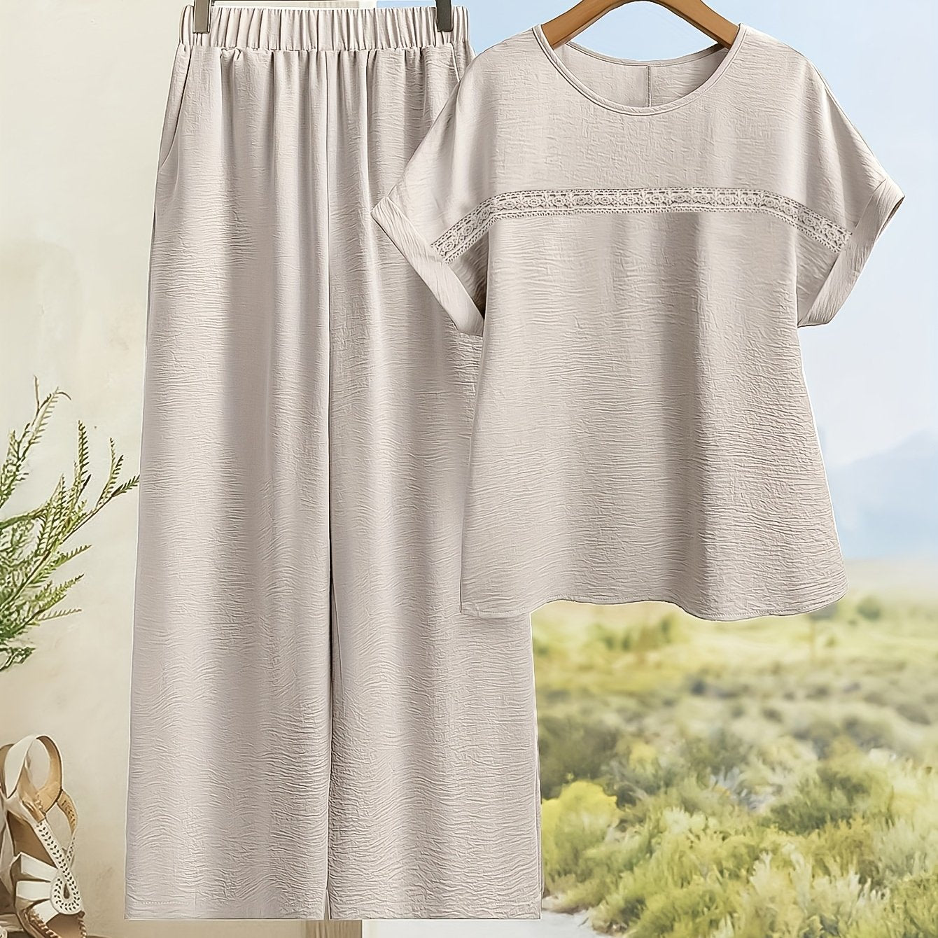 Women's Solid Color Contrast Lace Short Sleeve Top and Wide Leg Pants Casual Two-Piece Set