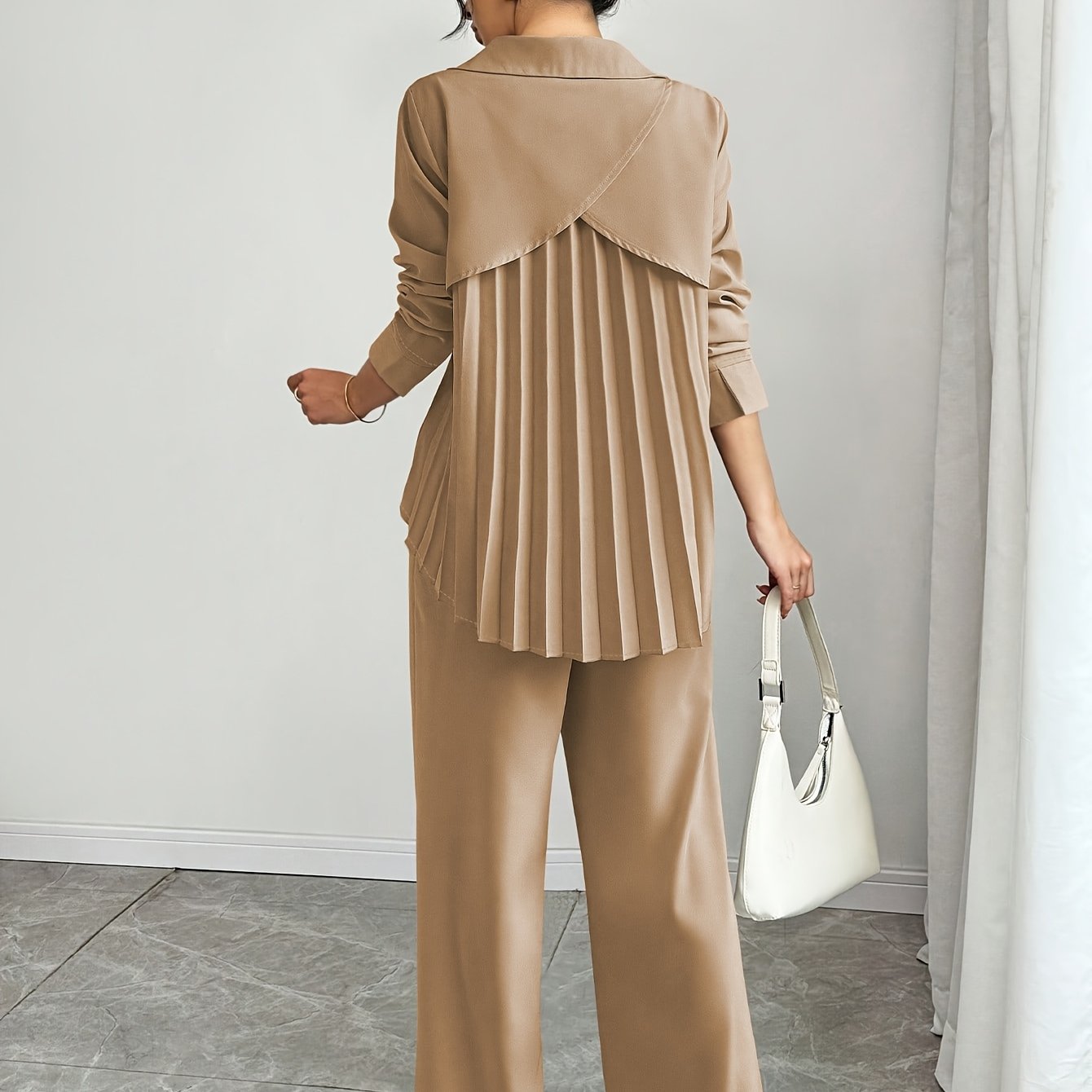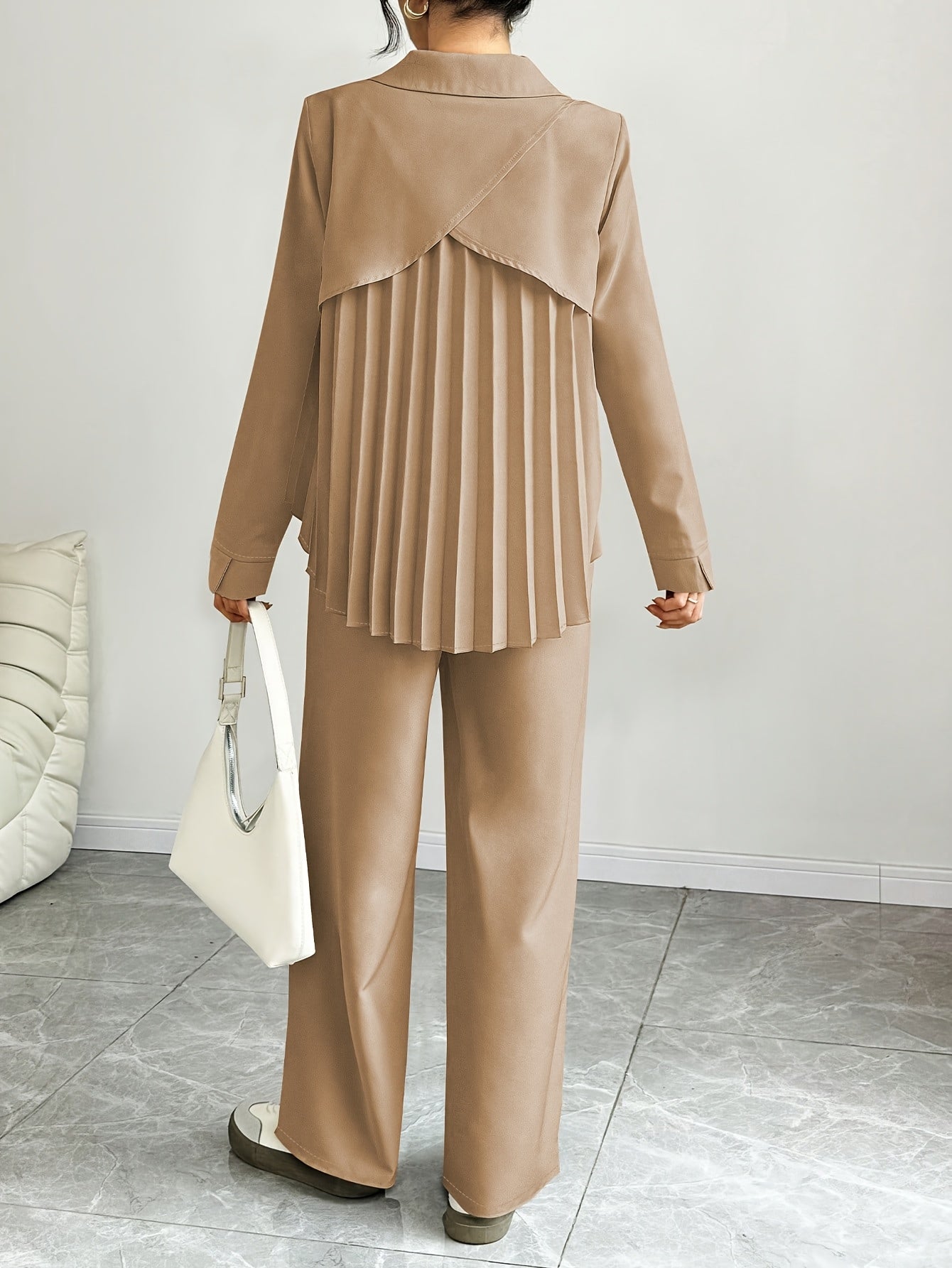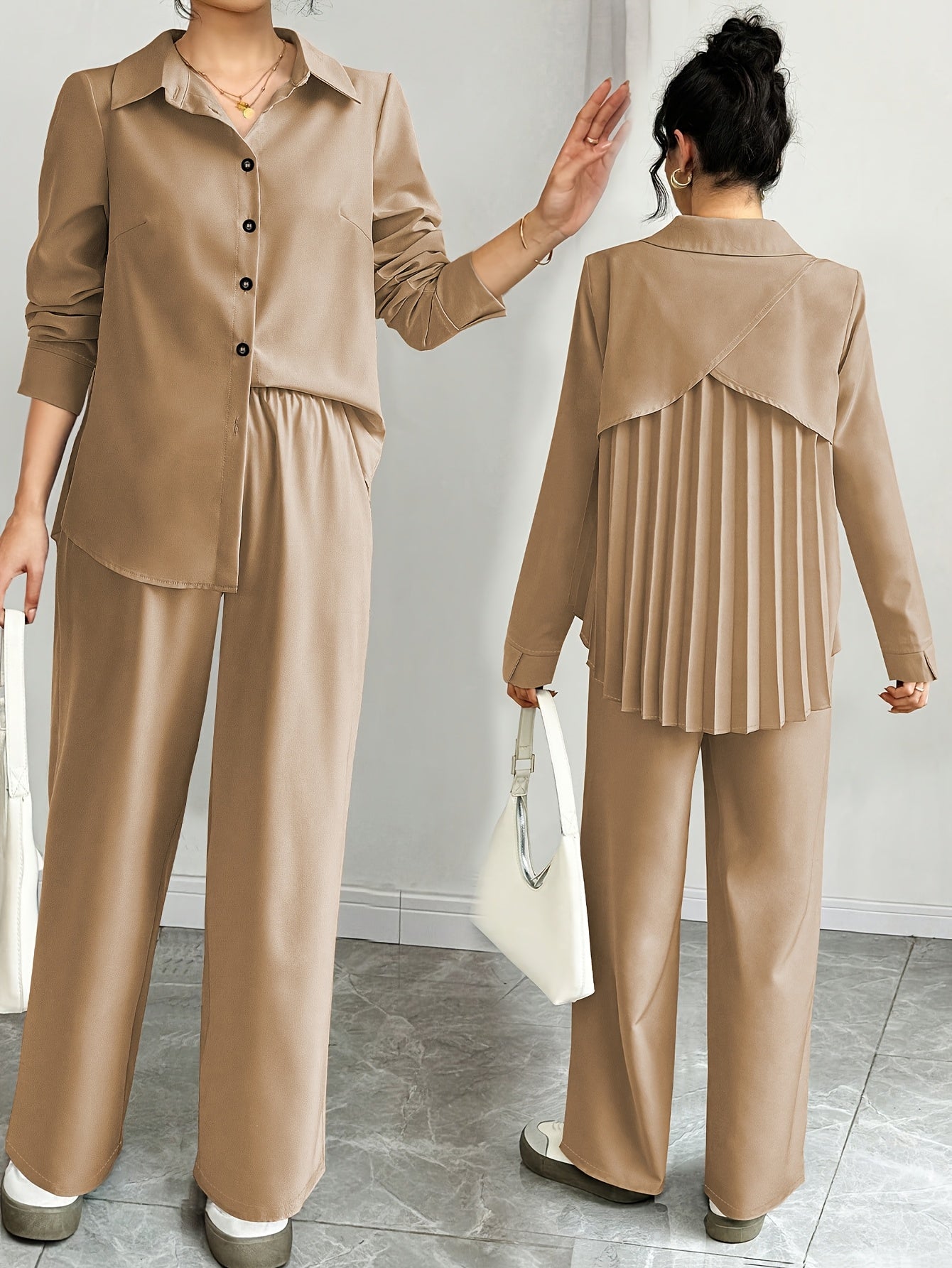 Women's Solid Color Pleated Long Sleeve Shirt + Pants Set for Spring and Autumn