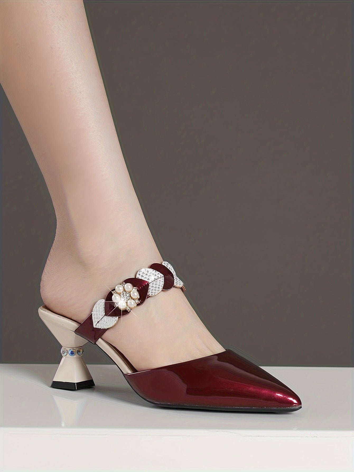 Women's Solid Color Trendy Sandals, Slip On Faux Pearl Buckle Belt Comfy Chunky Heel Shoes, Lightweight Point Toe Dress Shoes