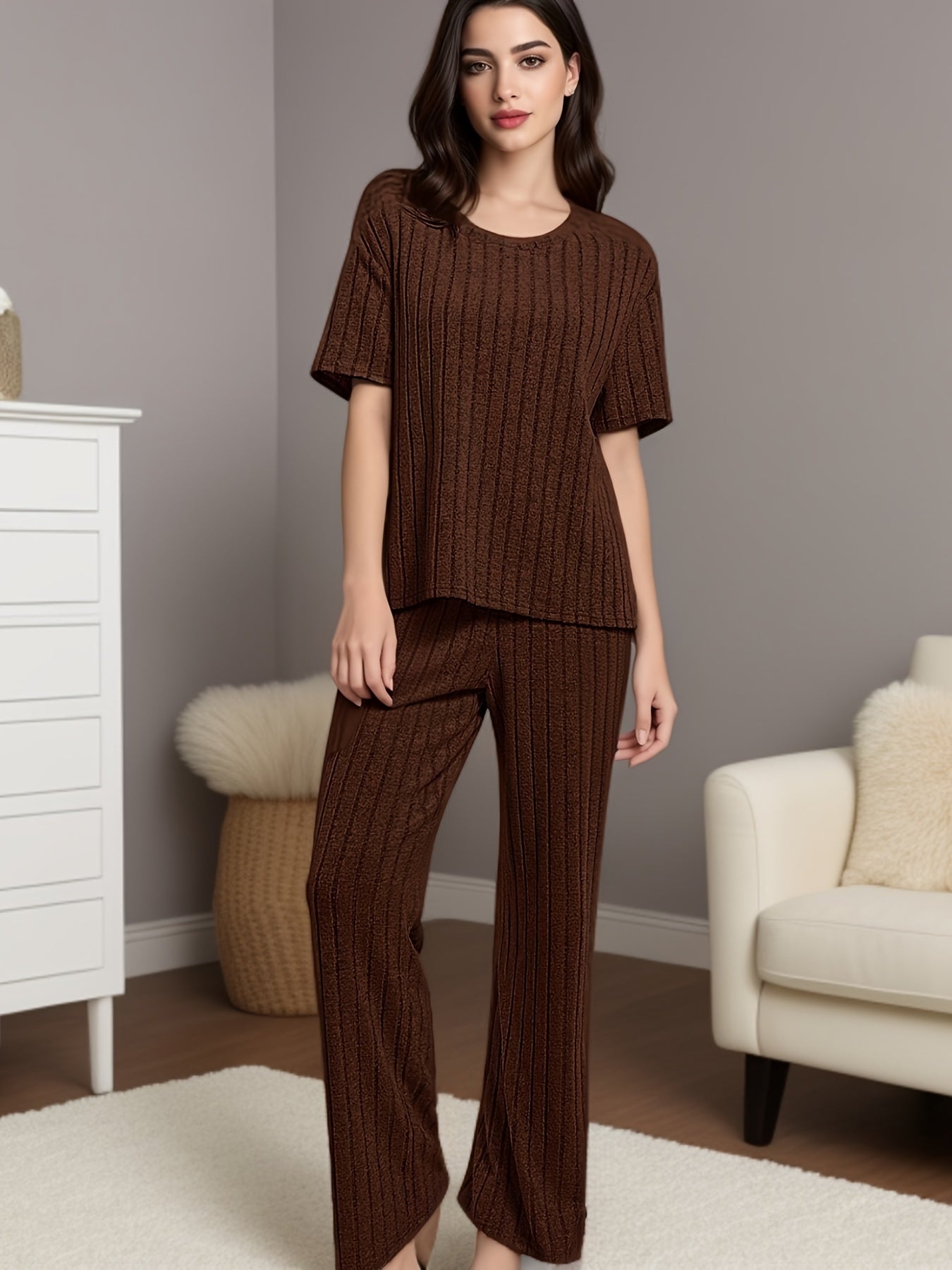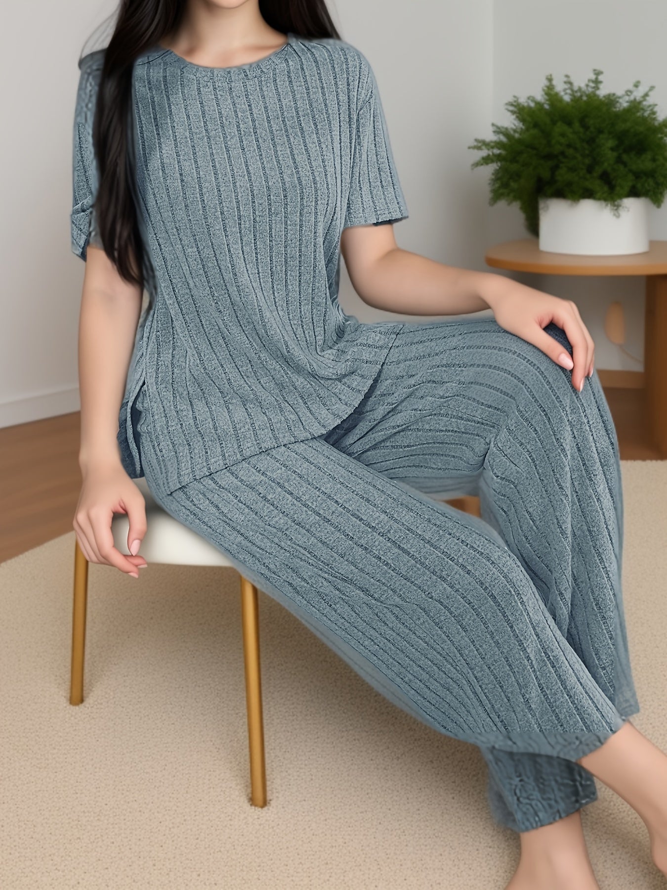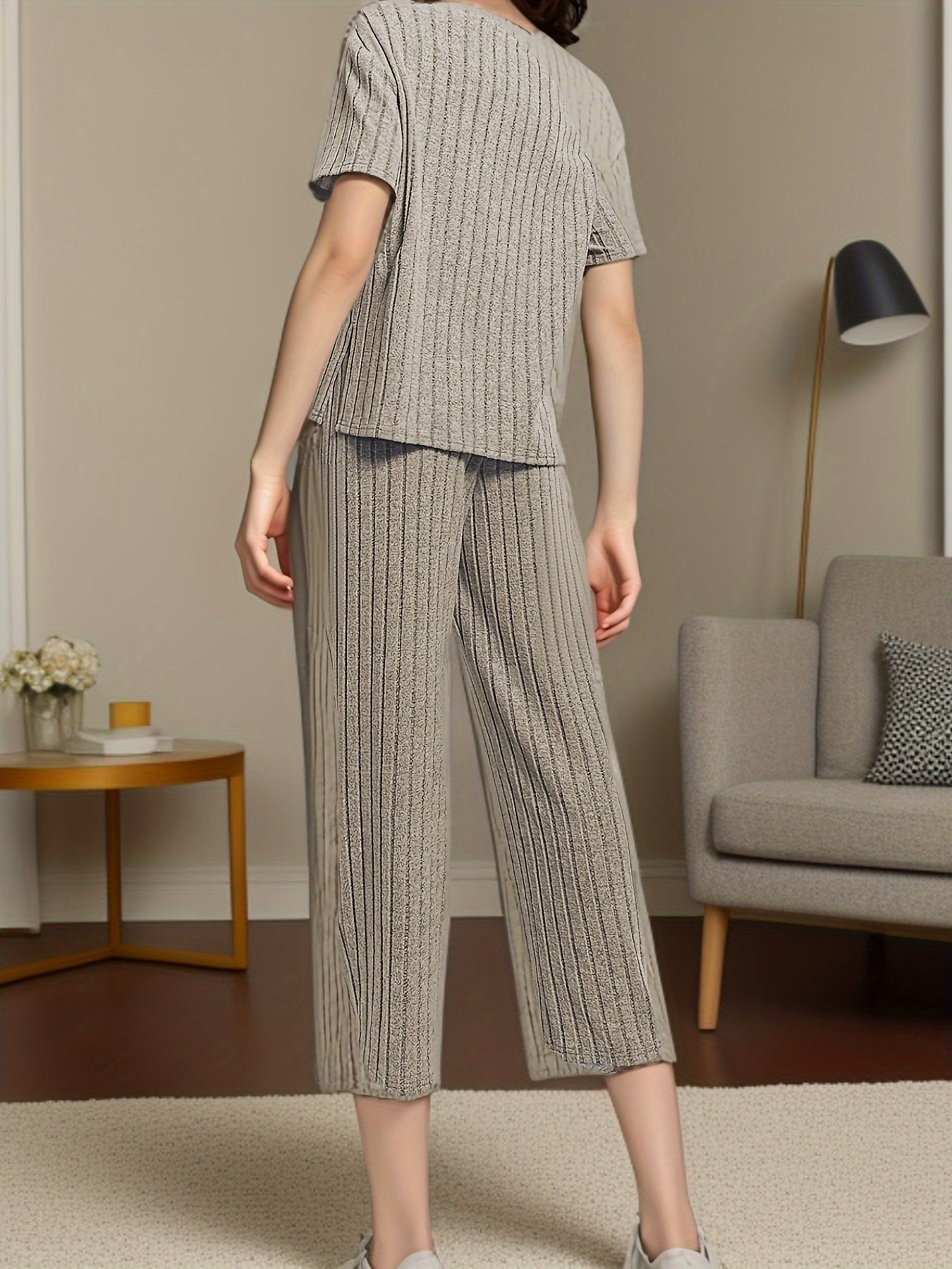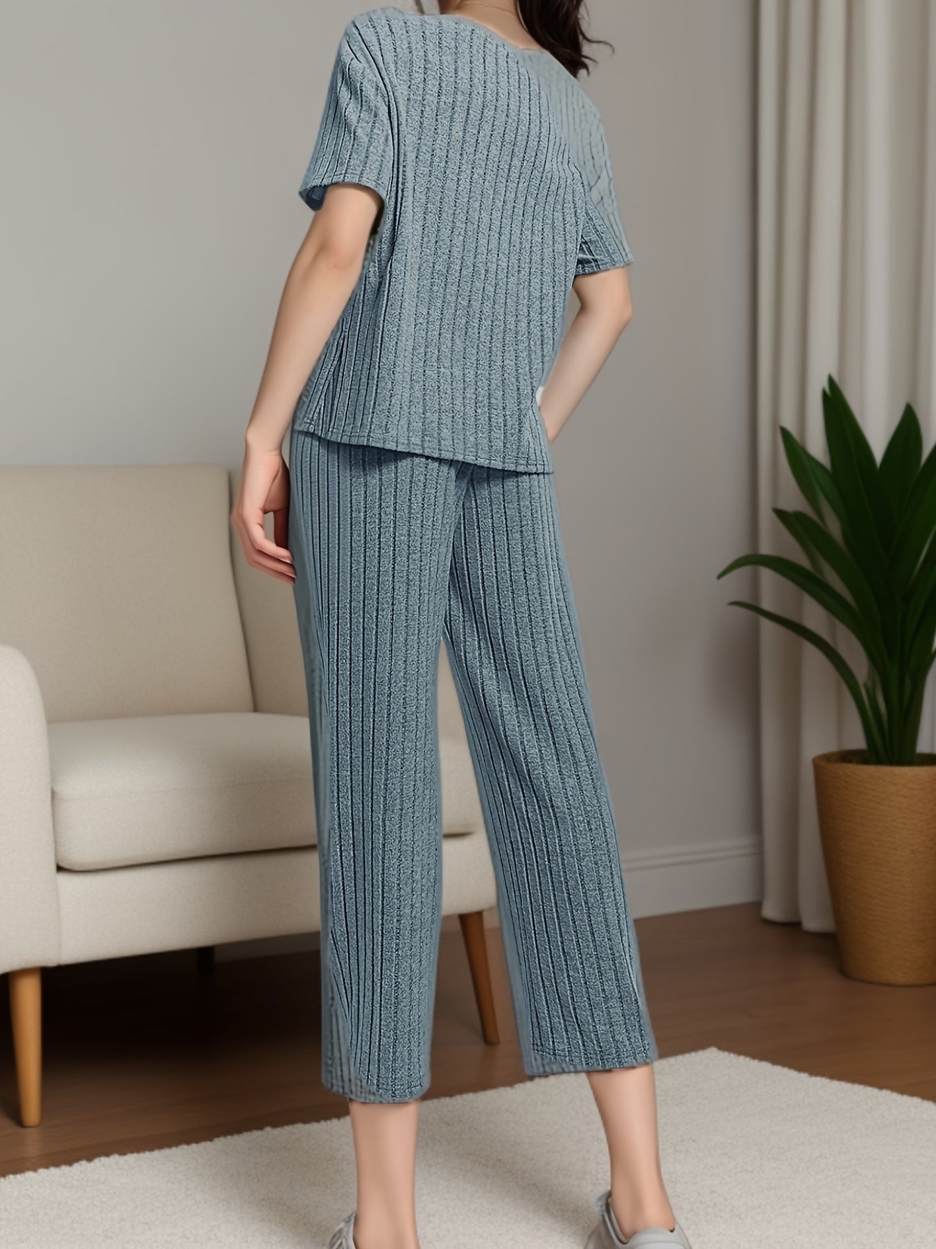 Women's Solid Ribbed Elegant Loose Fit Lounge Set, Short Sleeve Round Neck Top & Pants, Comfortable Relaxed Fit